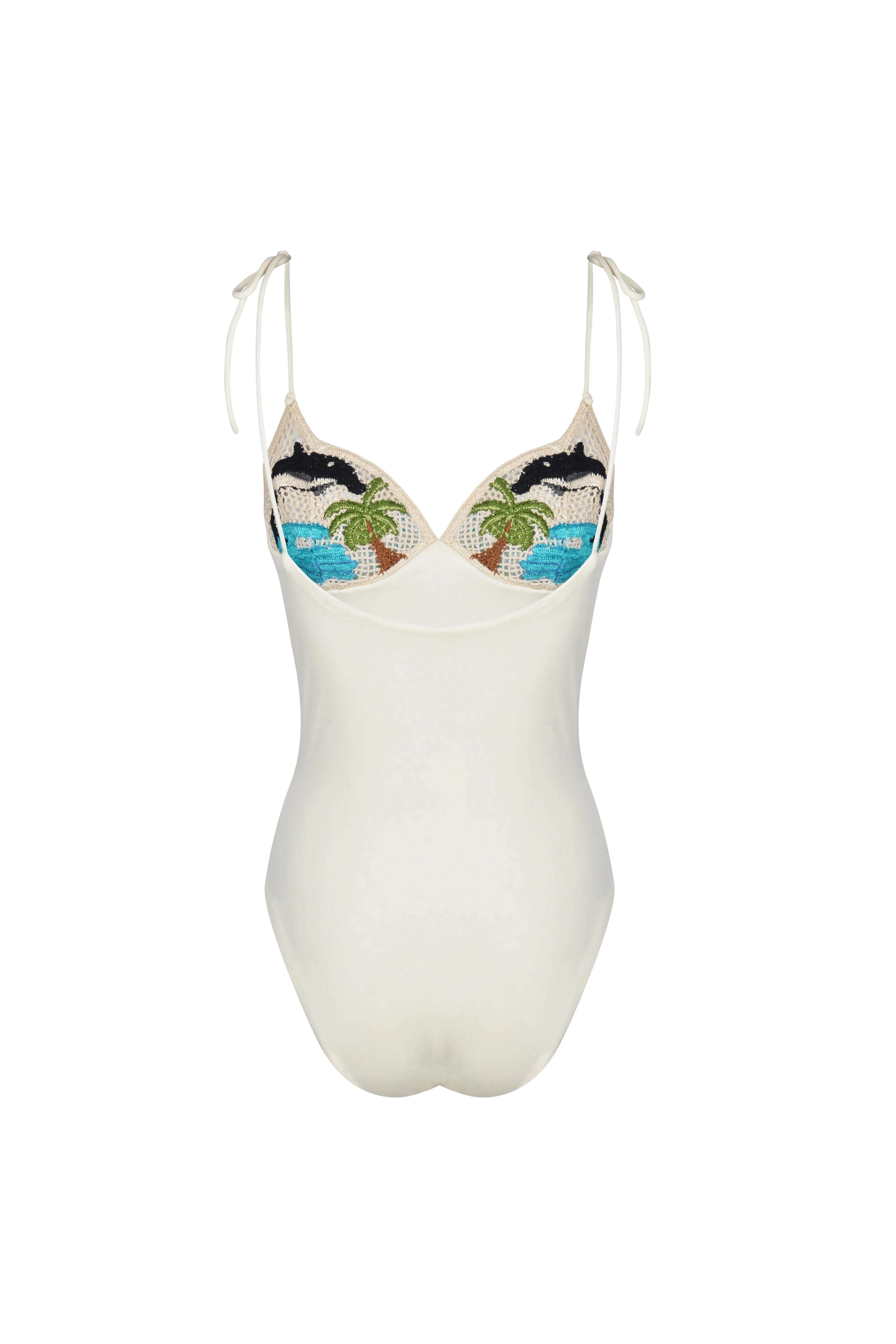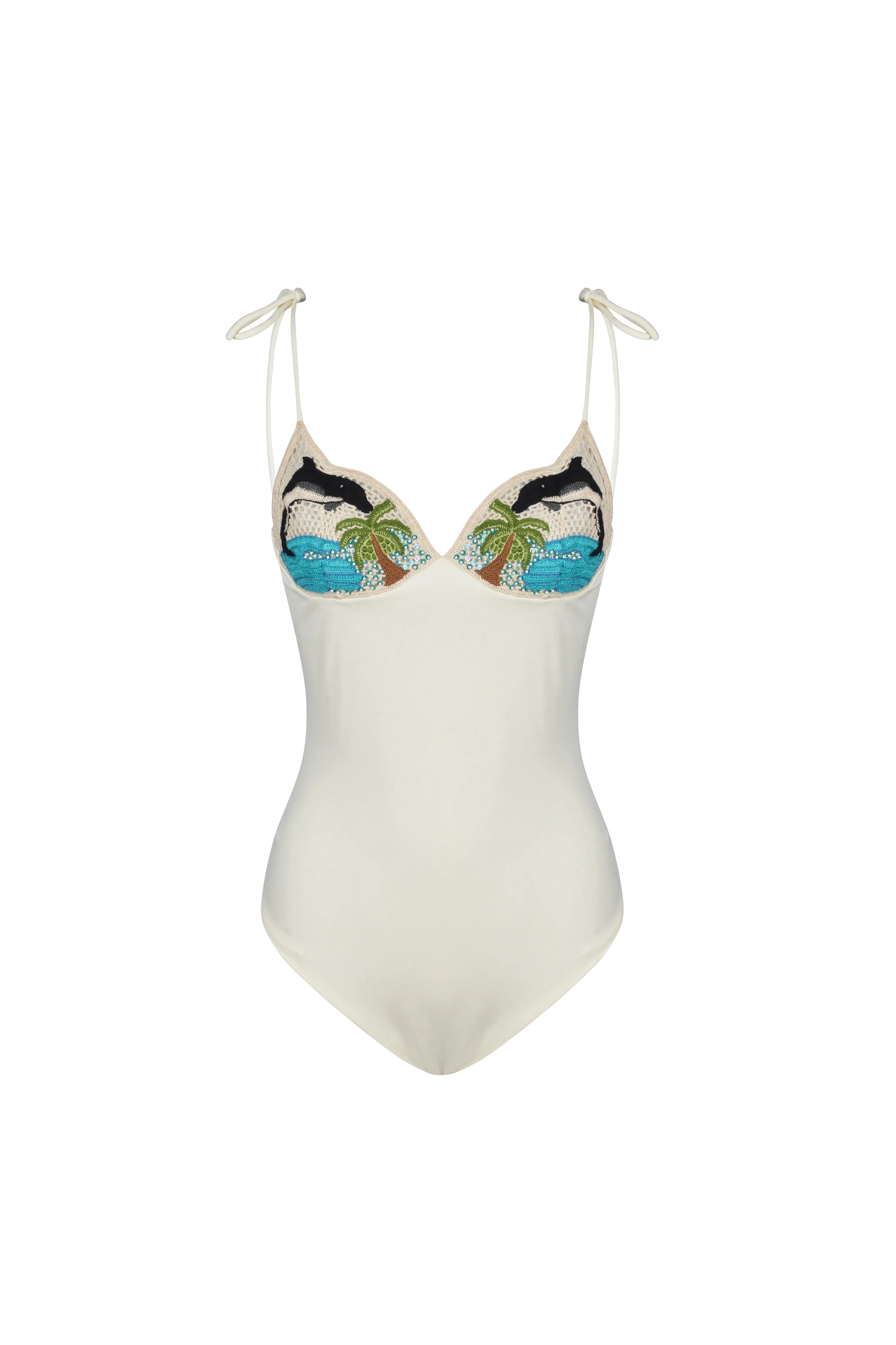 The Dolphin palm swimsuit combines artistry and elegance, showcasing intricate hand-beaded detailing as well as crochet, that captures the serene beauty of ocean elements. Featuring a classic low-cut leg, flattering neck, and delicate straps, the swimsuit is finished with a daring low back to enhance its minimalist yet bold appeal. This sophisticated piece that effortlessly transitions from beachside relaxation to evening elegance.