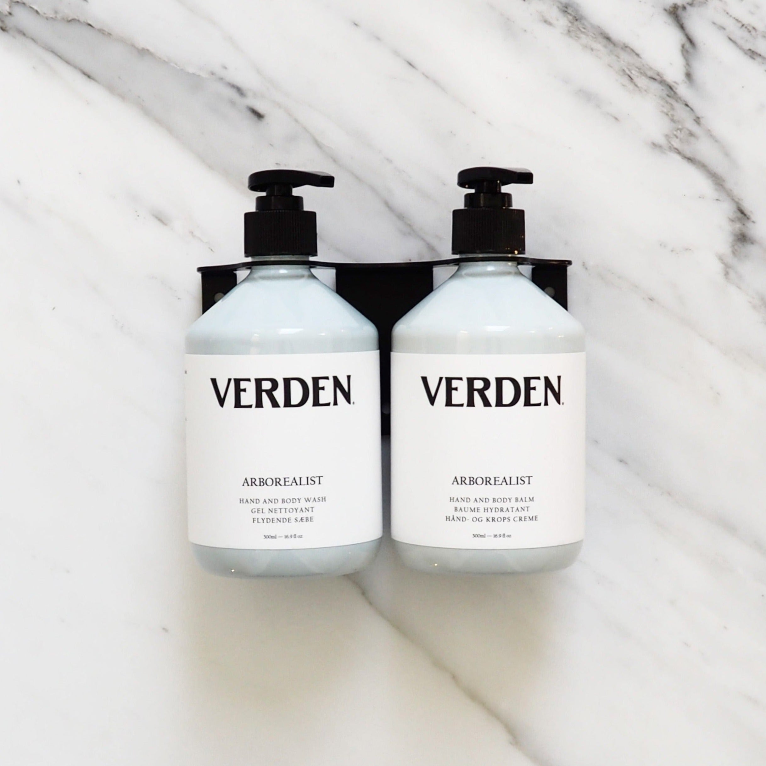 Hanging brackets for hand wash, balm, shampoo and conditioner. Designed to fit standard VERDEN 500ml bottles. Engineered in solid metal with a substantial back plate to ensure a secure attachment to the wall with 3 screw fixings. Available in classic matte black finish.