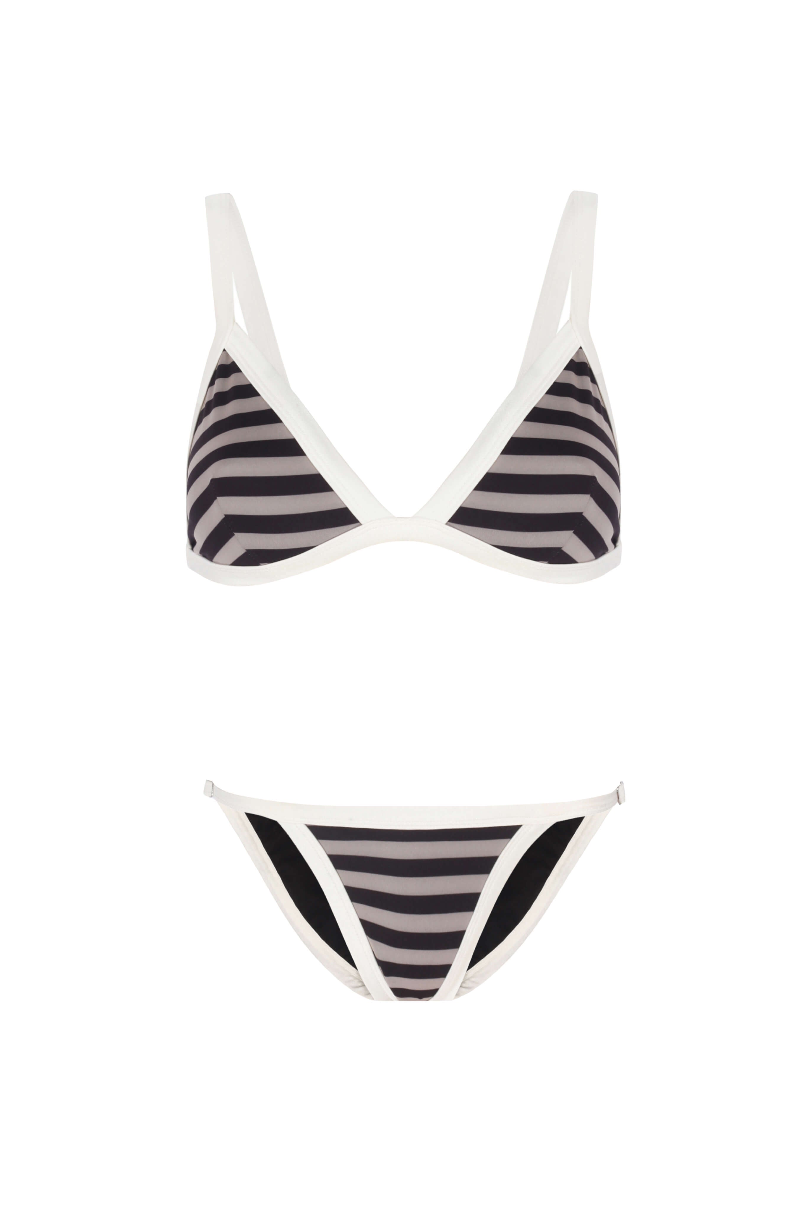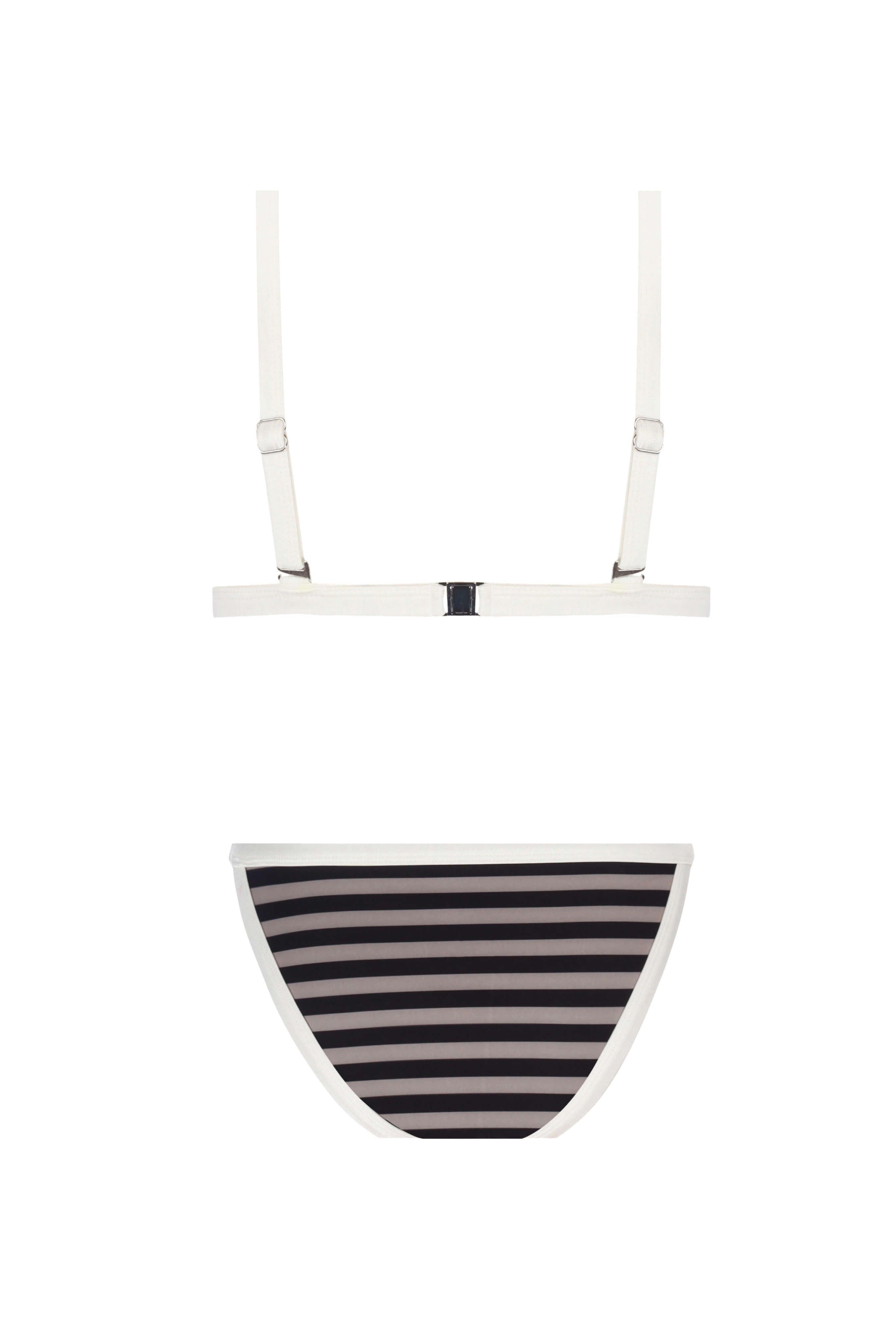 Our new bikini top offers both criss-cross and straight-back options, providing support and shaping. Its stripes are composed of vizon and black colors, made from a tightly knit fabric. We designed this bikini set with A/B cup enthusiasts in mind, aiming for both durability and the refreshing feel of summer.