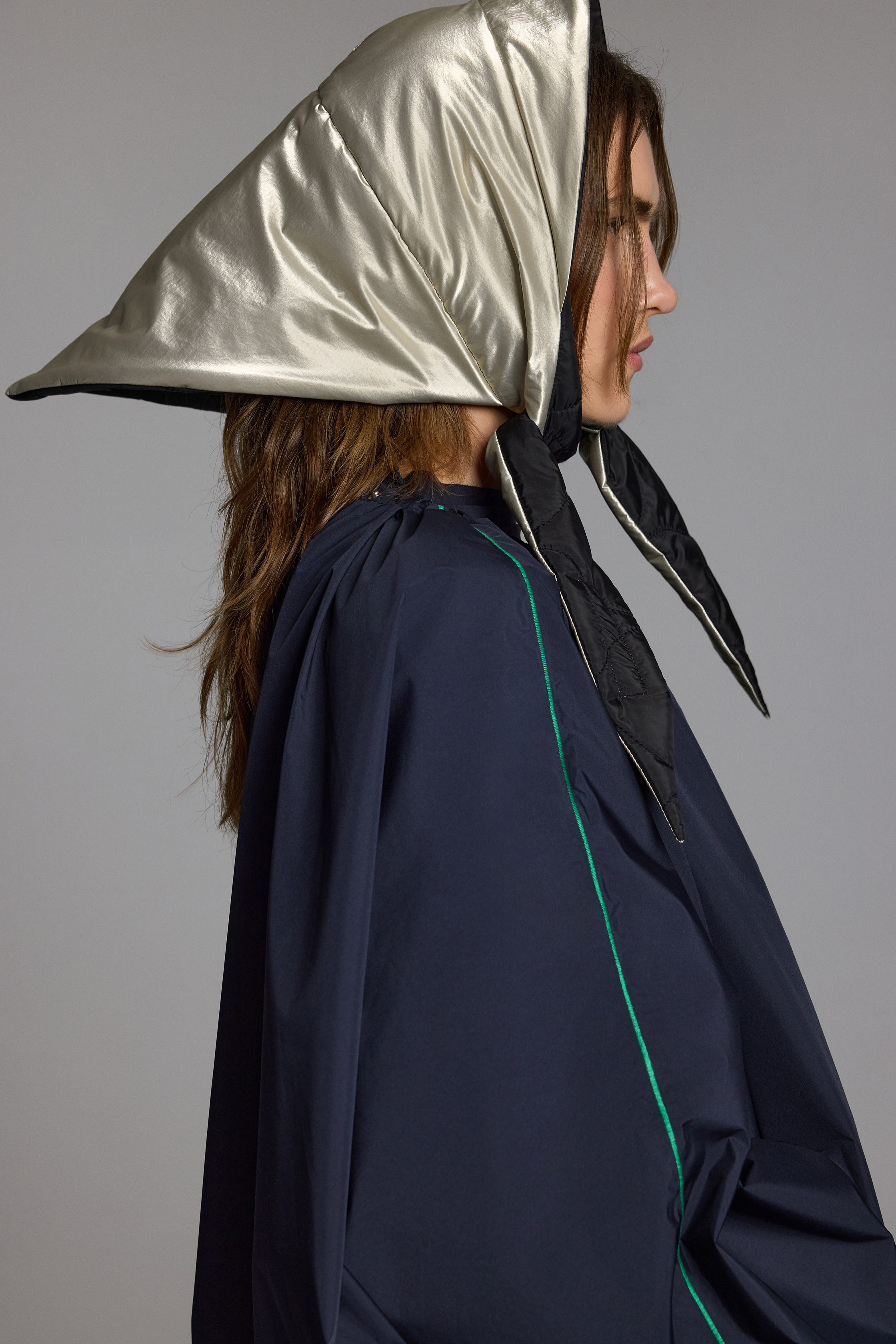 With its functional design, this reversible scarf offers a modern look and stands out as both a protective and stylish piece on cold winter days. The shiny gold outer surface and glossy black inner side create a striking contrast.