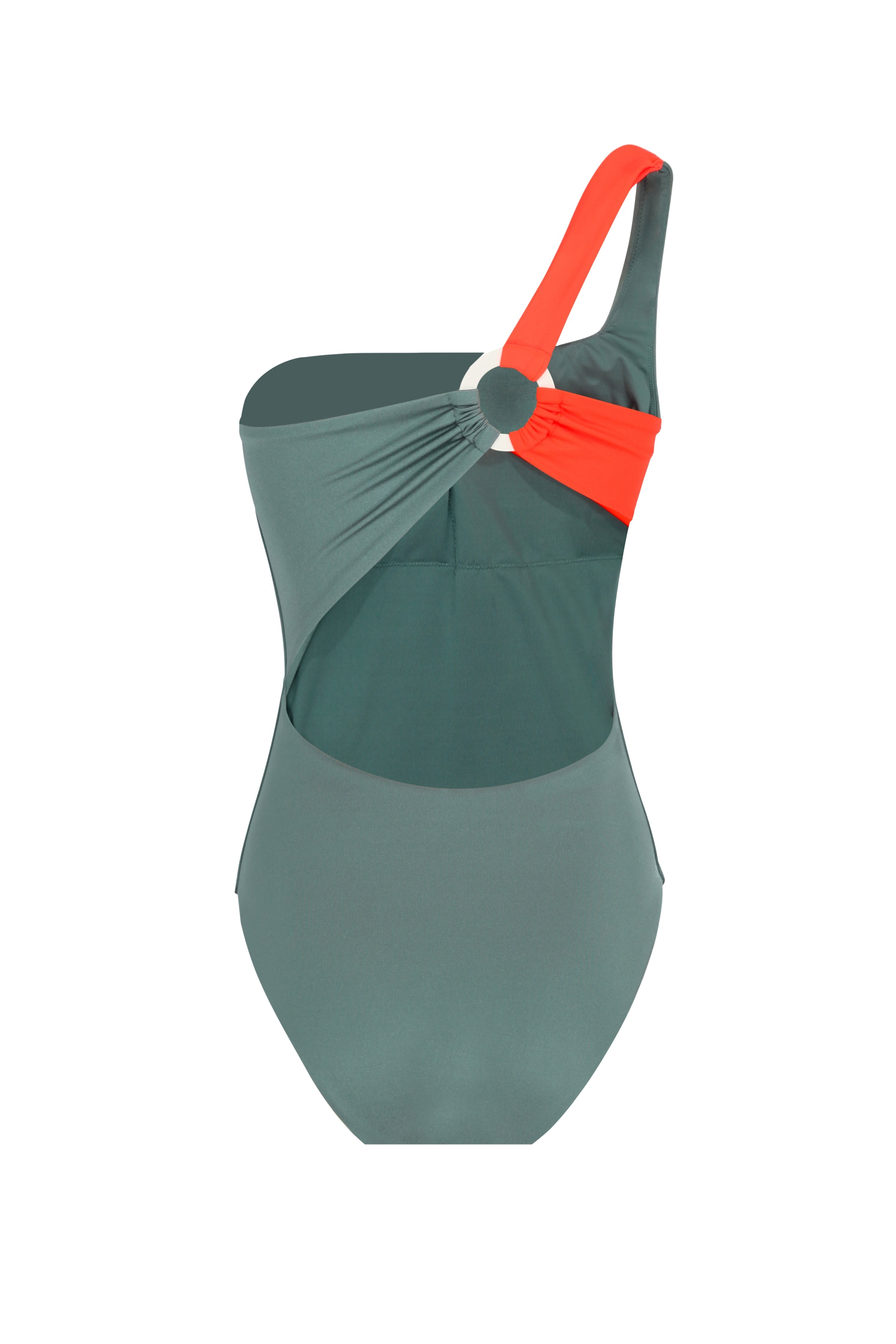 DUNE offers the sportiest version of one-shoulder with its inner-supported chest cut and semi-shiny mother-of-pearl effect fabric. The shoulder fabric is a fluorescent fabric, the brightness of the color appears at sunset. We designed it for those who like our bold and different color combinations.