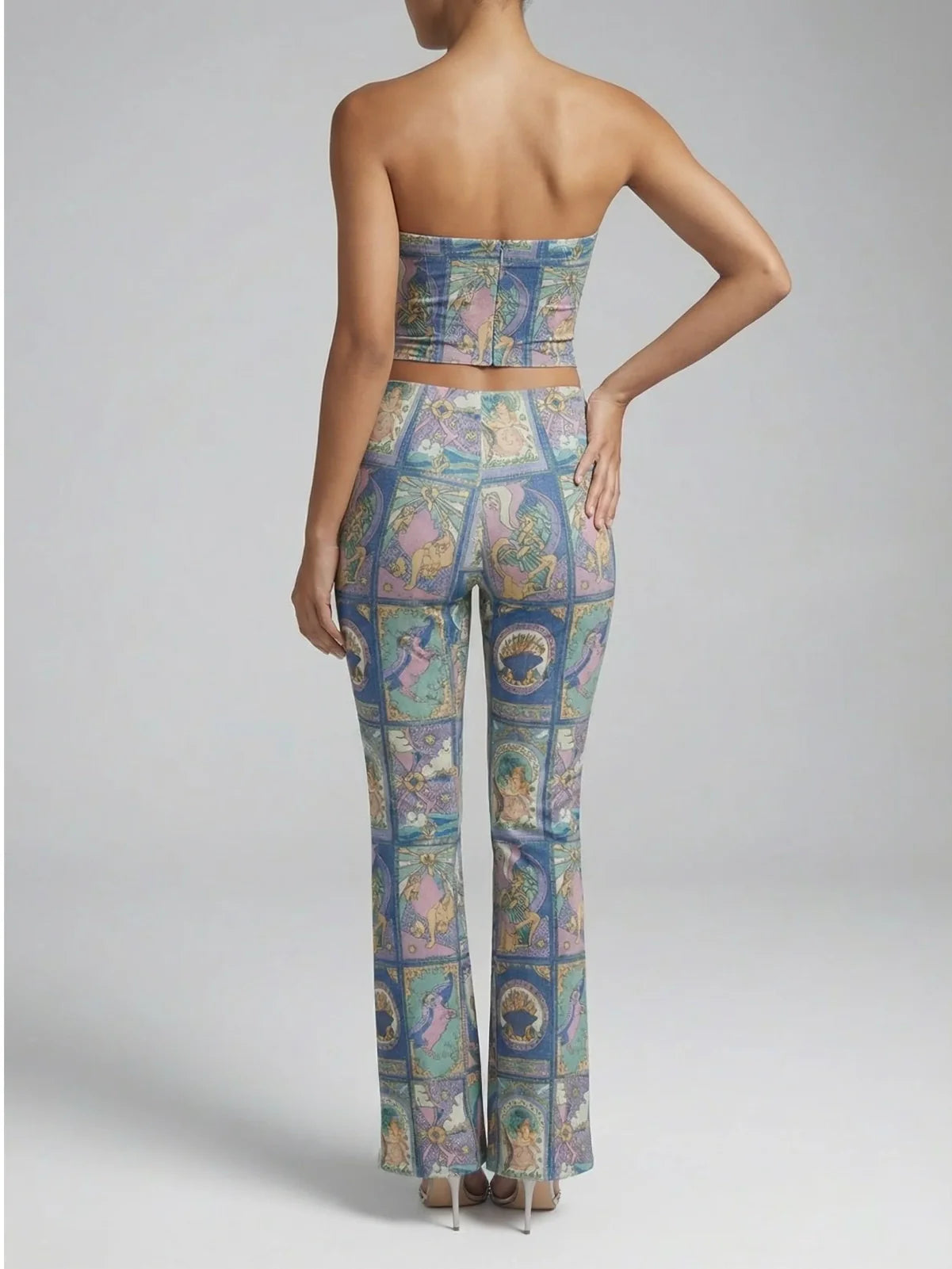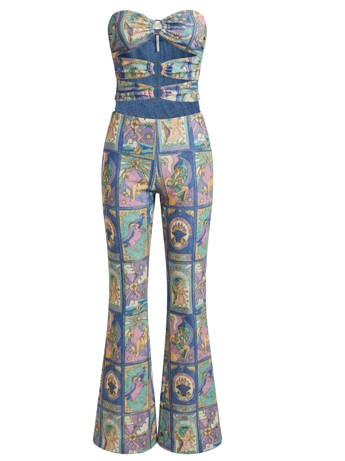 A bold one-piece jumpsuit featuring an intricate vintage-inspired print with a flattering, elongated silhouette. Designed with a strapless neckline and statement front cut-outs accented by ring details, this jumpsuit creates the illusion of a two-piece while remaining seamlessly connected at the back. The high-waisted fit flows into flared legs, enhancing the figure and adding a retro-chic touch.