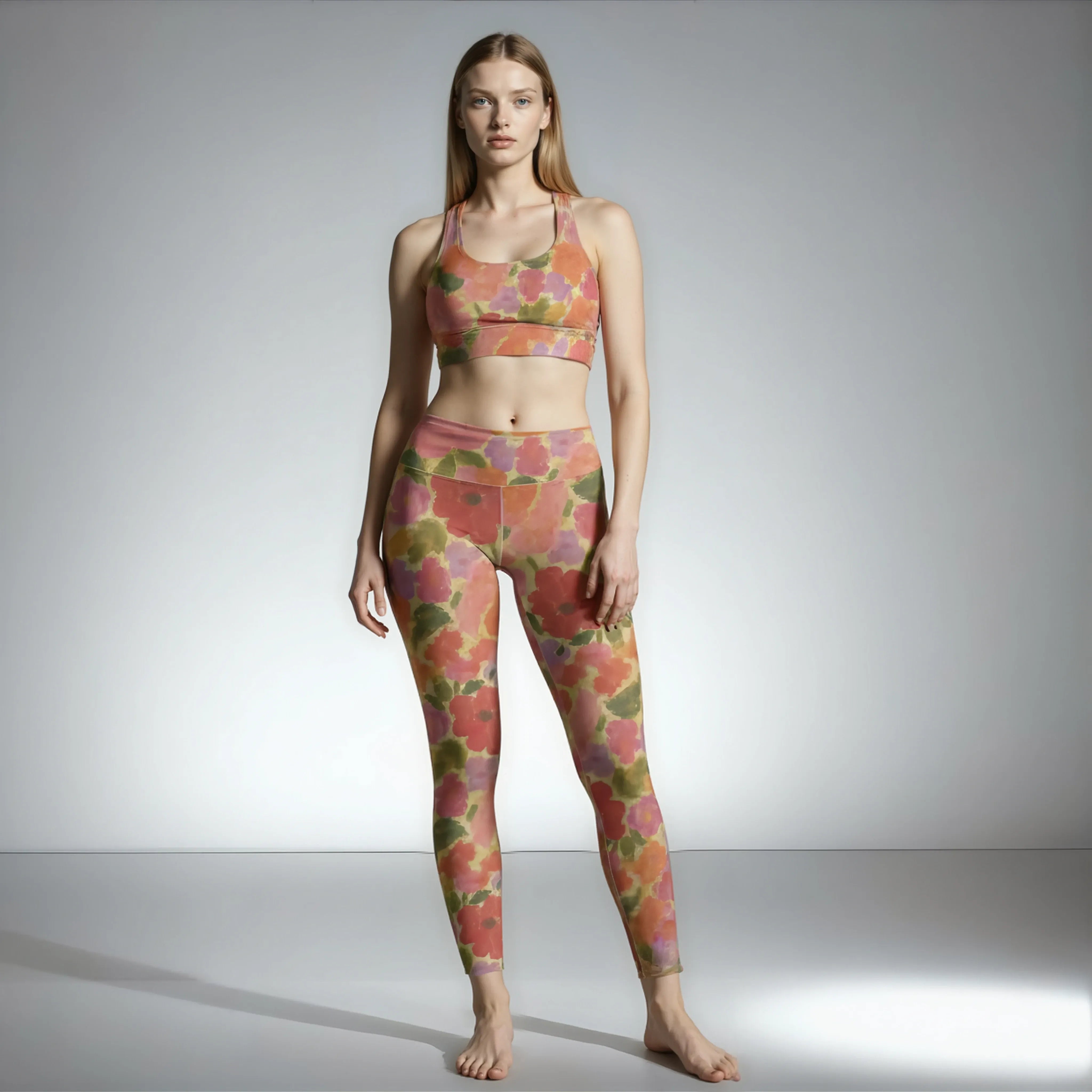 These elegant floral leggings blend peach, rose, and lilac in a hand-painted watercolor style. The gentle hues and flowing pattern bring a quiet, vintage grace — calm but full of life.