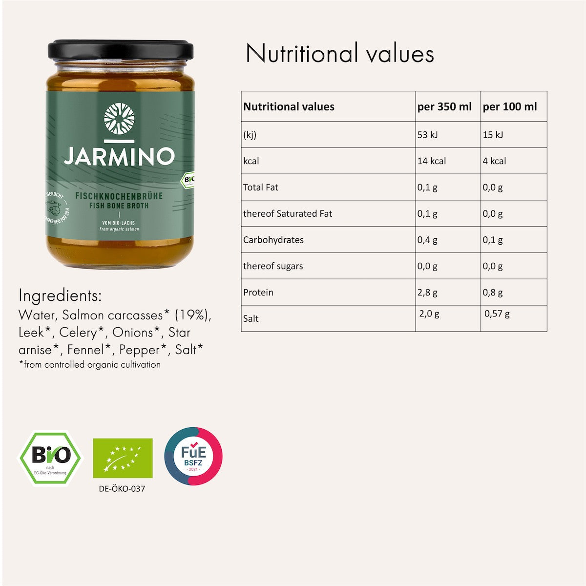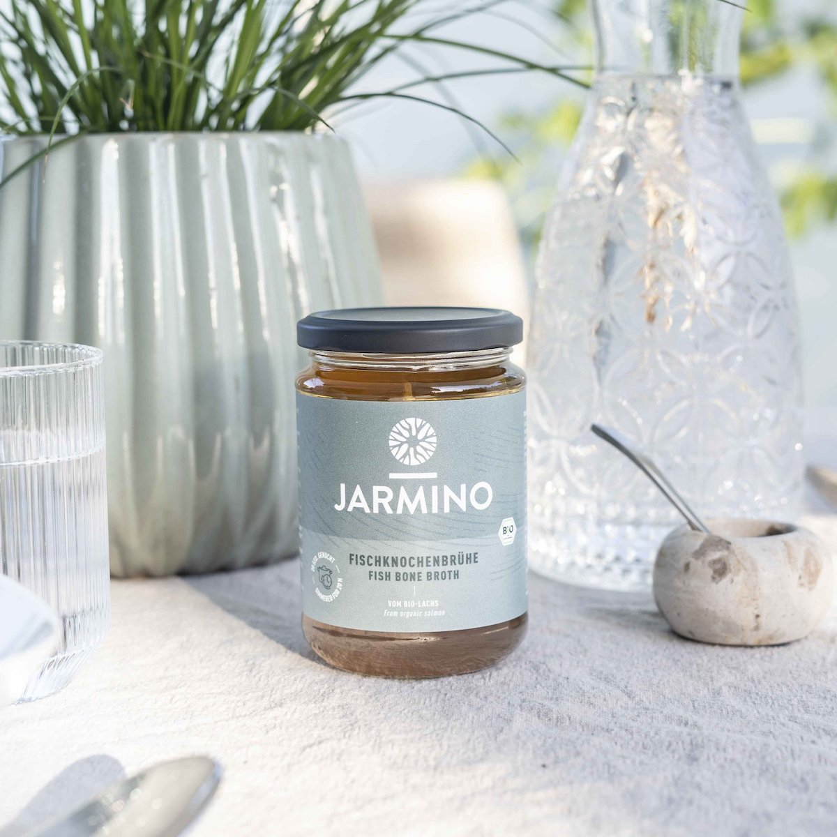 How do I use the fish bone broth? You can drink the fish bone broth pure to supply minerals and nutrients such as iodine or use it as a base for delicious soups and fish sauces. Where do the ingredients for the fish bone broth come from? Our fish bone broth is made from organic salmon carcasses. We source these from a sustainable salmon farm in Ireland. The vegetables come from organic farmers in the region around our production in Bavaria. Why do you not use wild salmon? Since wild salmon is threatened with extinction, we have clearly decided against using wild salmon in our fish bone broth. With organic salmon from aquaculture, we can also ensure that the salmon is free of unhealthy residues and no chemicals are used. |