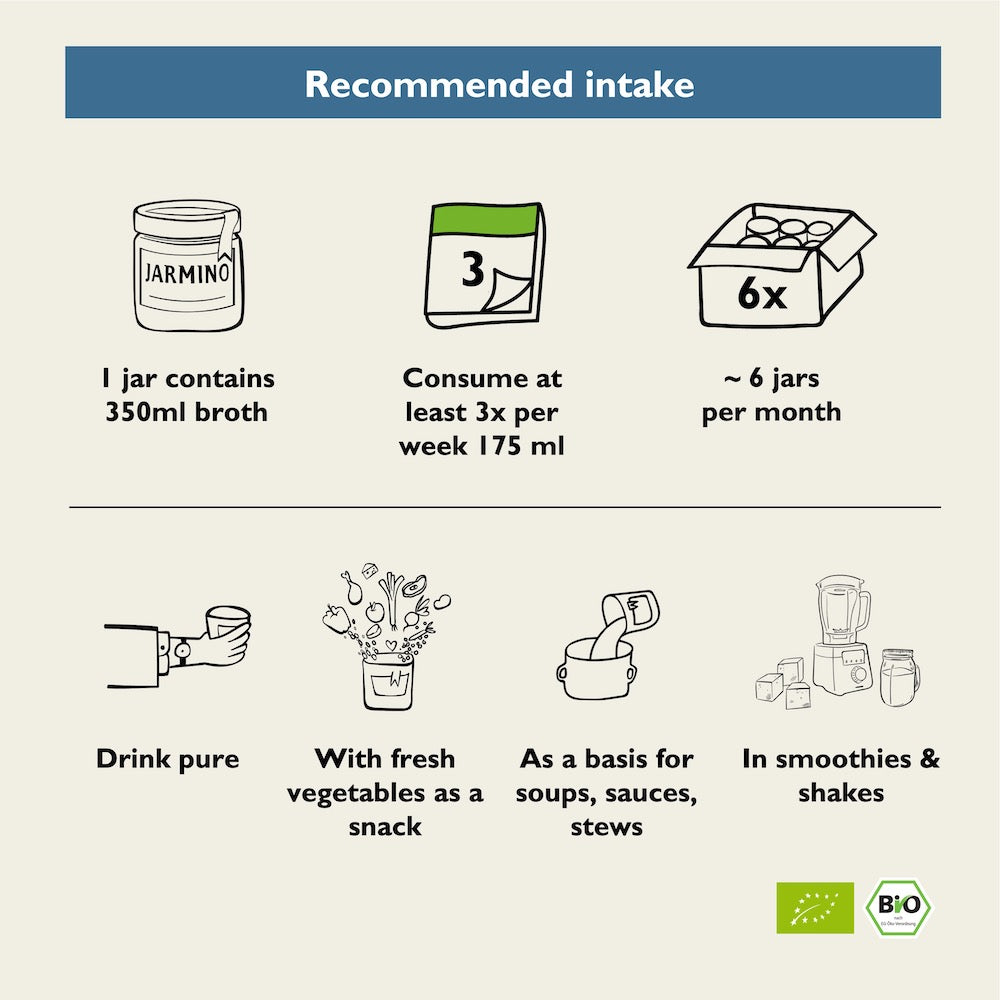 How many jars will I receive? This product is a package of 6 jars (350 ml each) of homemade organic fish bone broth. Why is the fish broth cooked for 20 hours? By boiling at low temperature for 20 hours, the valuable minerals and nutrients are dissolved from the fish carcasses and pass into the broth. The fish broth therefore not only saves a lot of time in cooking, but also provides the body with nutrients and energy. Is the fish broth free of histamine? Yes, the fish broth was tested in the laboratory and no histamine could be detected. I case of any further questions, just send us an e-mail support@jarmino.co.uk. |