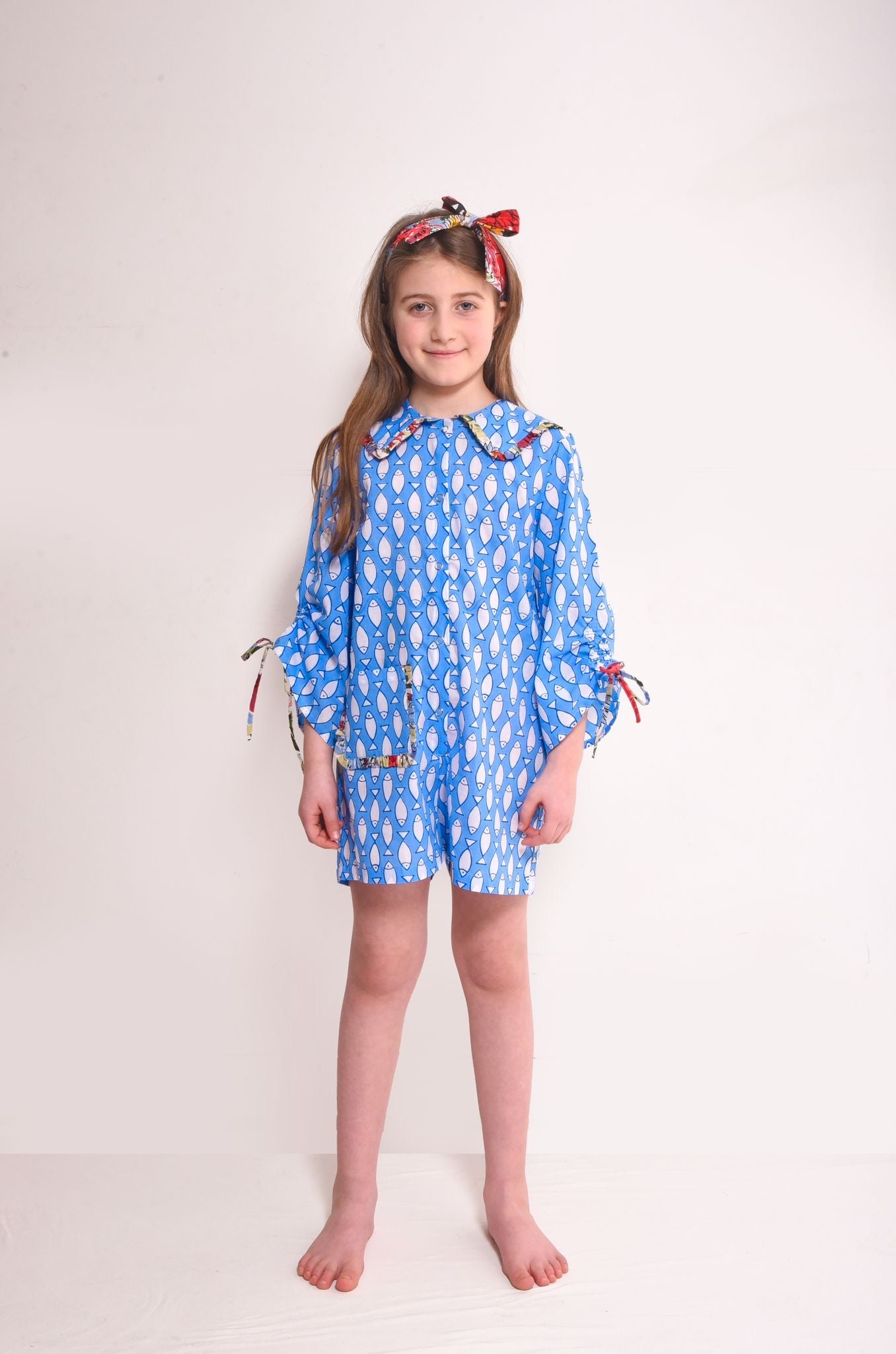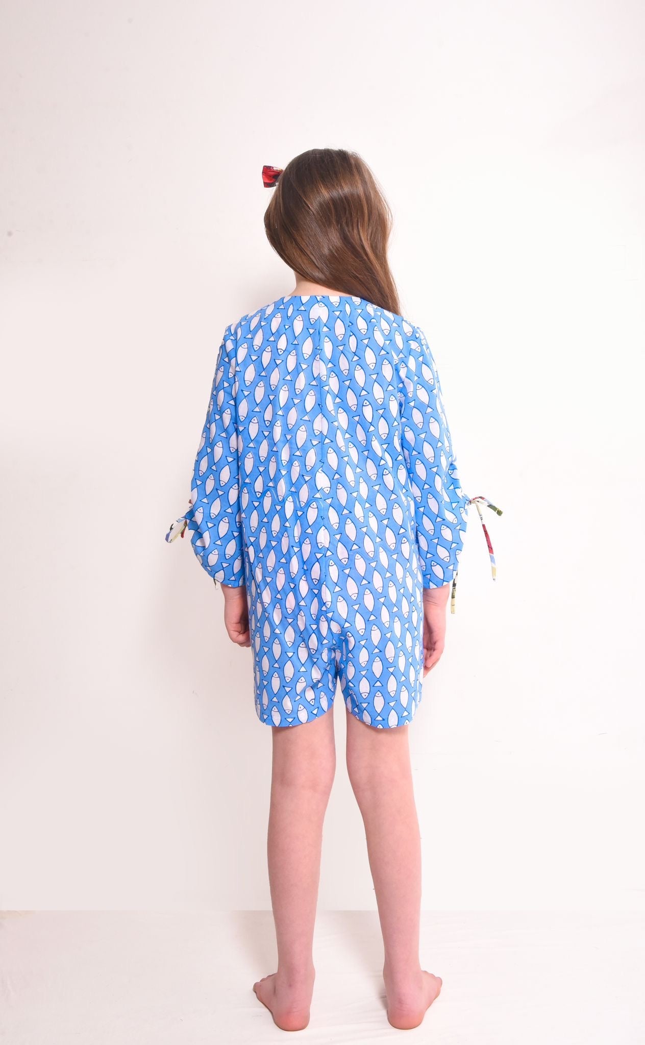 Dive into fun-filled adventures with our girls' fish patterned short combi! Designed to inspire aquatic excitement, this adorable ensemble features a fish print that adds a splash of charm to her wardrobe. Crafted with breathable cotton fabric, it ensures comfort all day long, whether she's exploring tide pools or playing beach games.