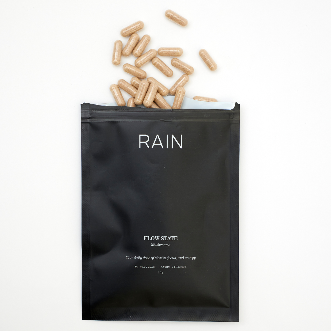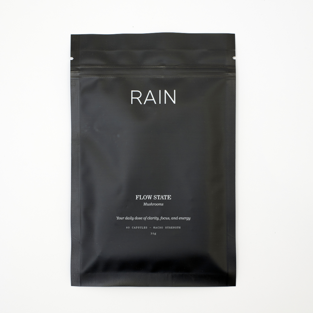At RAIN, we believe in showing up as our optimal selves – fully equipped to create a better world around us. That's why we've created Flow State Mushrooms, our mushroom capsules, designed to help you achieve unparalleled productivity, clarity, and elevated mood state.