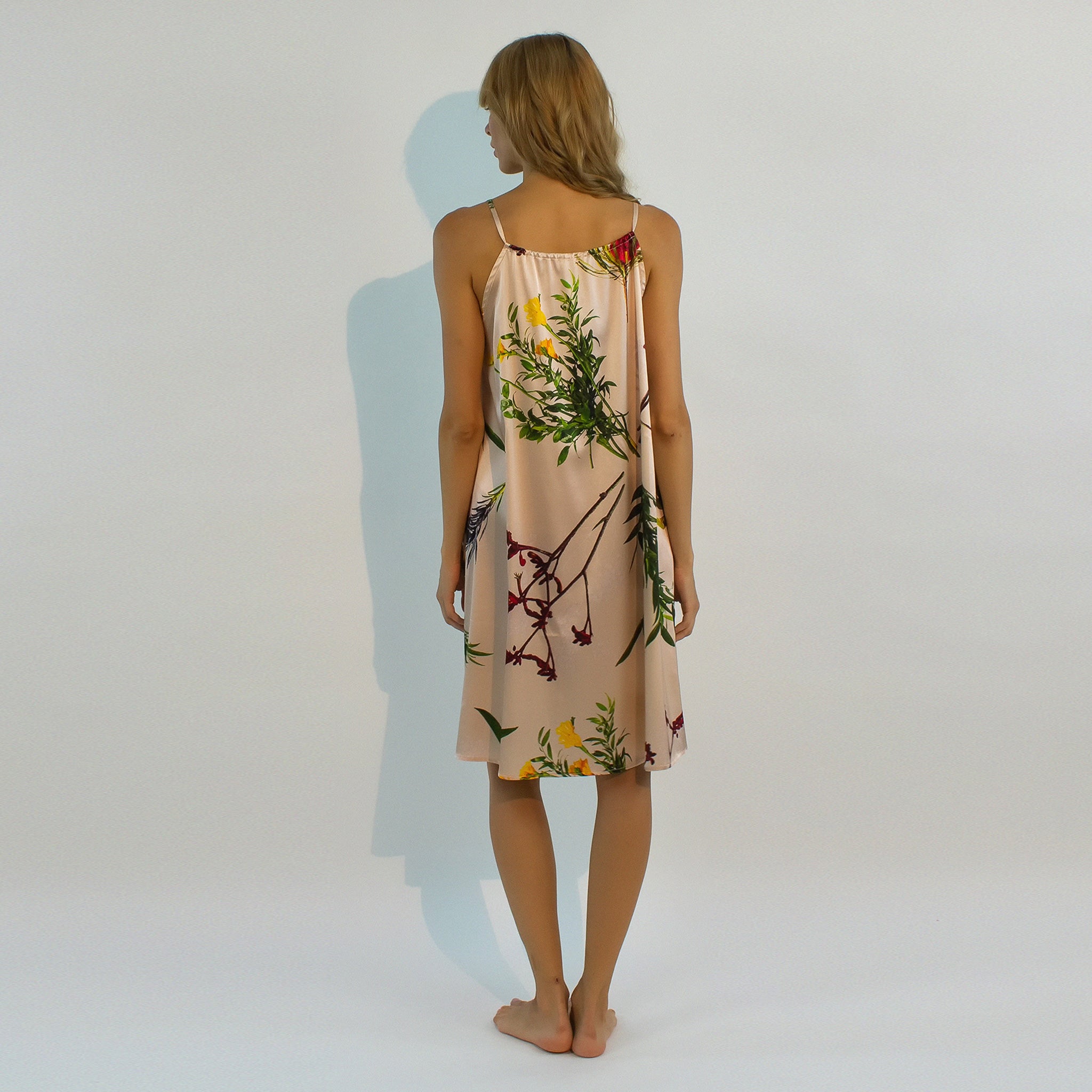 The Flying Flower chemise is cut from 19 momme Mulberry silk with an easy, relaxed cut with a unique author's print. The straps are adjustable so that you can find your perfect fit.
