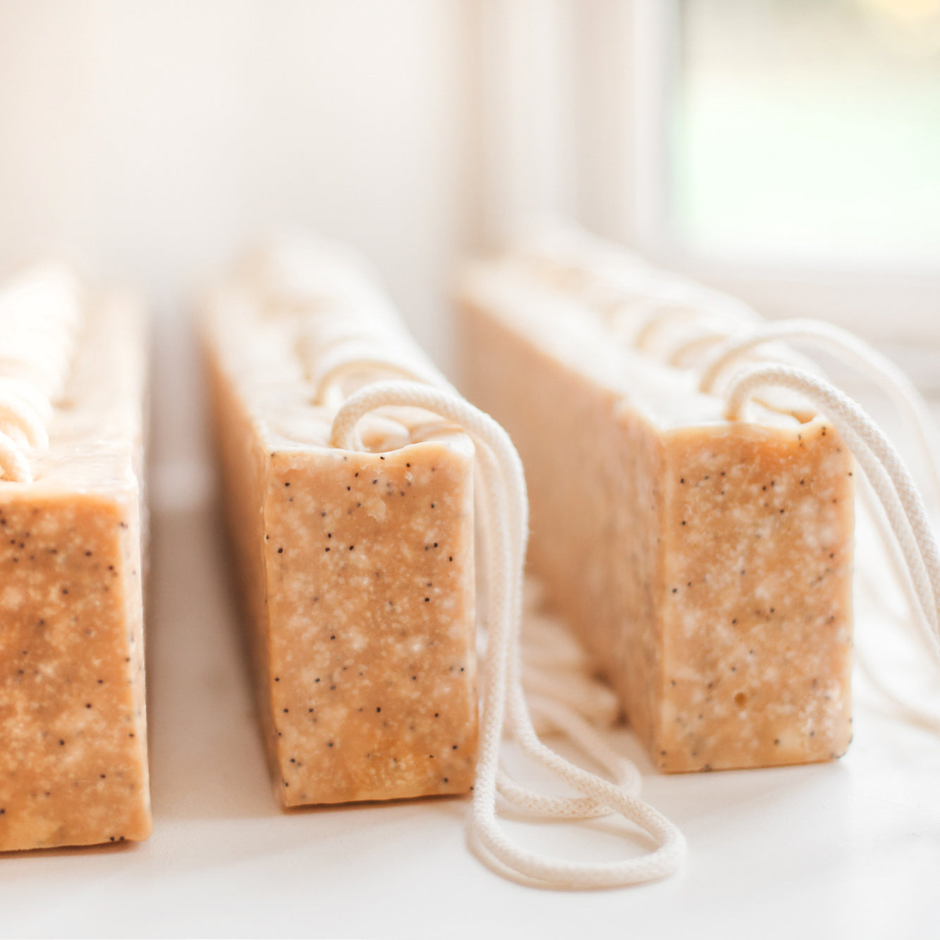 Coconut Oil (Sodium Cocoate), Olive Oil (Sodium Olivate), Shea Butter (Sodium Shea Butterate), Ricebran Oil (Sodium Ricebranate), Castor Oil (Sodium Castorate), Aqua, Glycerin, Vitamin E Oil (Tocopherol), Pumice, French Pink Clay (Montmorillonite), Lemongrass Essential Oil (Cymbopogon Flexuosus Oil), Eucalyptus Essential Oil (Eucalyptus Globulus Leaf Oil), Sodium Chloride, and Poppy Seeds (Papaver Somniferum Seed).