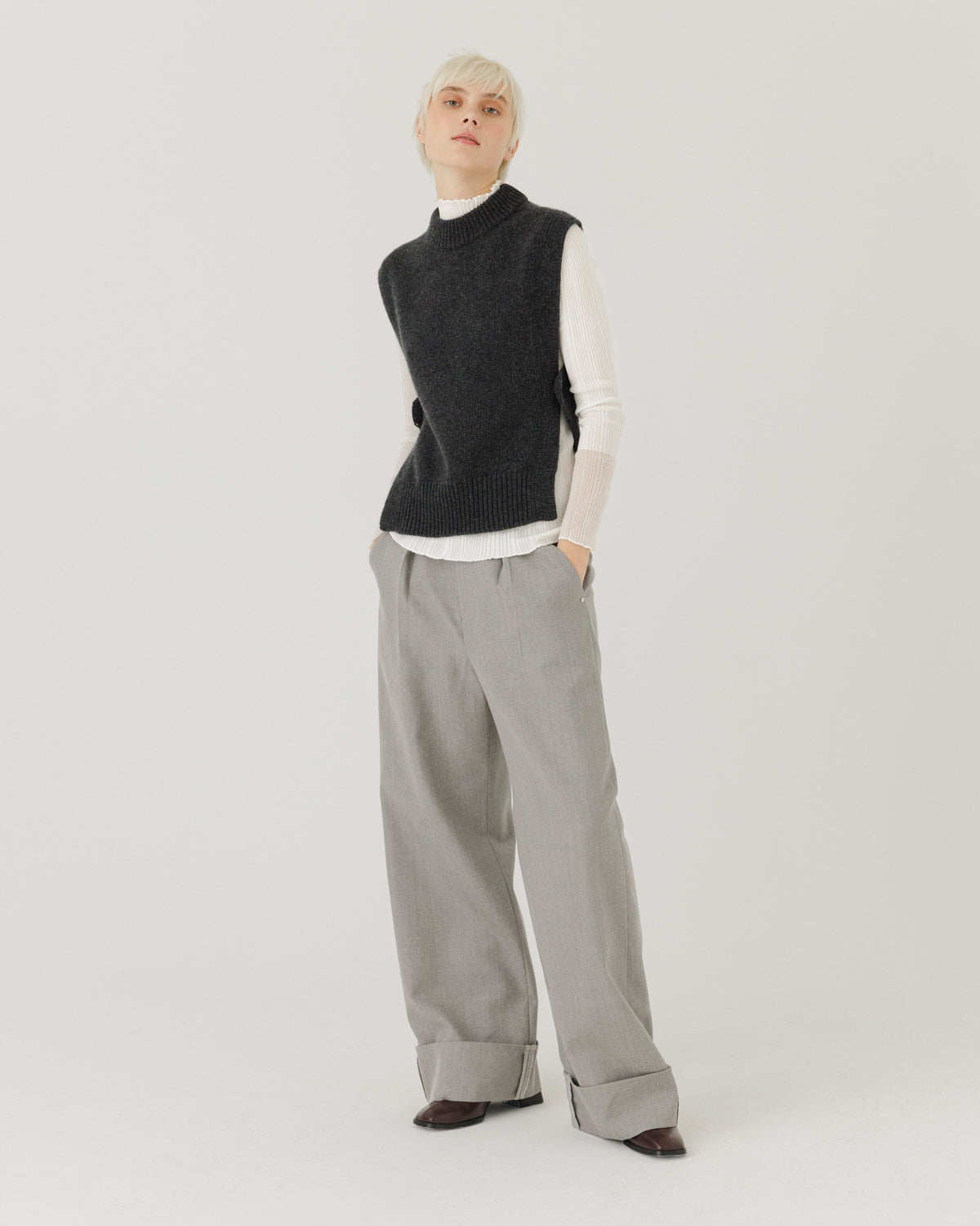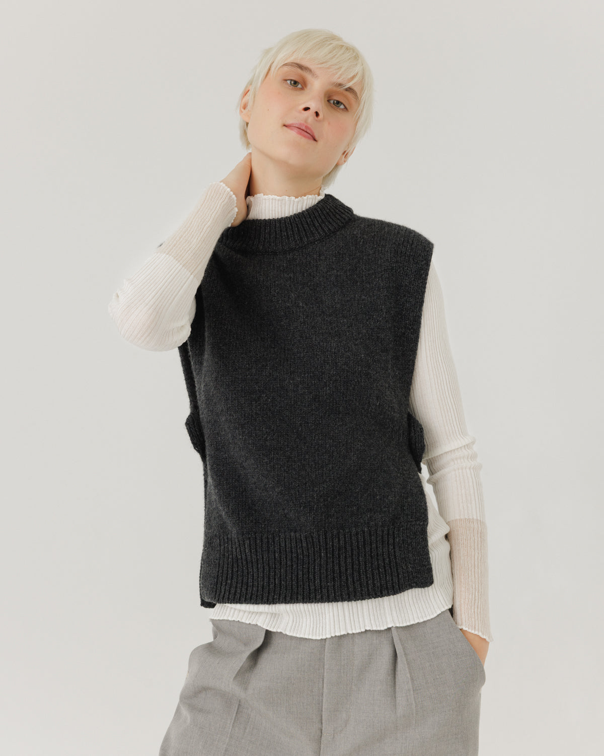 We called this superfine wool vest Giria, the Lithuanian word for “forest.” Inspired by Lithuania’s endless woodlands, she’s the piece your wardrobe didn’t know it was missing. Soft to the touch and effortlessly layerable, Giria slips just as easily over a shirt as she does under a coat and makes every outfit feel intentional. Featuring side openings with four corozo-seed buttons, she can be worn open or closed for playful styling. The round, folded neckline and French shoulder construction create a sculptural yet understated silhouette. The fit is true to size.