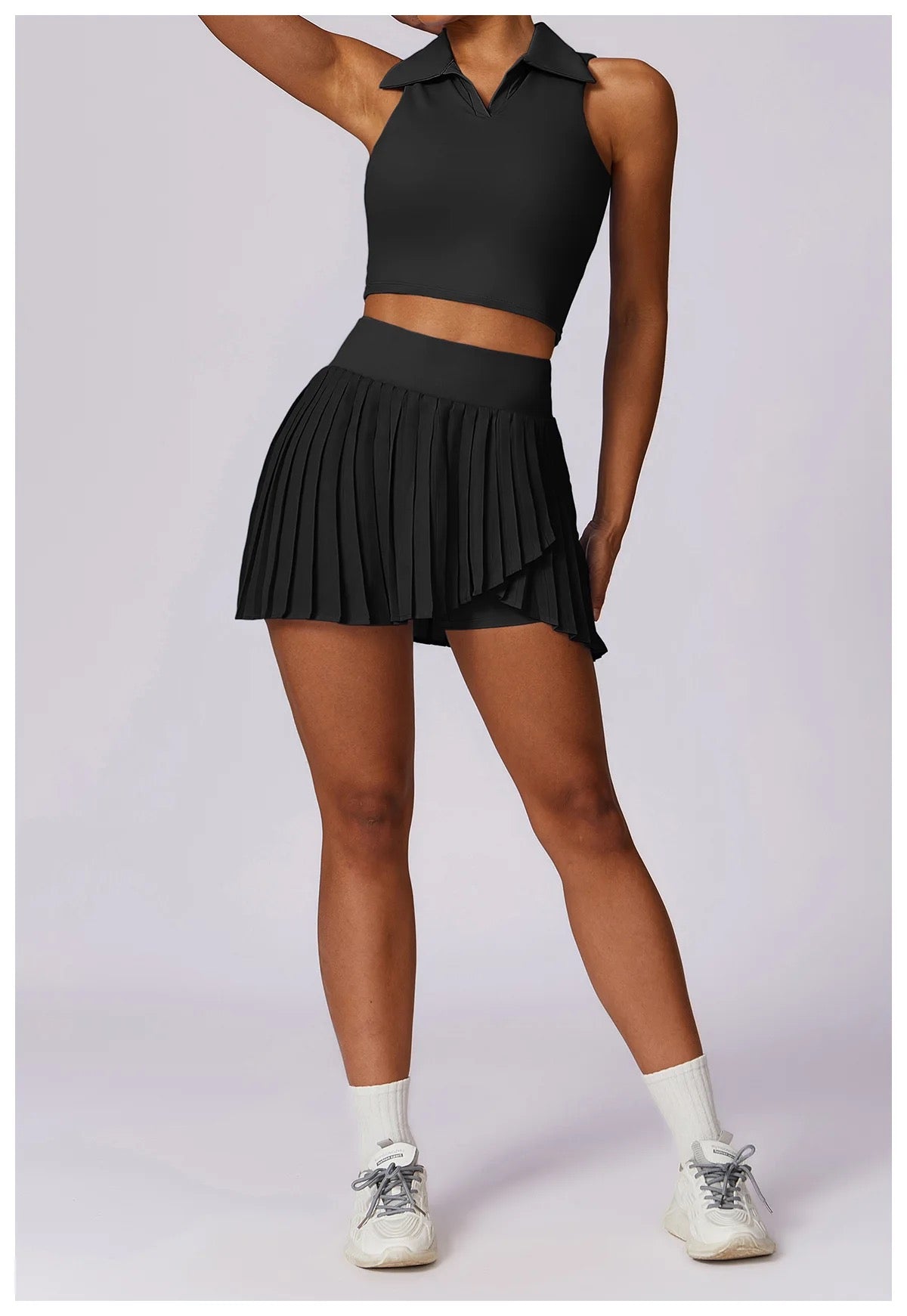 Prepare for the next Wimbledon season with our Grand Slam Women's Tennis Set. This stylish set includes a tennis skirt with built-in shorts and convenient side pockets, as well as a tennis top with a padded sports bra for added comfort and support. Get ready to dominate the court in style.