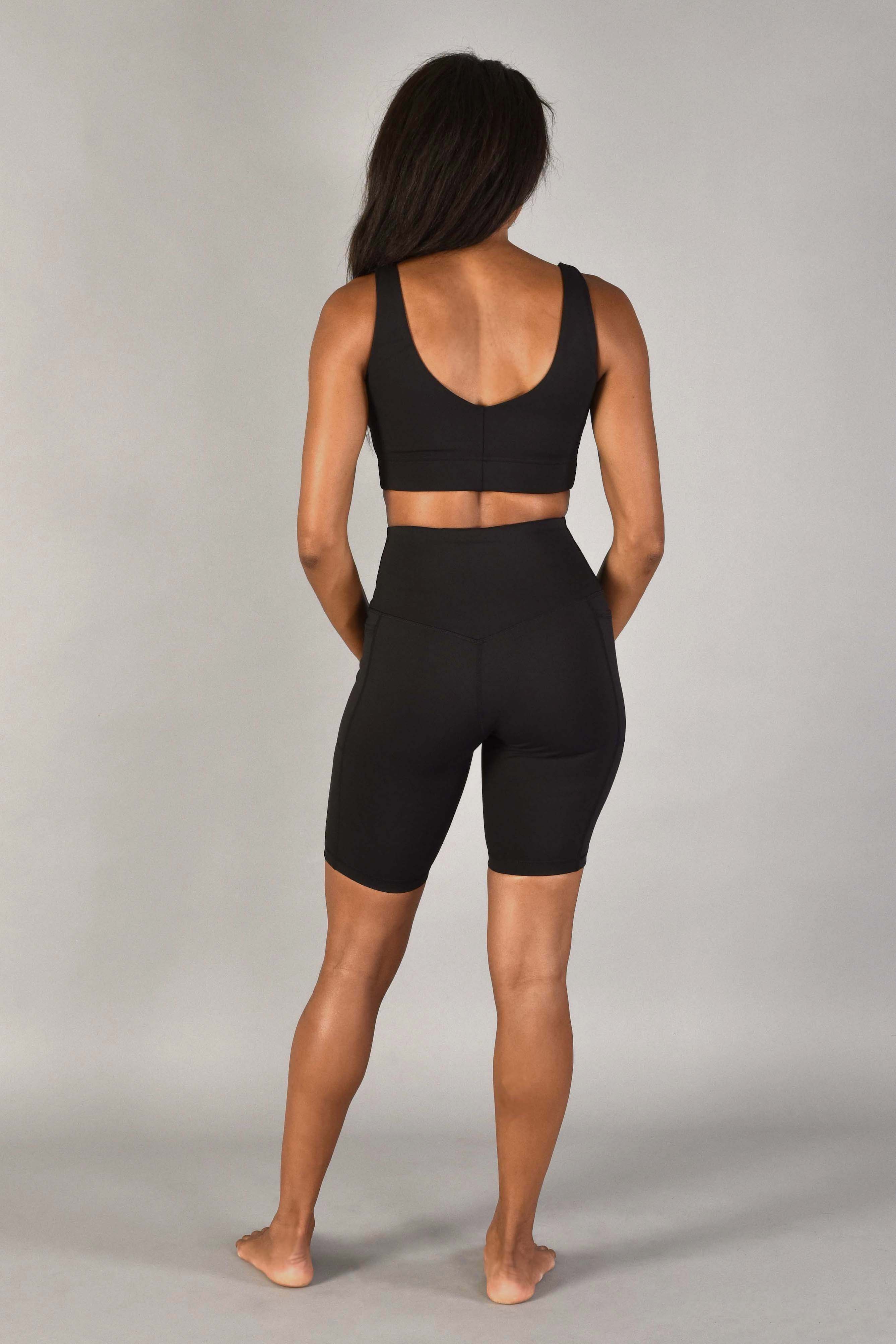 High Rise Short with 9" inseam and 3 pockets! Compressive Fabric with flat , no-roll front and elasticized back perfect for hiking and every day fit. Crafted with premium recycled materials, it embodies sustainability, letting you Wear Love More and Waste Less.