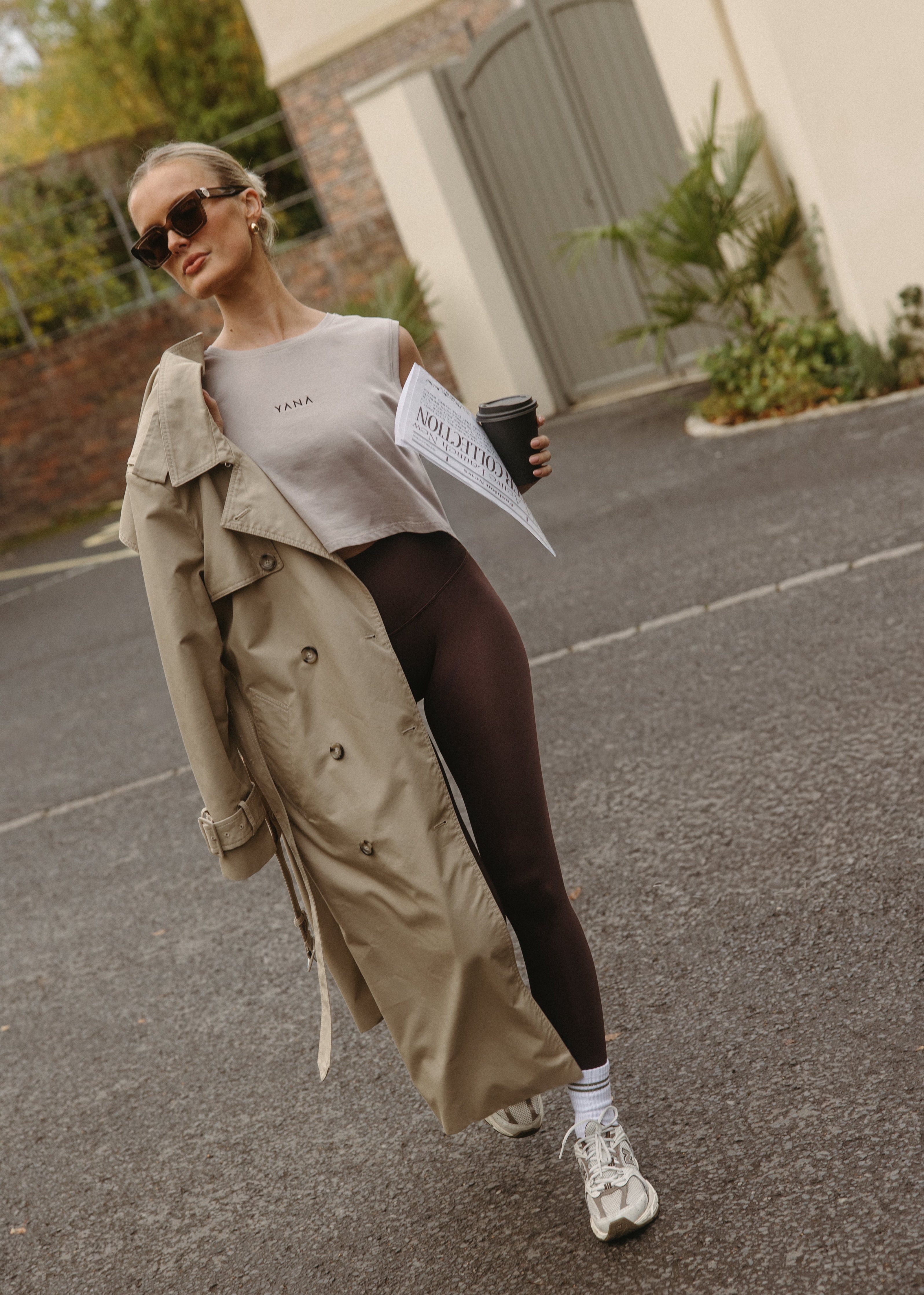 Indulge in the ultimate comfort with our High Waisted Full Length Leggings in the shade Tobacco! Made in Italy, these super soft leggings have a seamless design and four-way stretch for flexible fit, with a rouched rear seam for a flattering fit. Featuring a soft waistband, rear leg YANA embroidered detail and a full length fit, you'll never want to take them off. Pair with our Long Sleeved Tobacco Top and layer with our Oatfield Gilet and sunglasses for an active and effortless outfit.