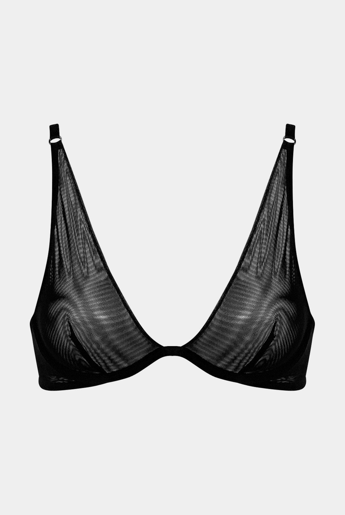 A super comfortable iconic deep plunge bra is designed from soft Italian tulle, making it a top pick for everyday wear. A soft semi-transparent tulle creates a romantic yet modern look. The sensuality black colour has become a favourite for everyday use. Cool. Minimalistic. Irreplaceable!