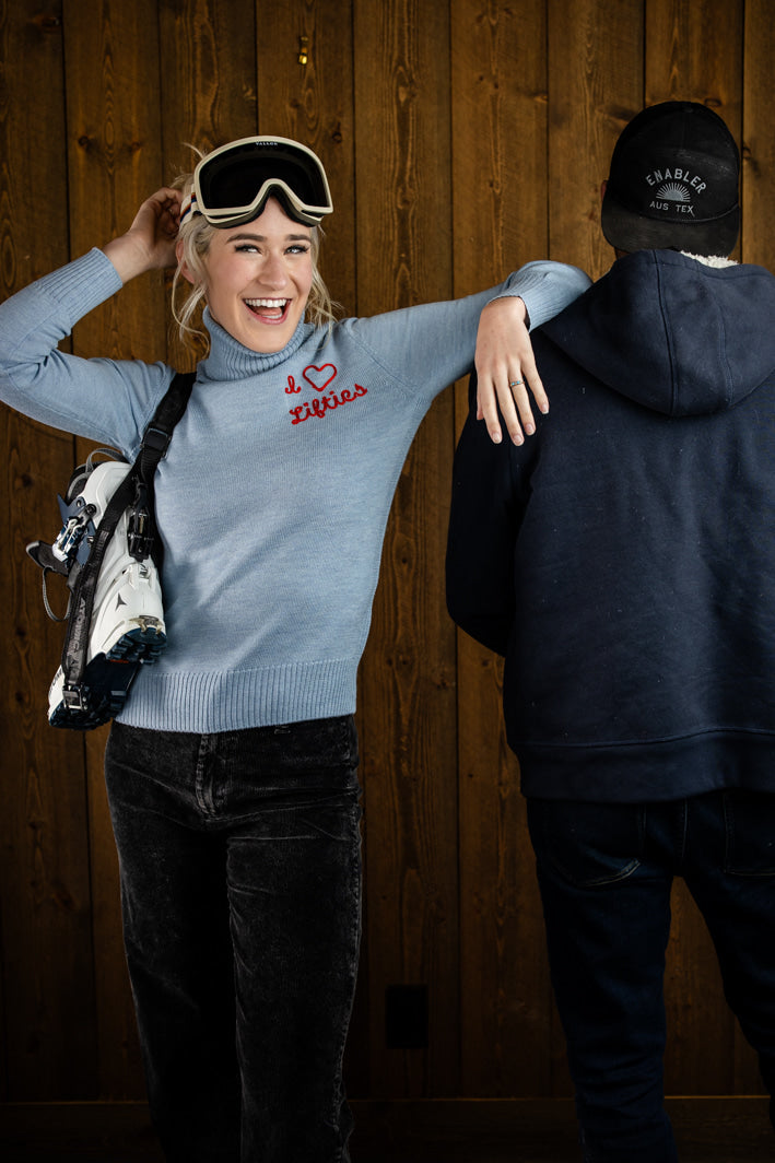 Broadcast your love for lifties for all to see and agree! They sweep snow off our chairs, pick us up when we fall, make us feel young, and turn every lift line into a party! This classic, slim fit turtleneck is knit from fine merino wool with a pop of embroidered sass just over your heart . Wear under your ski kit to flash at lifties, or with a pair of jeans for Après.