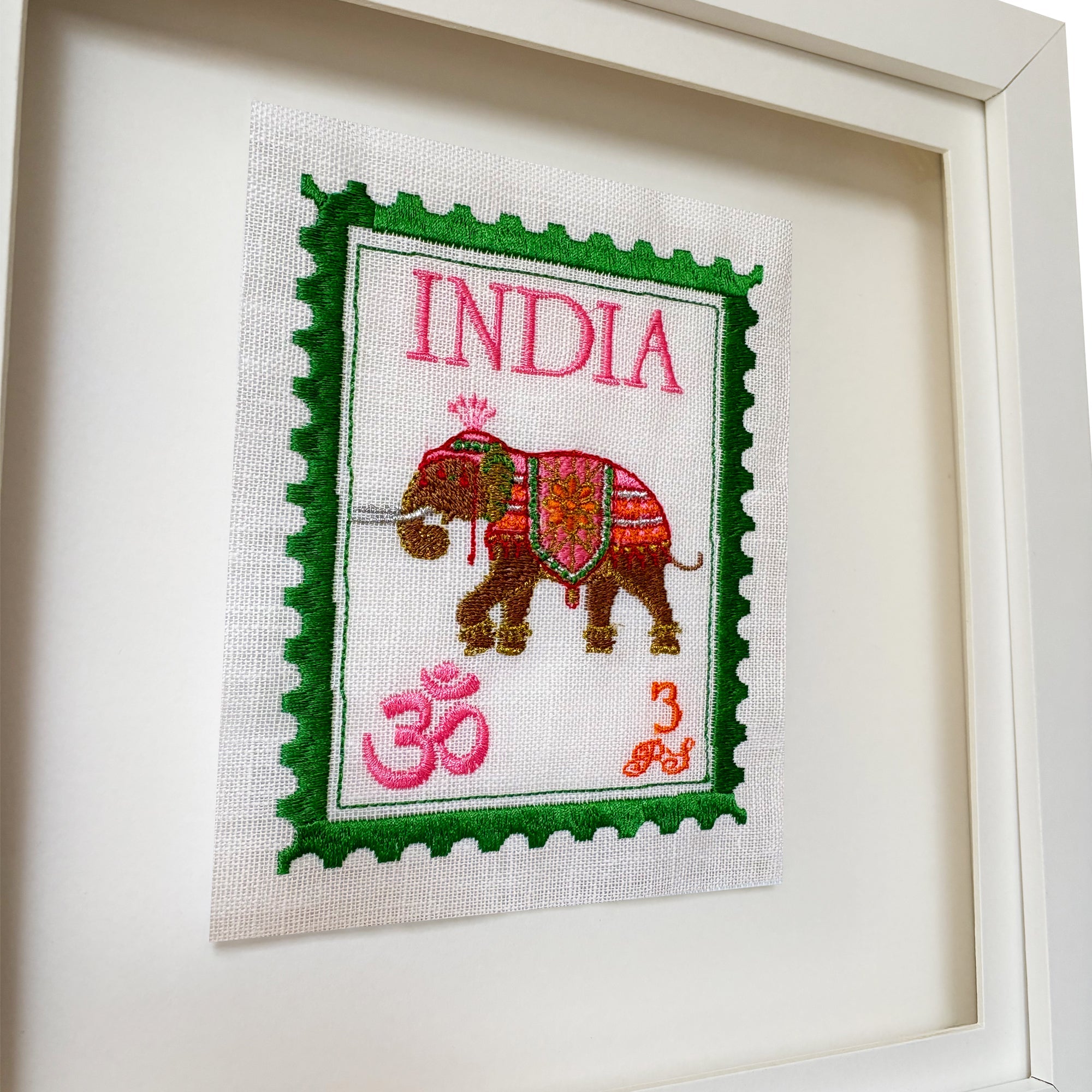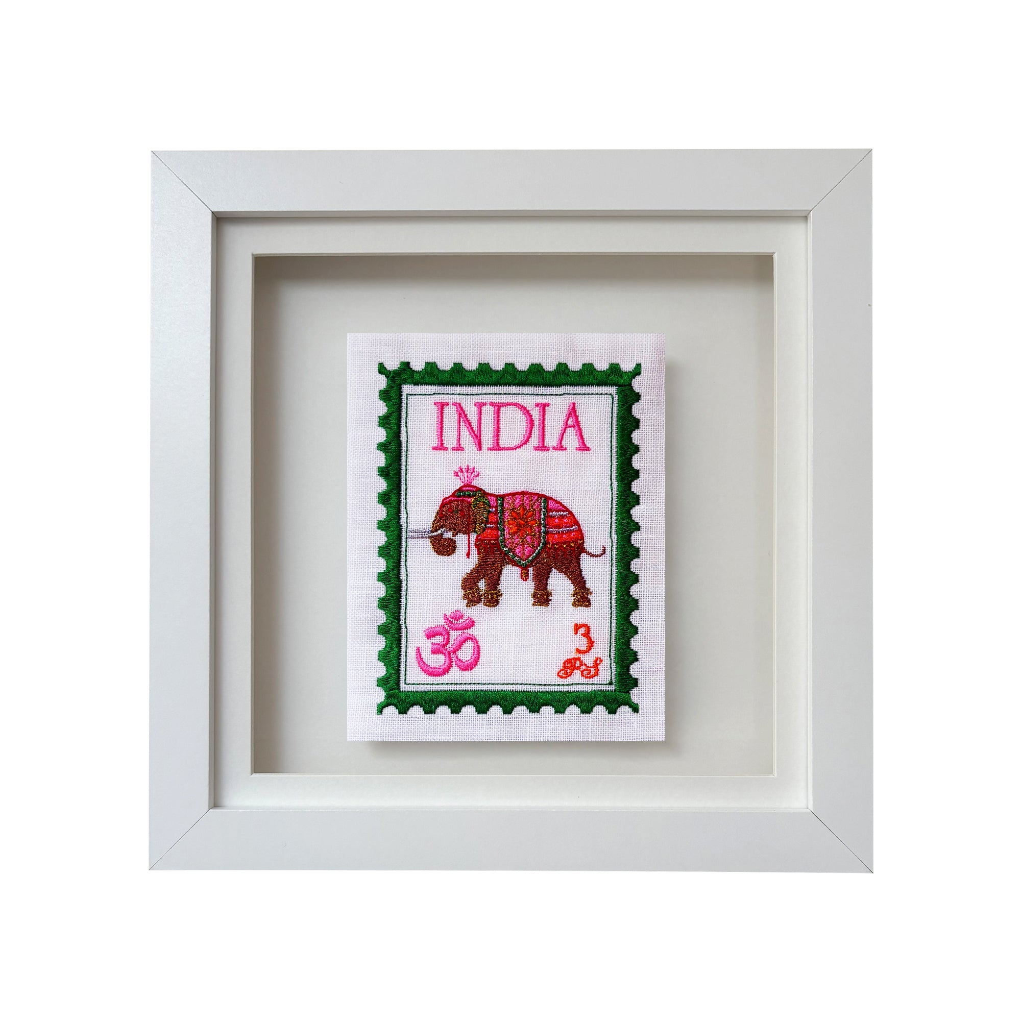 I wanted to create a range of unique embroidered stamps from all over the world, inspired by India; these are bright and fun with a playful twist. We stitch all of these in our London studio and use beautiful floating frames.
