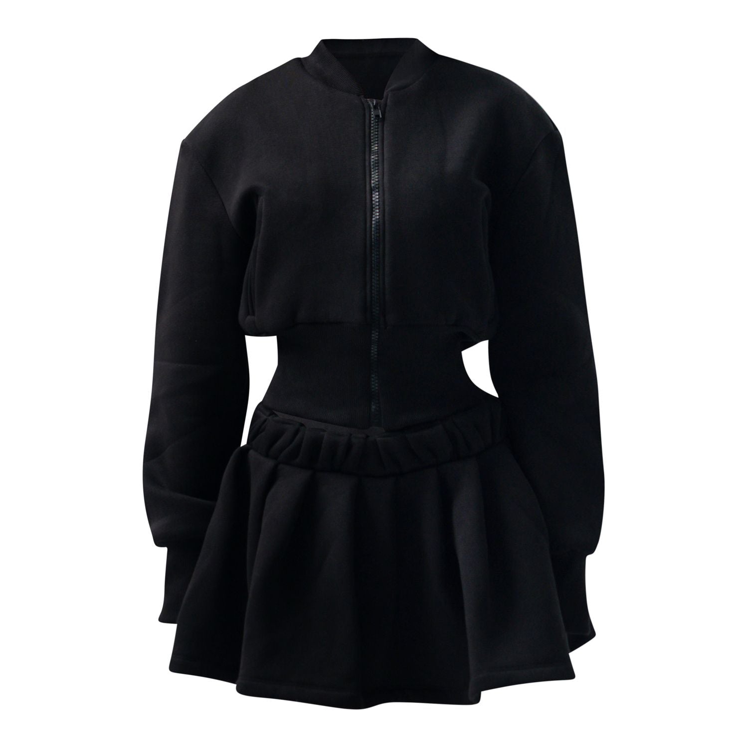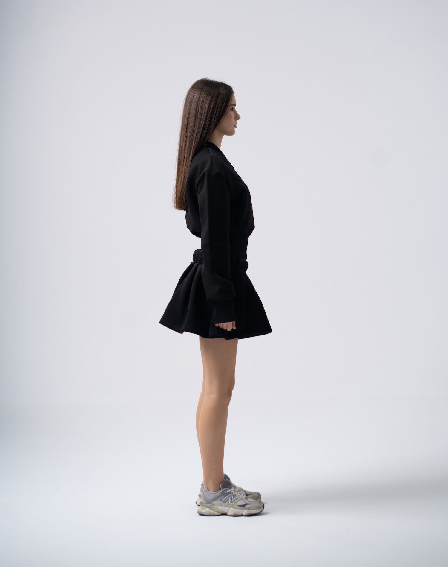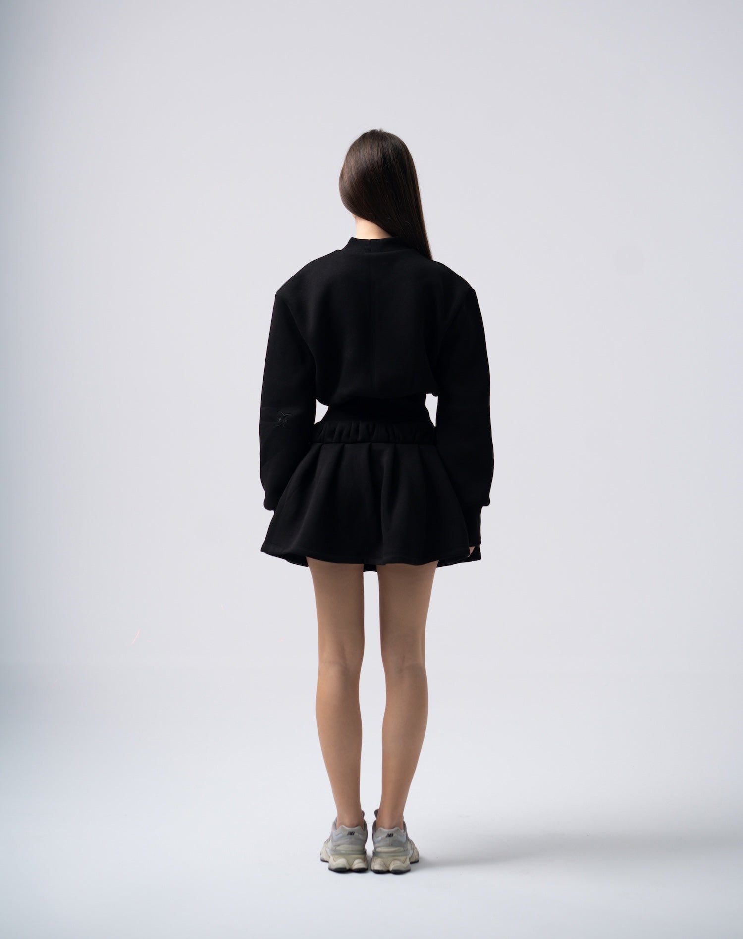 This outfit consists of a short zip-up jacket with wide sleeves, fitted tightly at the waist for an elegant effect. The skirt features a flared cut with a gathered elastic waistband, giving it a sporty and modern look. Thanks to its cotton and elastane composition, it offers comfort and excellent fit to the body.