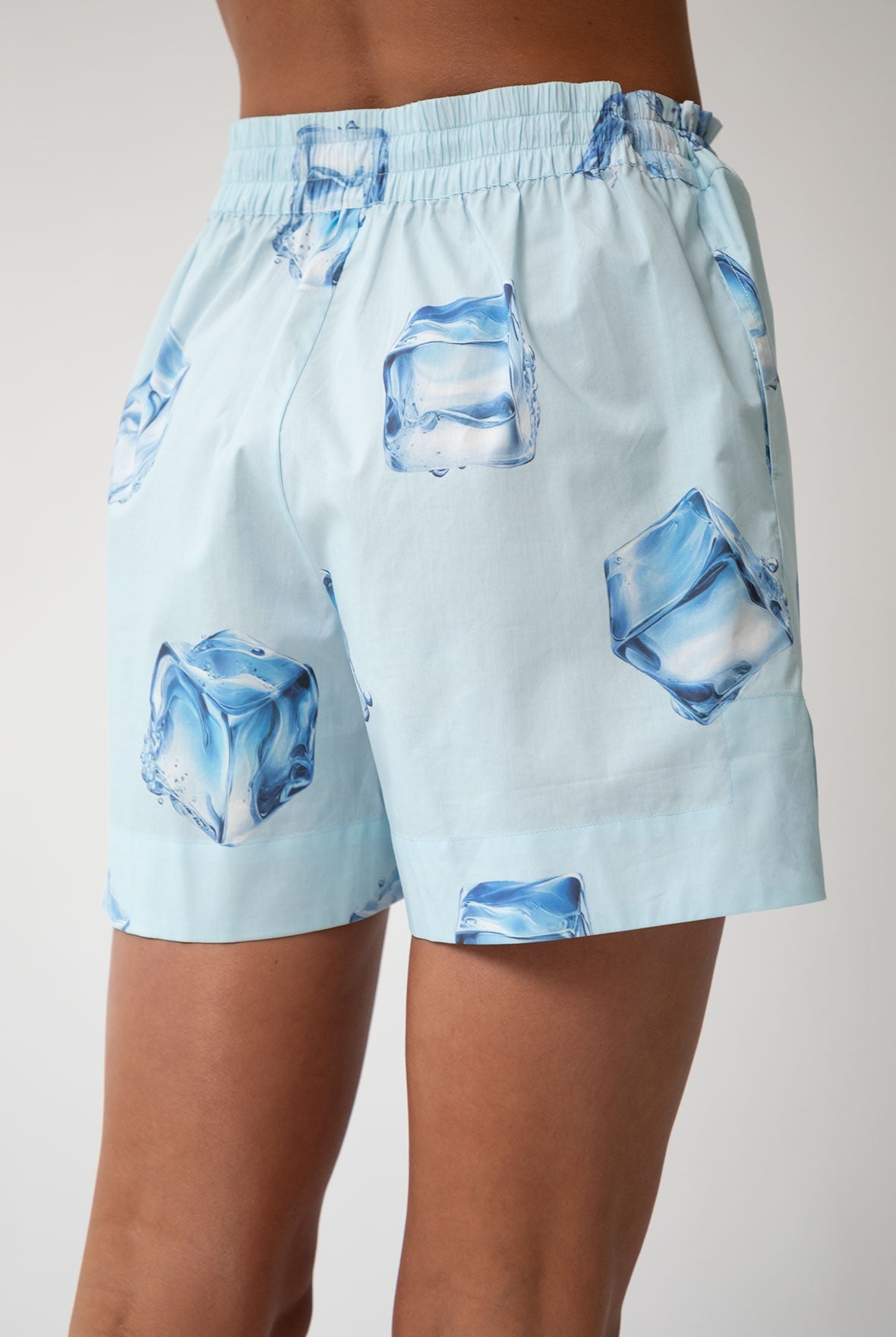 The vibrant ice cube print on a serene blue background creates a refreshing and modern look, perfect for summer days. Blend comfort with contemporary style, making them ideal for casual outings or home relaxation.