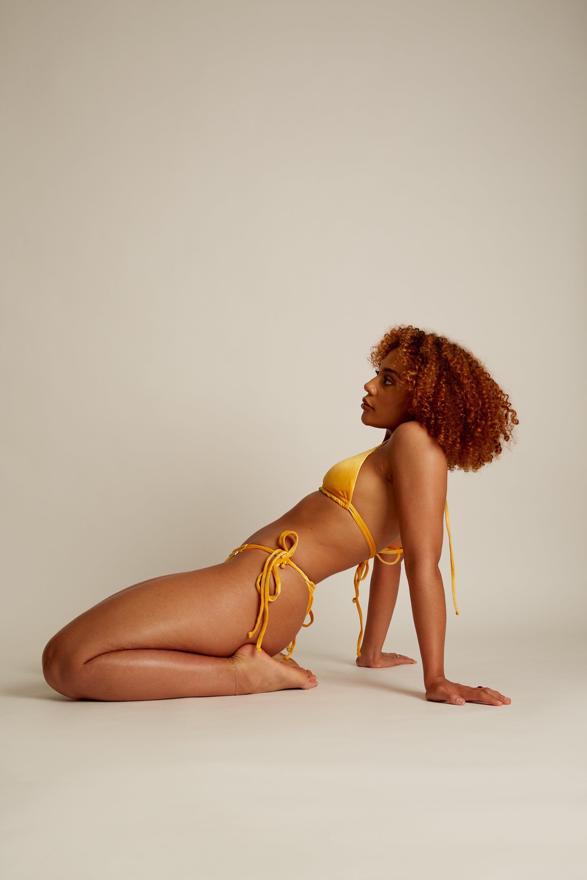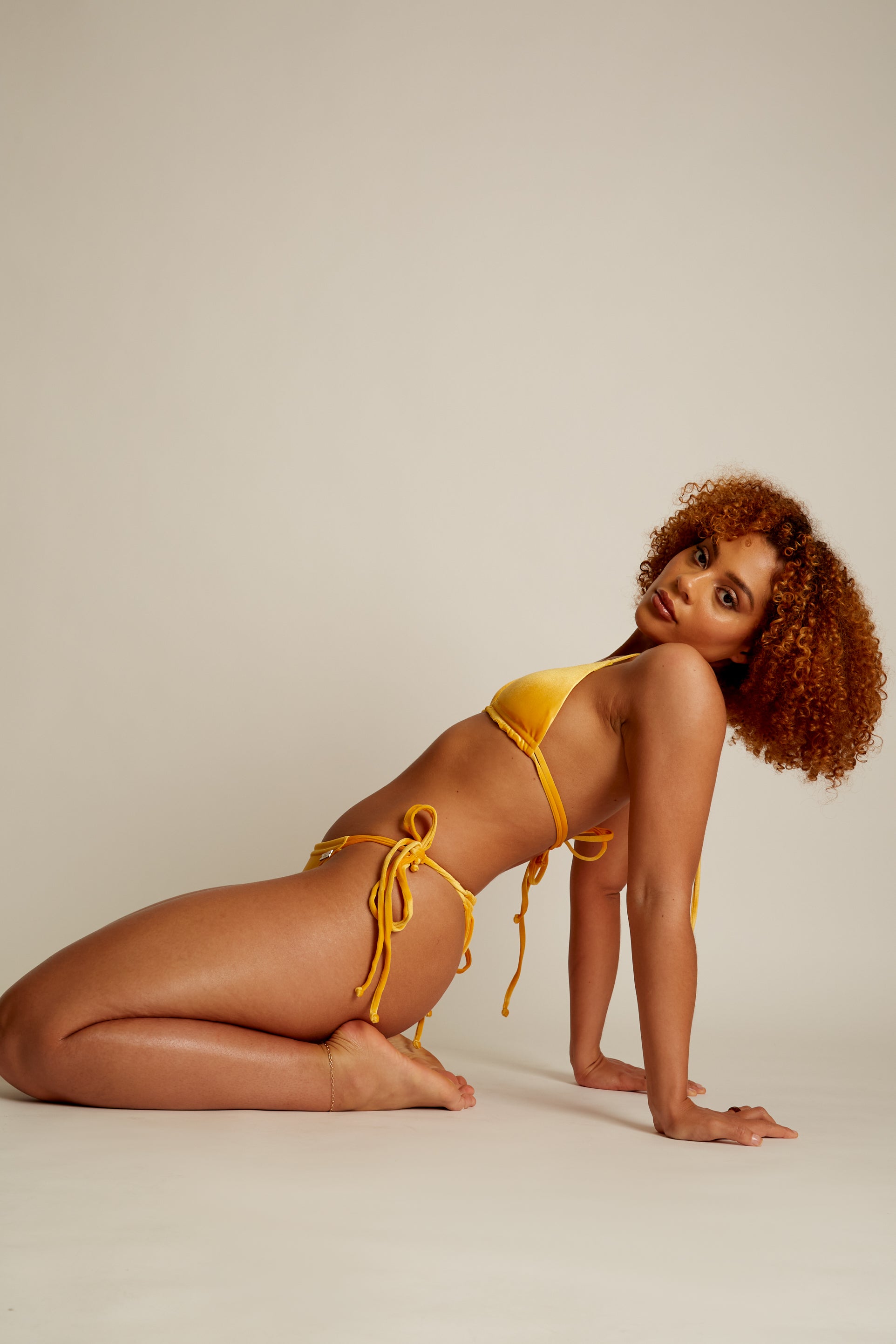 The June bikini from our SZN THREE collection features a double detailed triangle bikini top and gathering bottoms in a warm yellow glistening velvet. Bottoms can be adjusted for suitable coverage. Adjustable straps and removable padding. Available in small, medium large, and X-Large model Shola wears a size medium and her measurements are: height 5’7, bust 32″, hips 38’’.