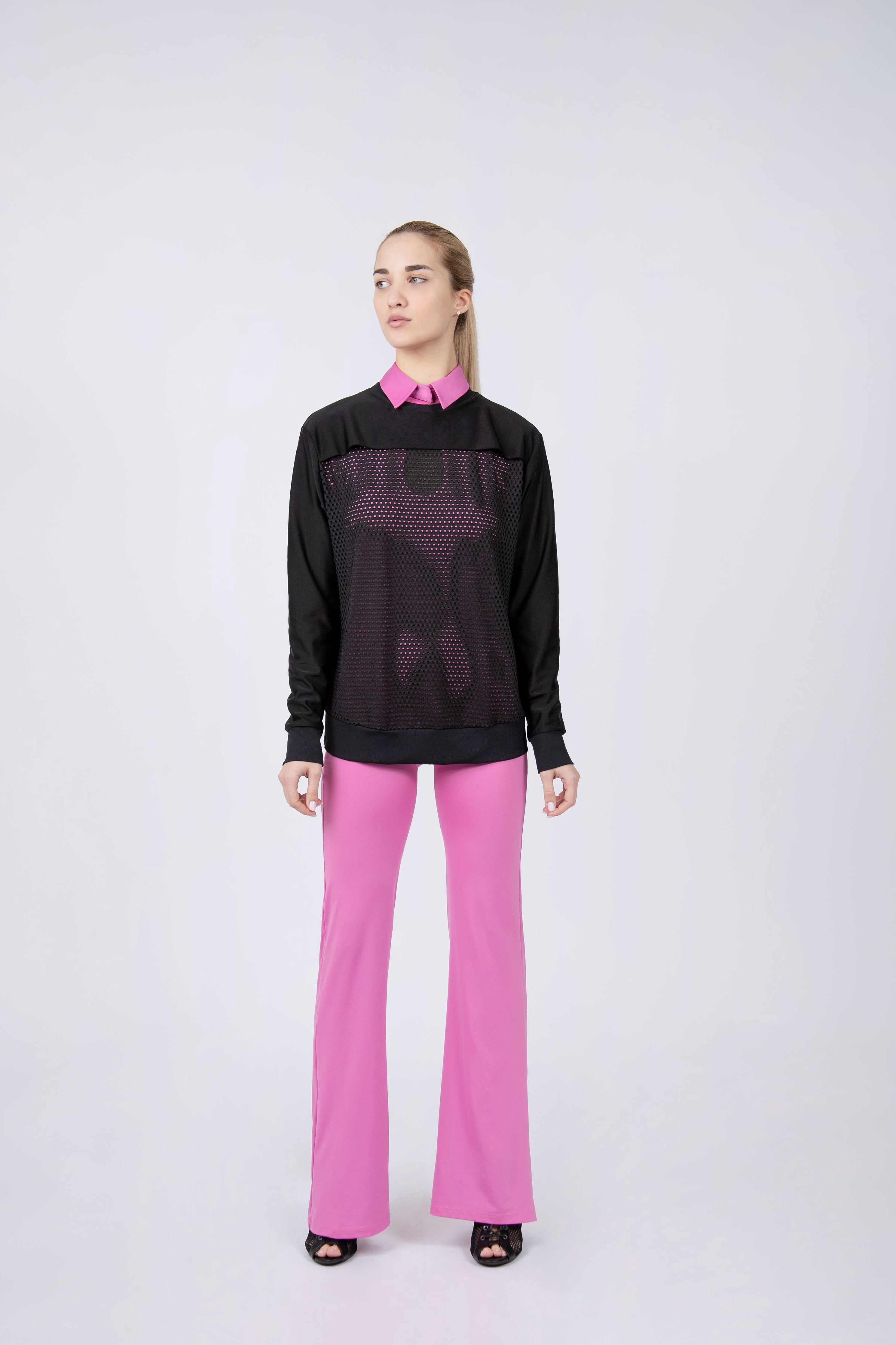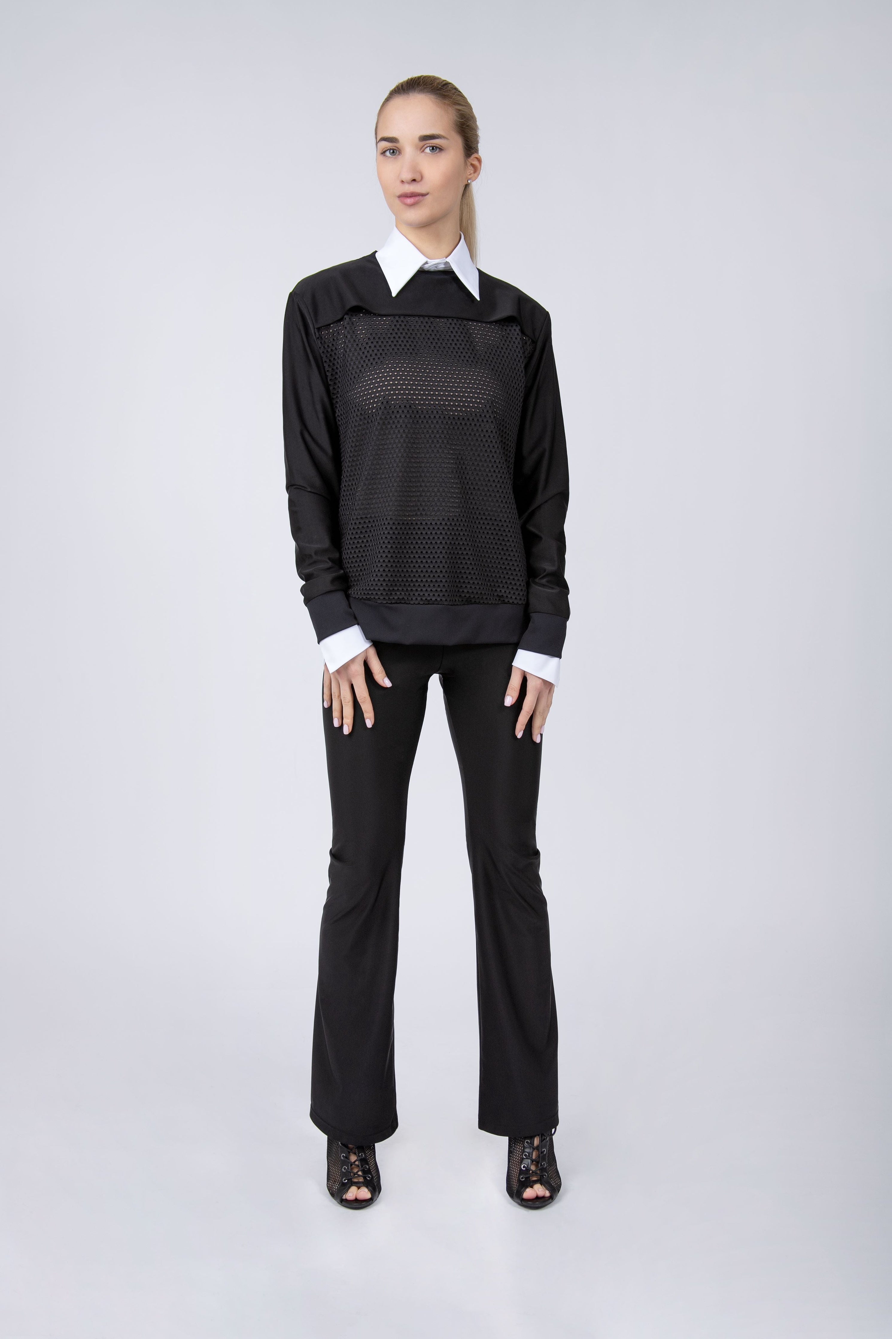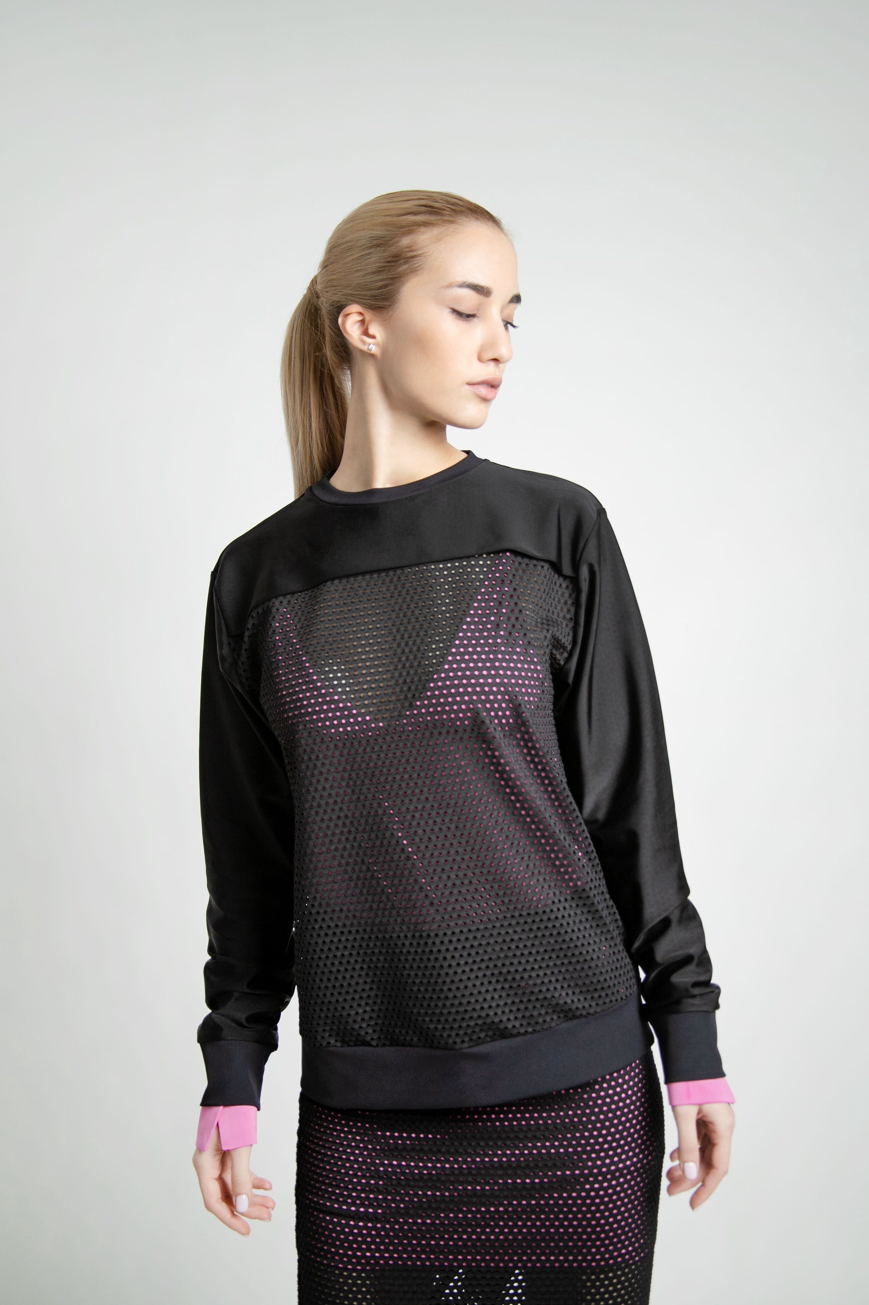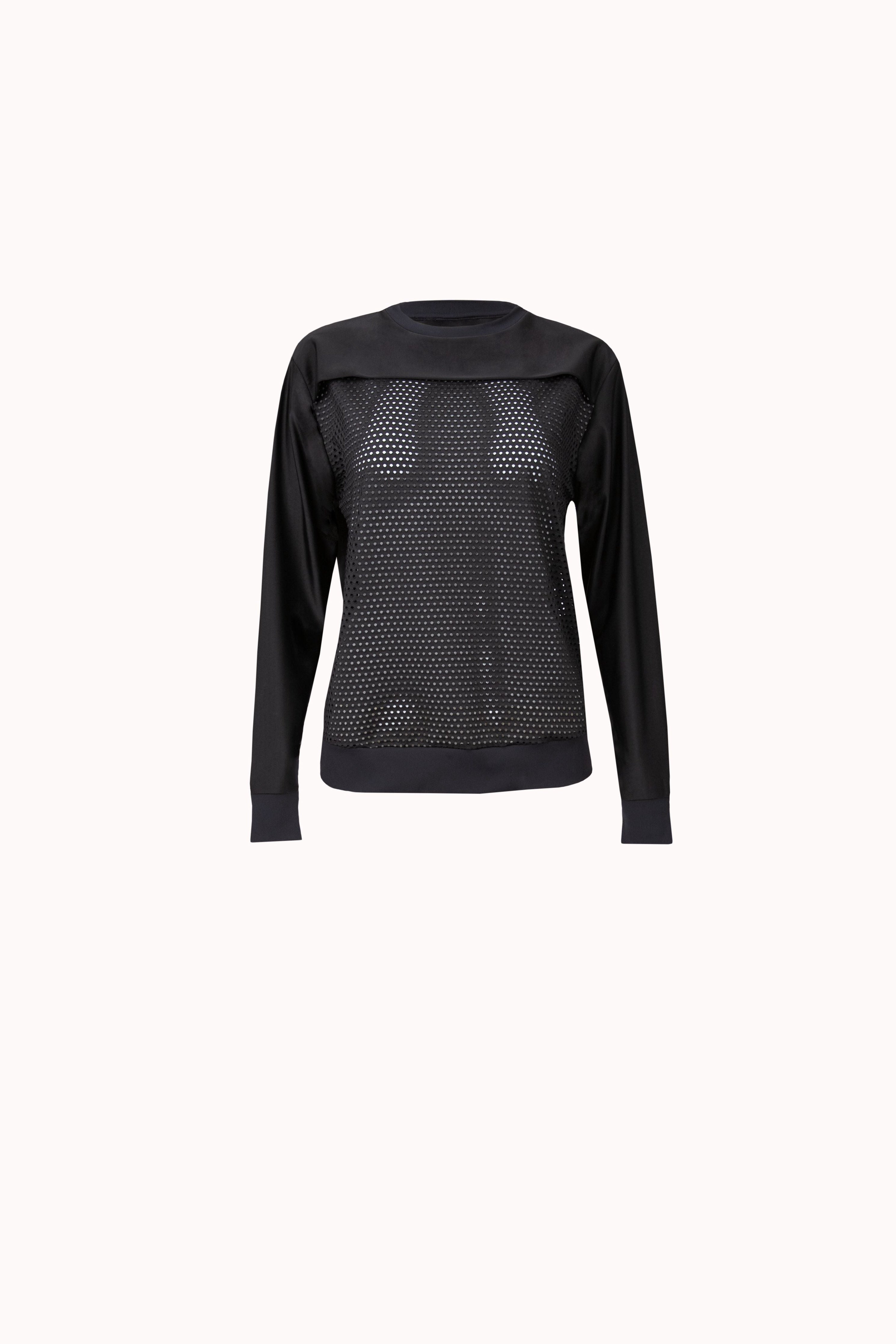 The hybrid concept translated into innovative designs in an interesting and unusual combination of materials, shapes, and functions. Defined by a classic crew-neck, this double jersey sweatshirt is characterized by the technical allure of the knit net detail on the front.