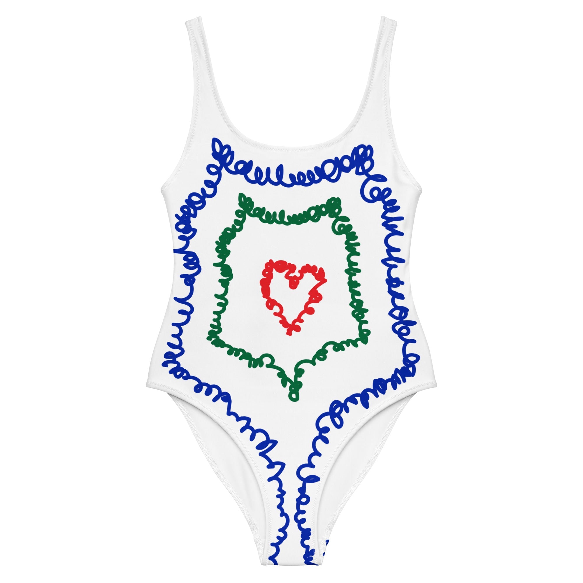 White suit. Hand-drawn lines in blue, green, red. A heart in the centre.