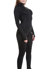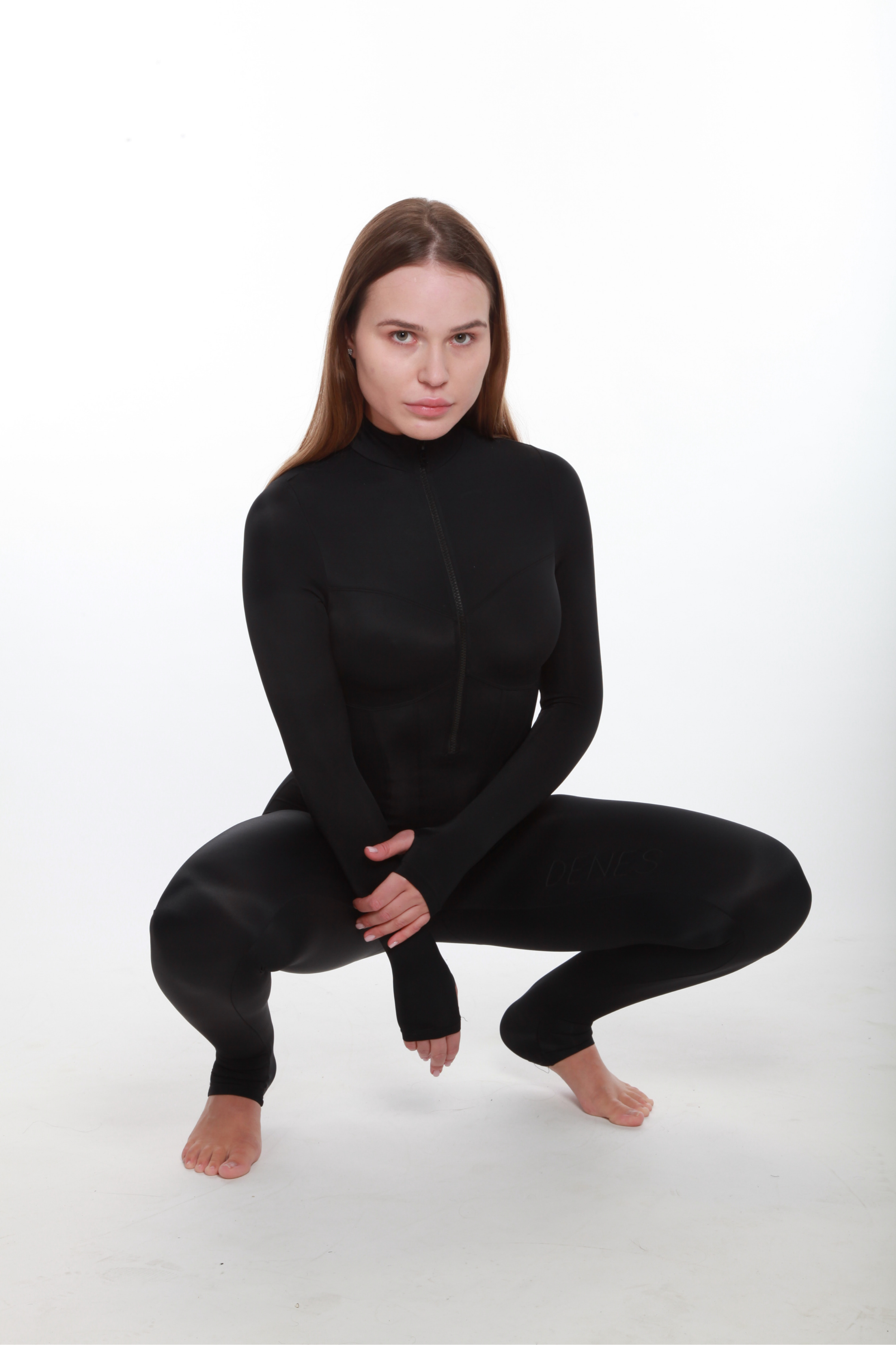 The Lana jumpsuit offers you a perfect balance between softness and curves . Designed in an ultra sophisticated blue-gray color, it combines a long-sleeved cut and pants that sculpt all the legs, for a modern and sheathed silhouette.