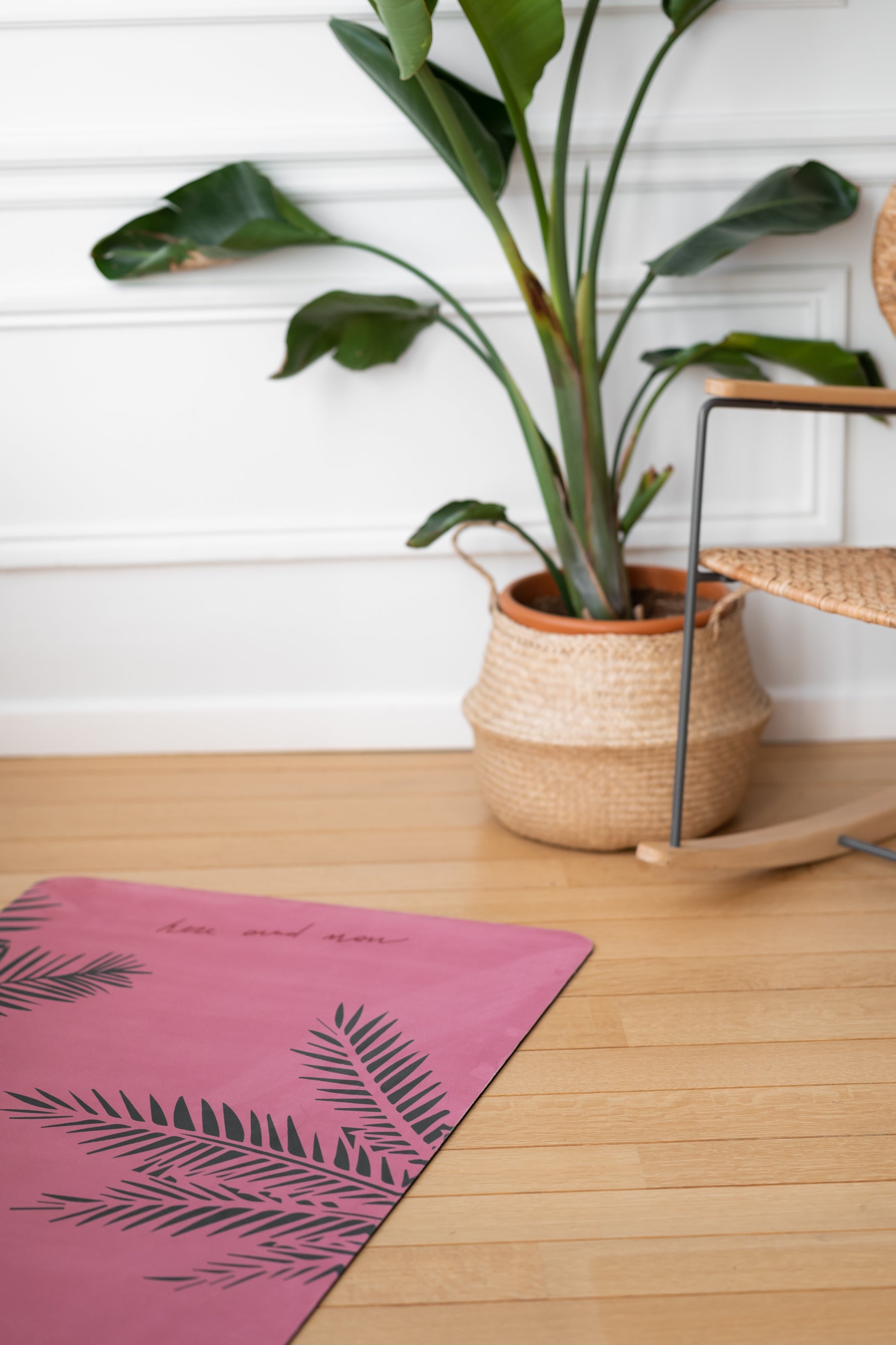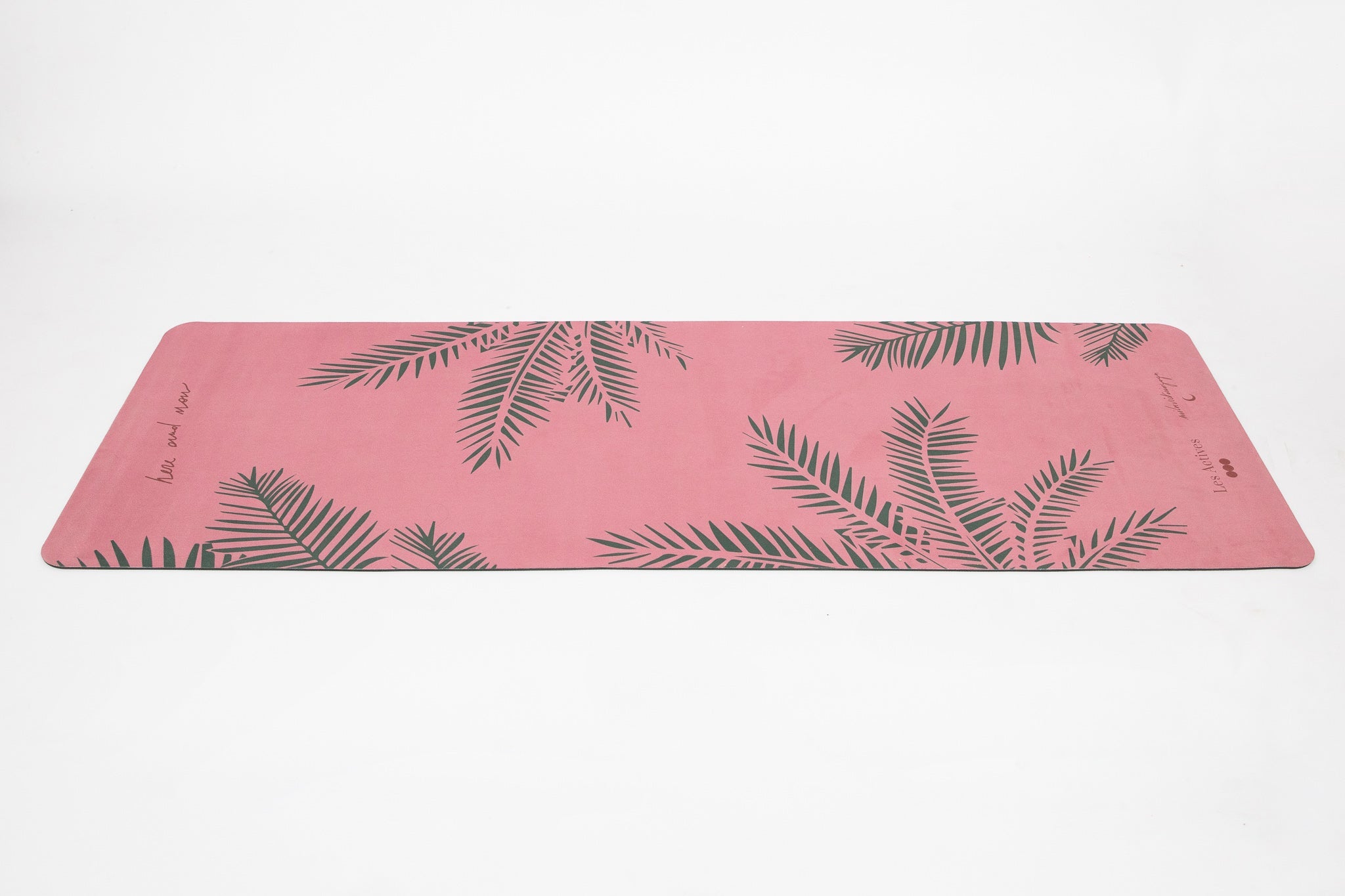 Our palmtree mats are made of natural rubber, recycled microfiber and are printed with water-based inks. The natural rubber coating becomes perfectly non-slip when in contact with perspiration. The mat can slip at the beginning of practice, you can moisten it slightly for optimal grip.