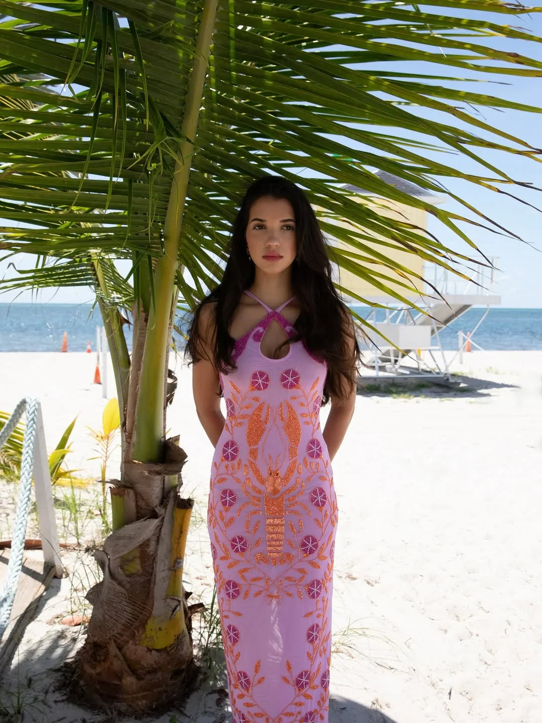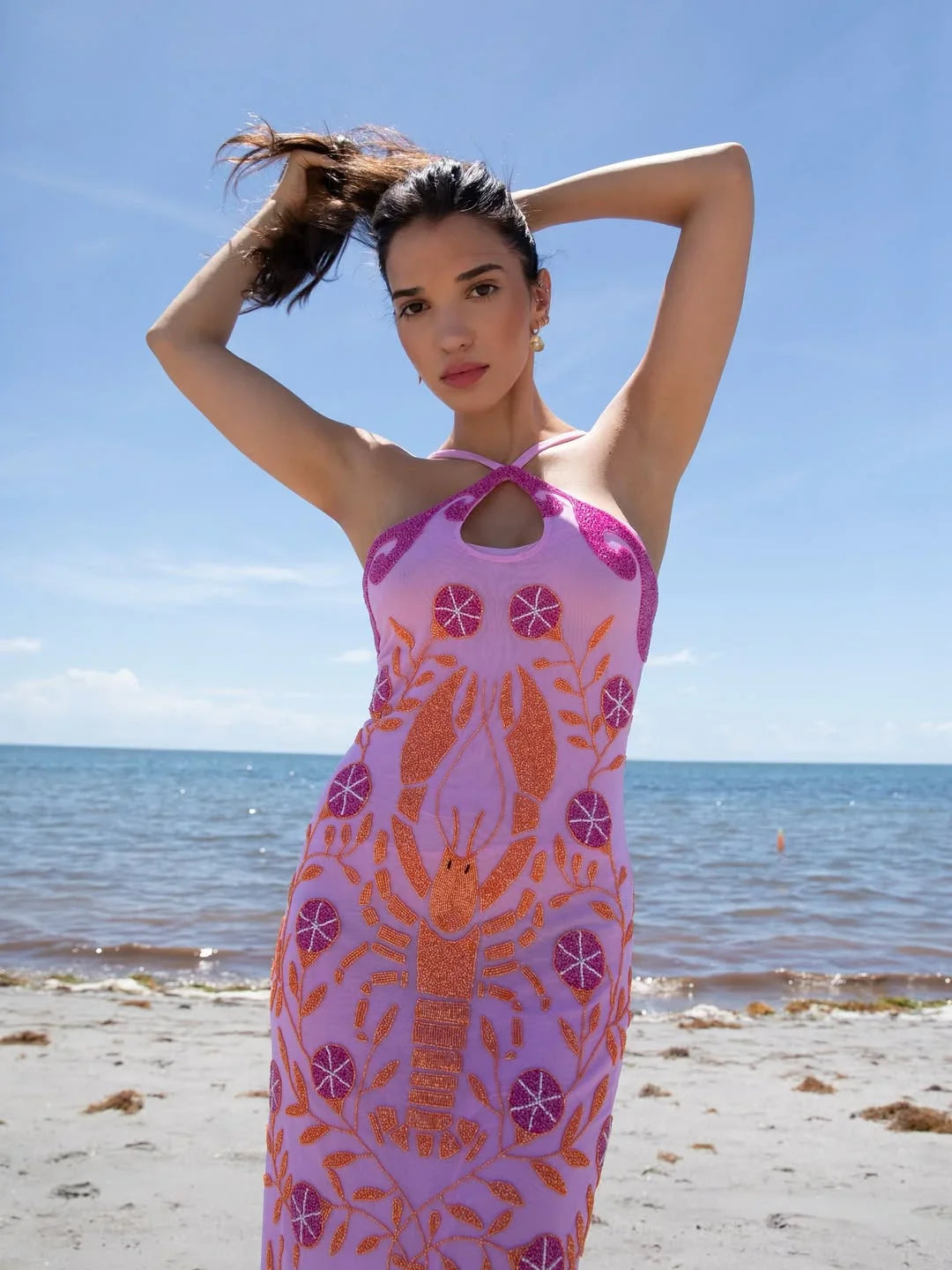 This striking unique Lobster design, bringing a playful yet luxurious twist to your wardrobe. The intricate beadwork creates a stunning focal point, with vibrant pink palette hues and subtle metallics that shimmer with every movement. The flattering crossover front adds an elegant, wrapped silhouette, while the intricate lobster motif offers a bold statement of individuality and style. Perfect for making an unforgettable impression.