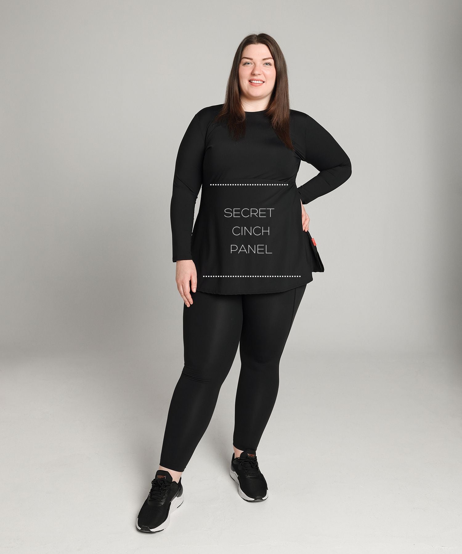 Sculpts the body, lifts and supports so you can work out with confidence. Featuring our unique design cinch panel underneath the top layer, that you can tuck into your leggings giving you the freedom to burpee, jump or give that difficult yoga move a try knowing that you are covered and supported.