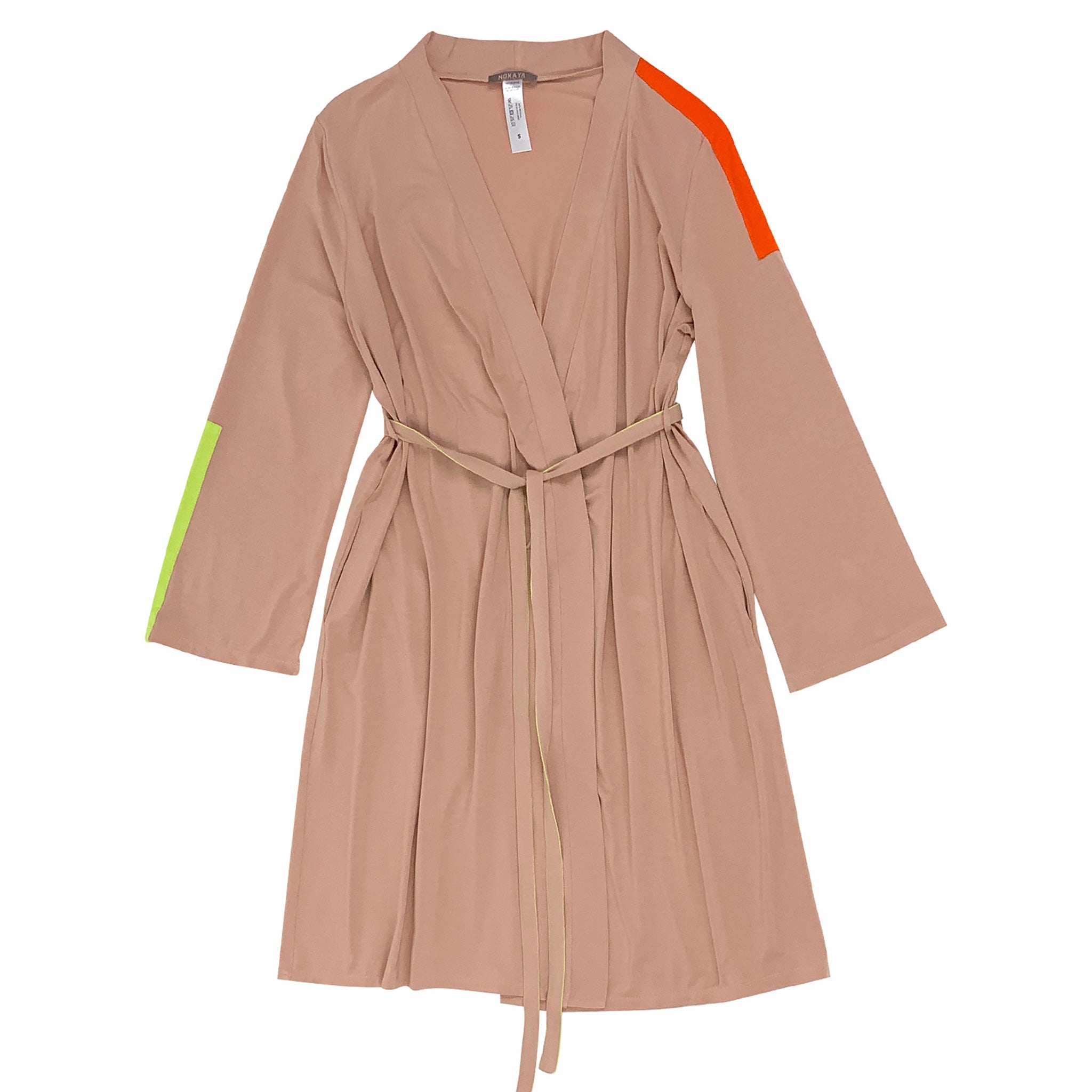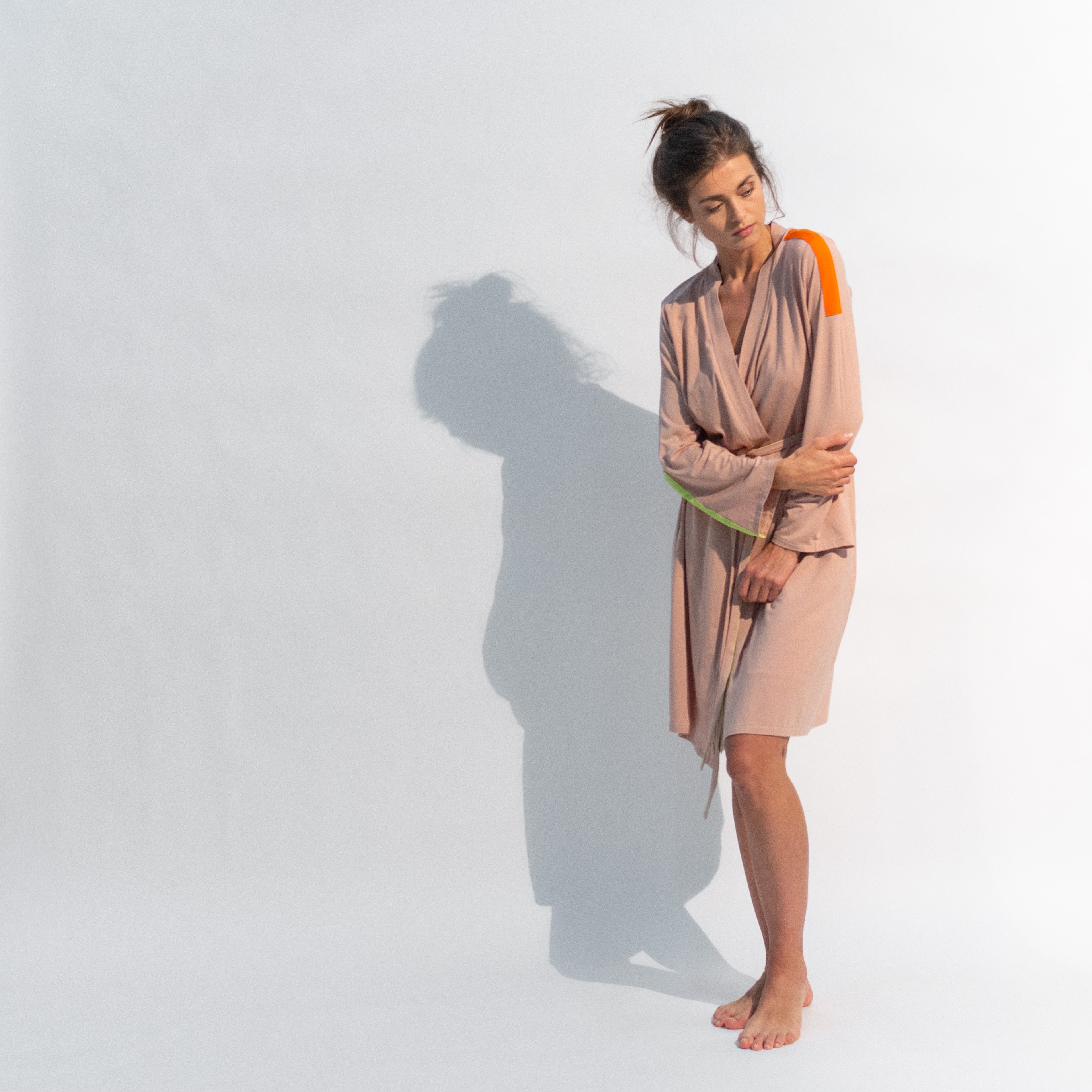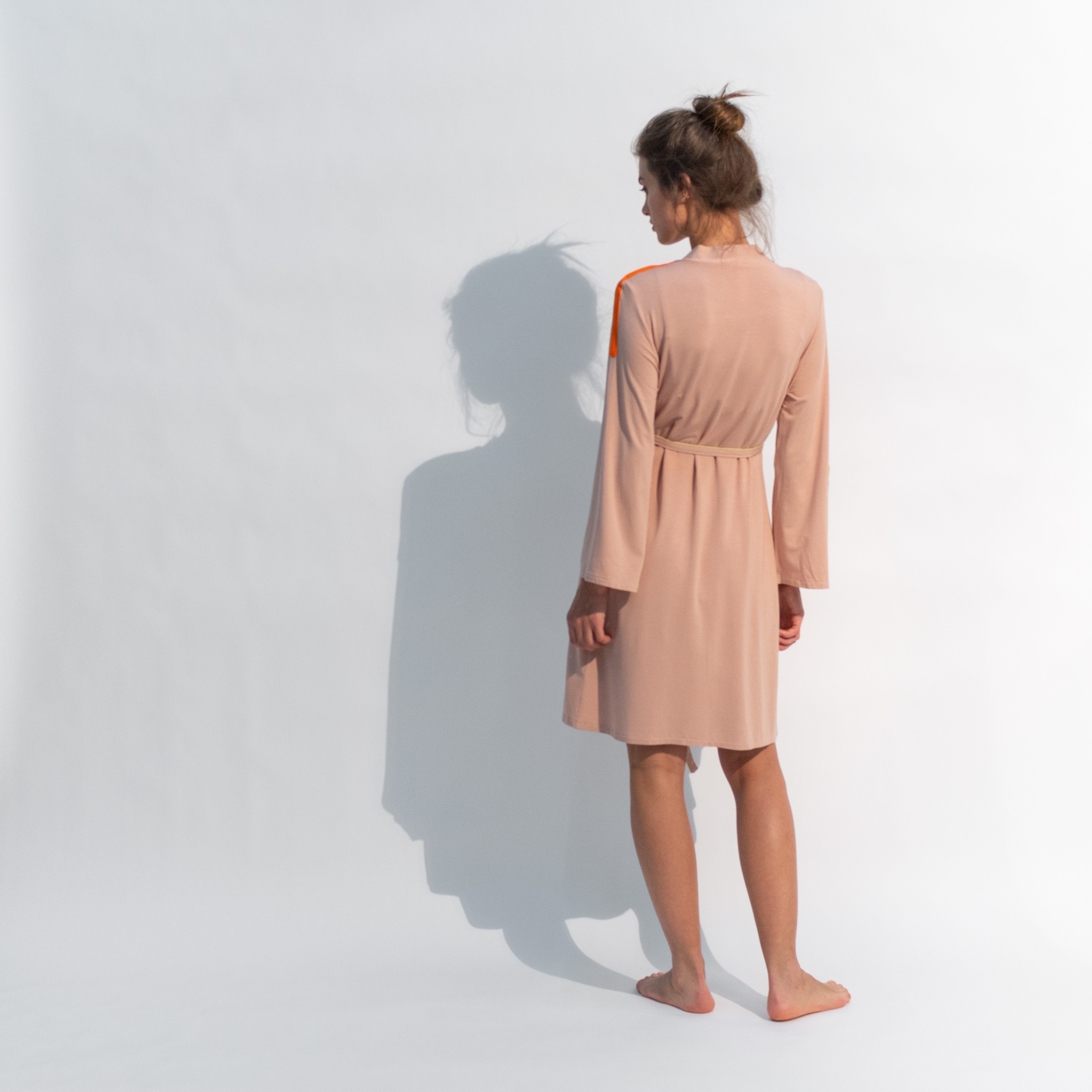 Colour therapy for quality relaxation! The Lovely Break robe is made from a soft Italian jersey from modal in the colour soft sand. The V-neck style is detailed with contrasting bright piping trim and a self-tie belt. Expressive accents in mango and green add character and brighten up the look.