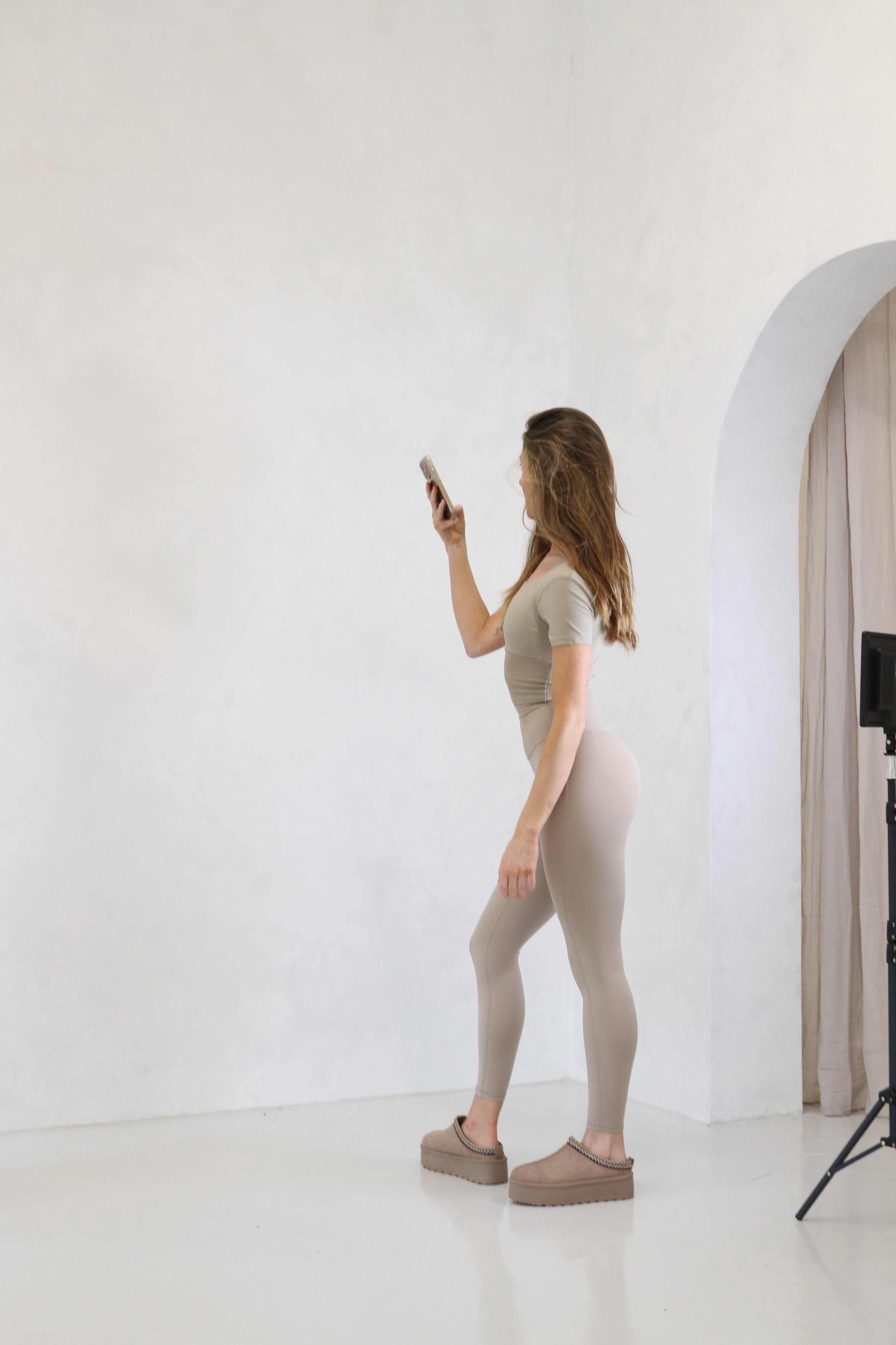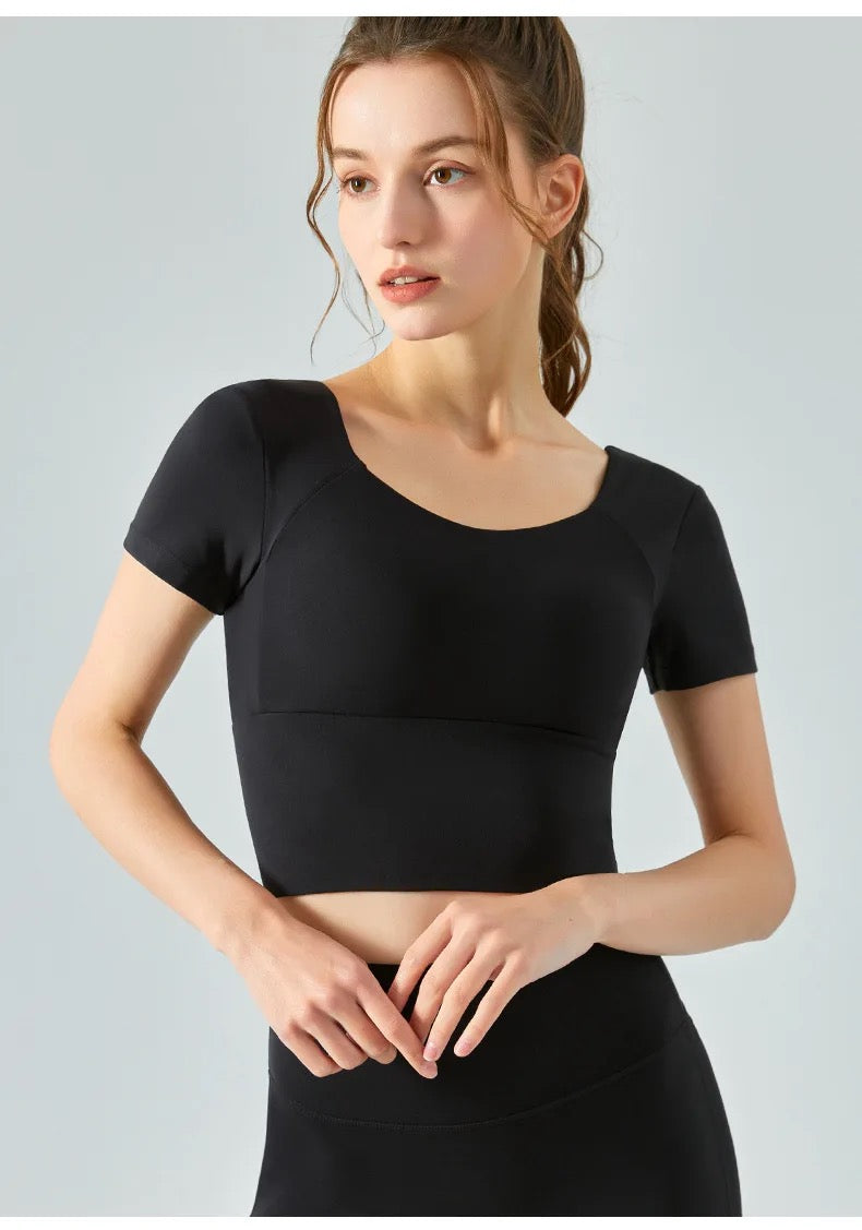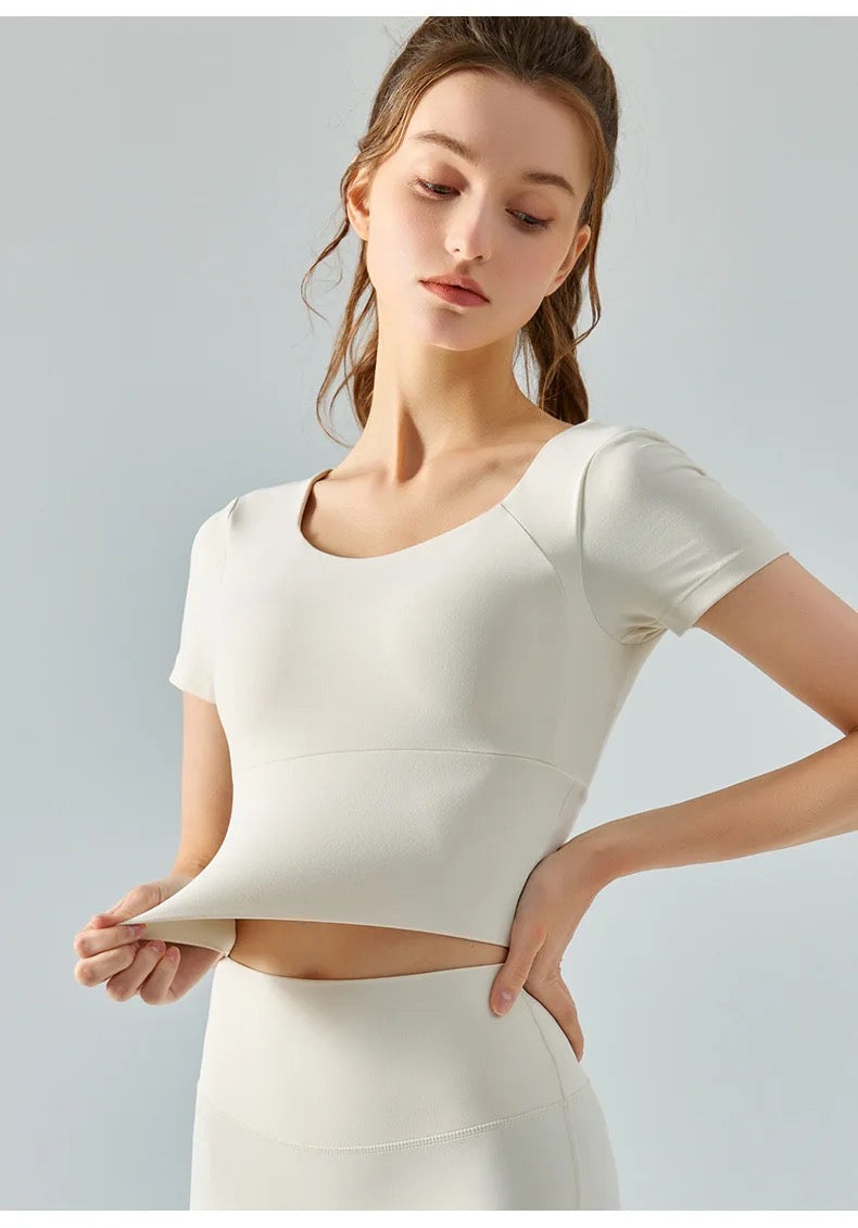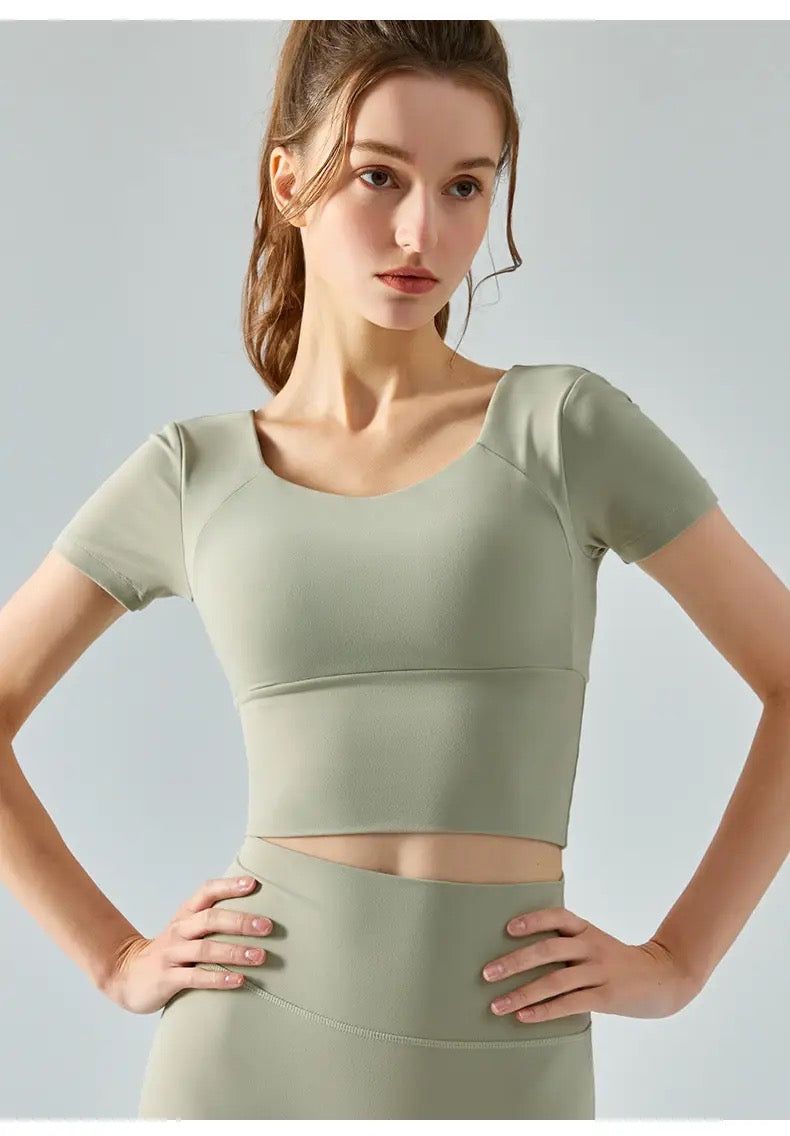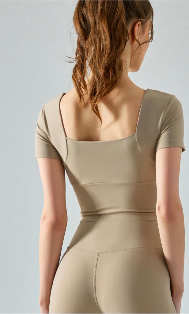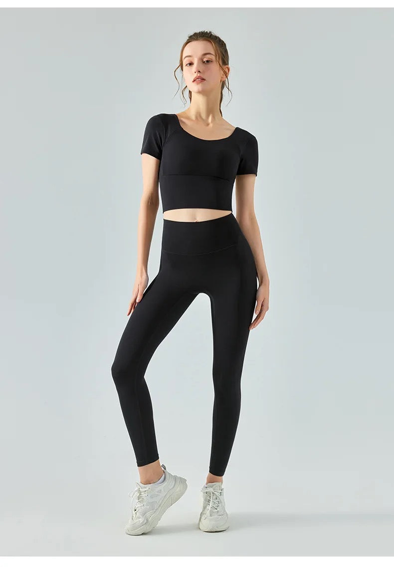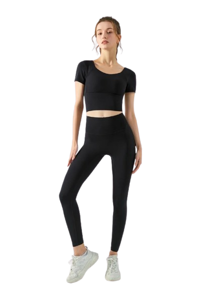 Elevate your activewear with our innovative collagen-infused fabric, featuring UPF50 protection for ultimate style and functionality. This luxurious set includes a flattering short-sleeve crop top with removable padding for customizable comfort and full-coverage leggings for a sleek, elegant look. Perfect for workouts or everyday wear, it offers free movement and timeless sophistication.