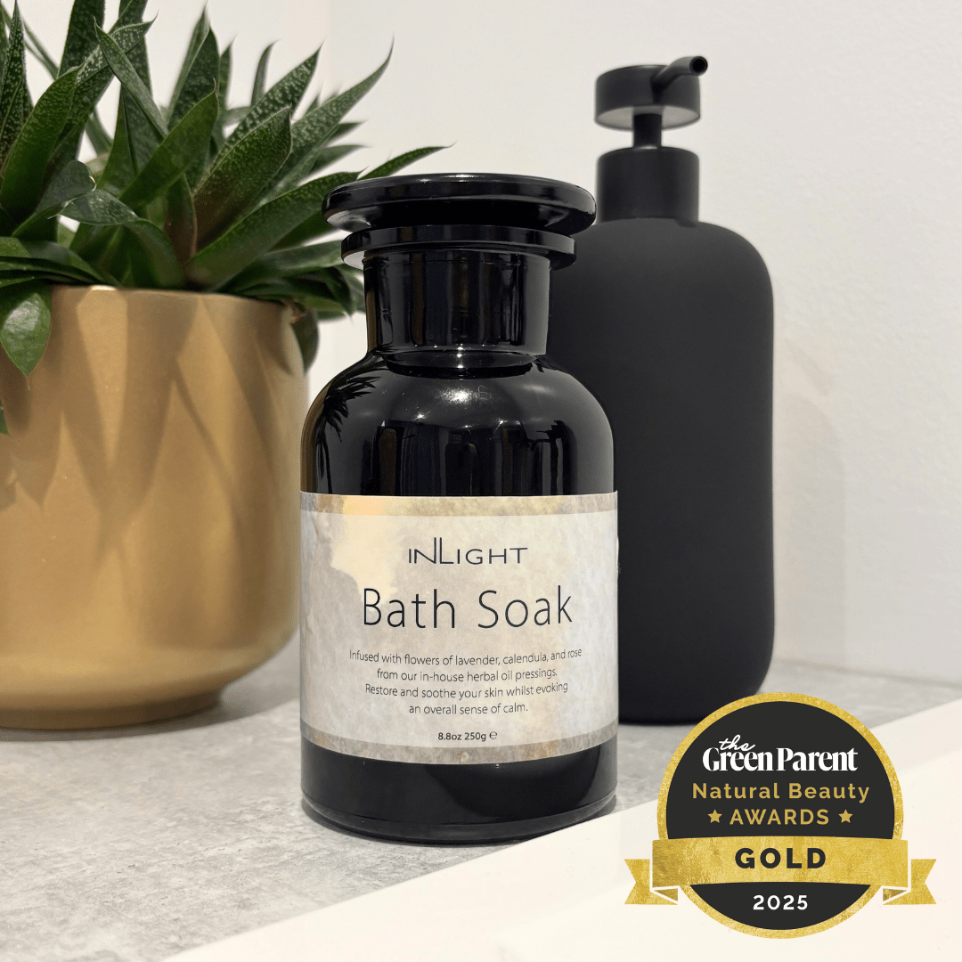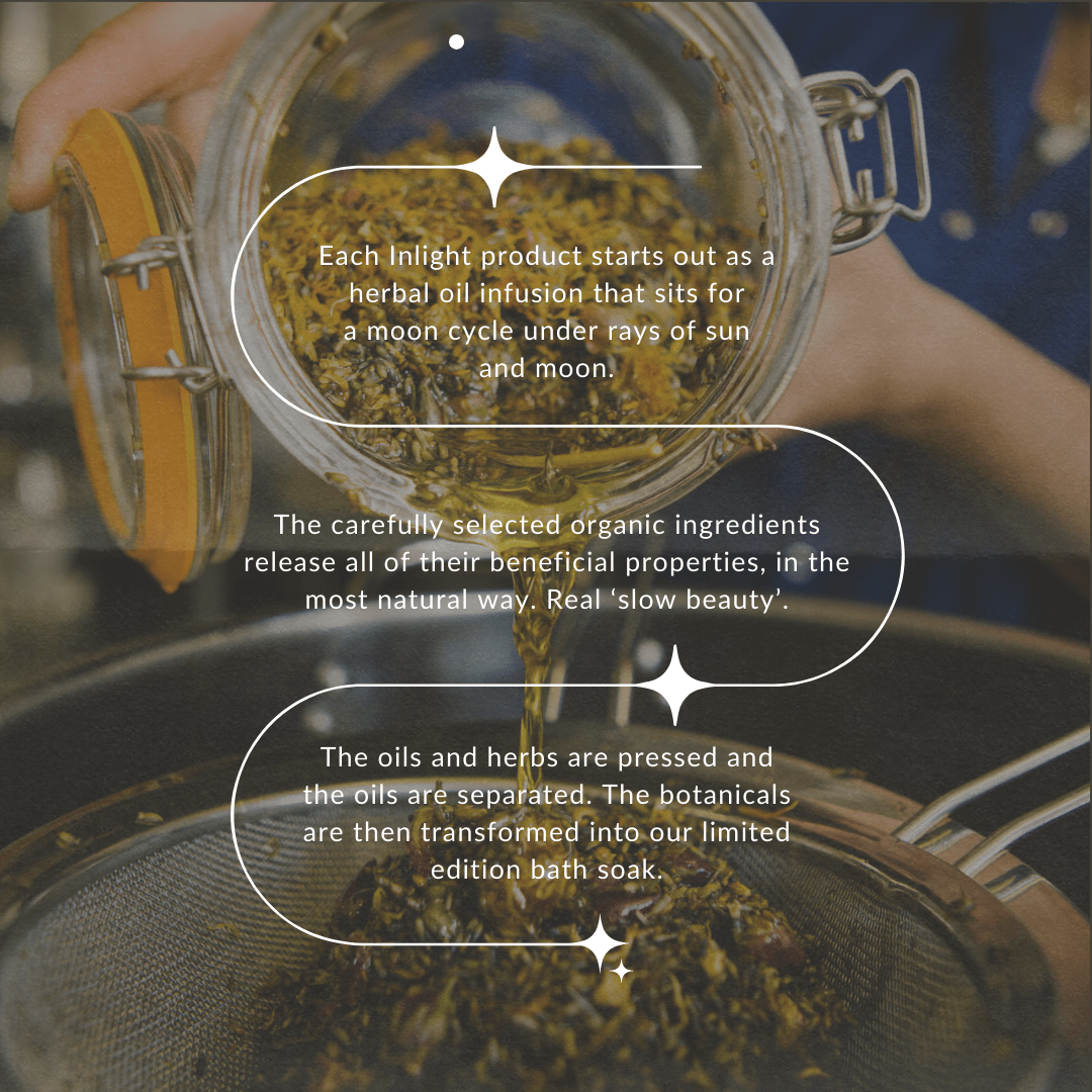 Every Inlight product begins as a herbal oil infusion, left to rest for a full moon cycle beneath the sun and moon — a true slow beauty approach that allows each carefully selected botanical to release its full spectrum of beneficial properties. Once ready, the herbs and oils are gently pressed, ensuring a pure, potent infusion of natural goodness.