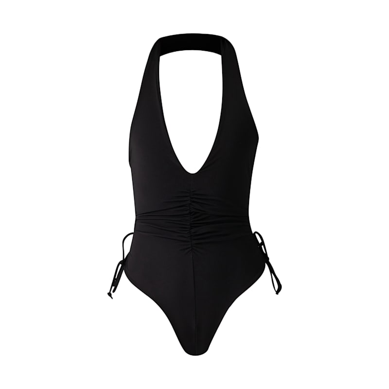 This one-piece swimwear features an elegant cut with a deep neckline and a strap over the neck. The gathered detailing at the waist and side ties create a visual effect that highlights the body’s natural curves. The design offers a blend of minimalist beauty, comfort, and style.