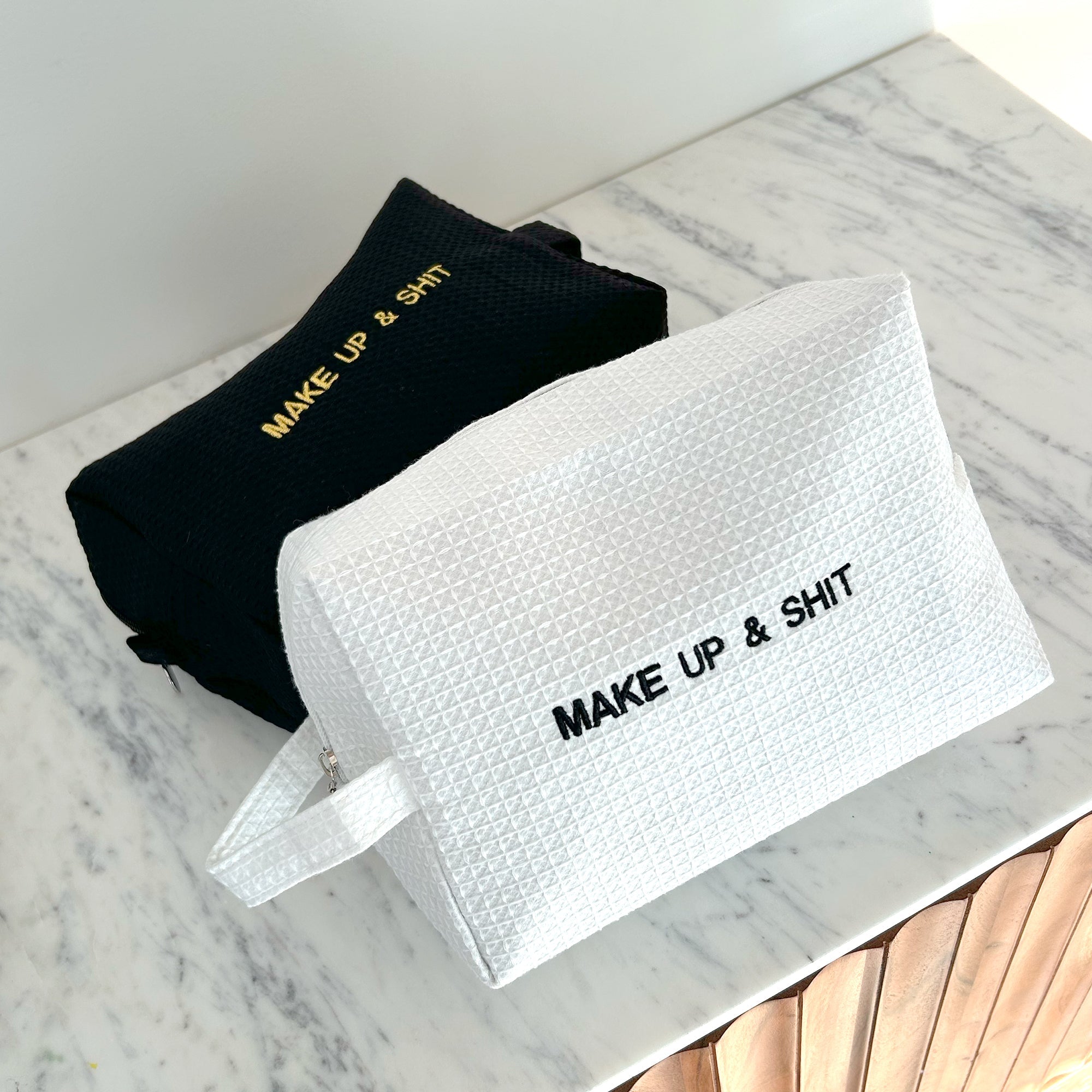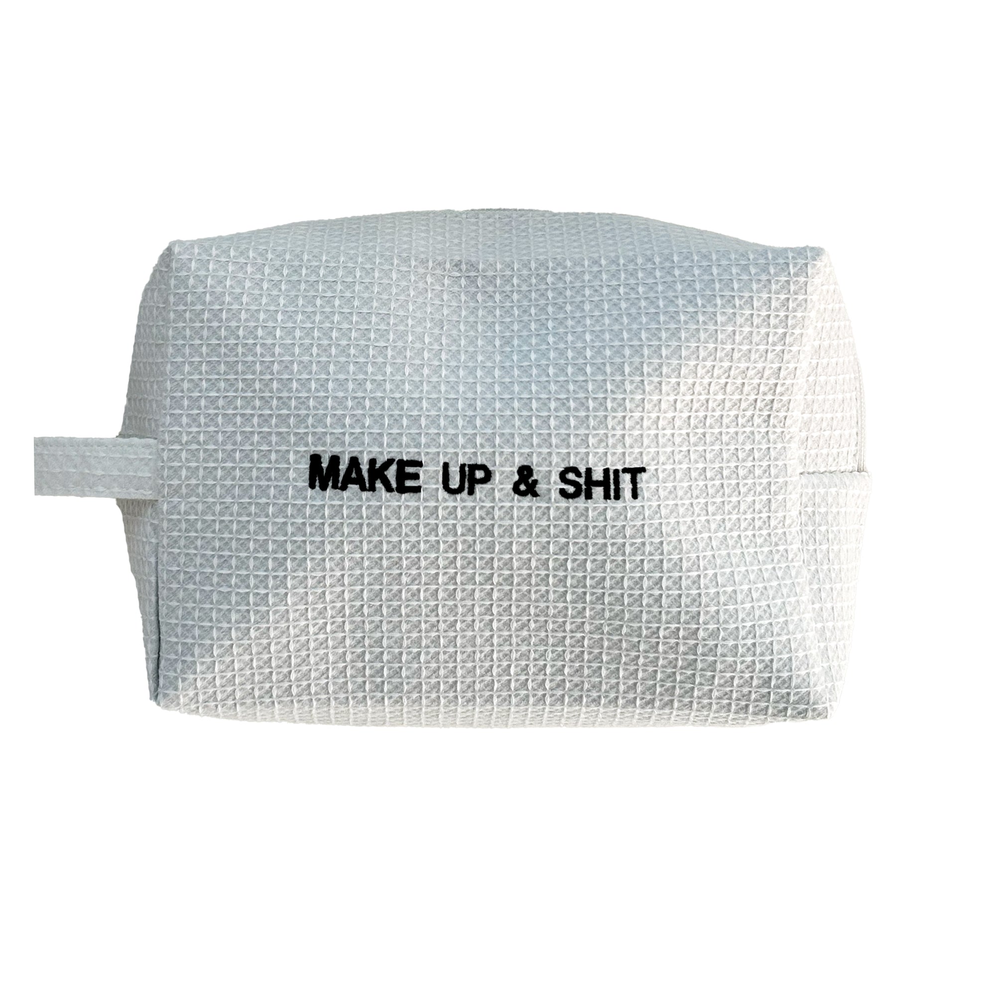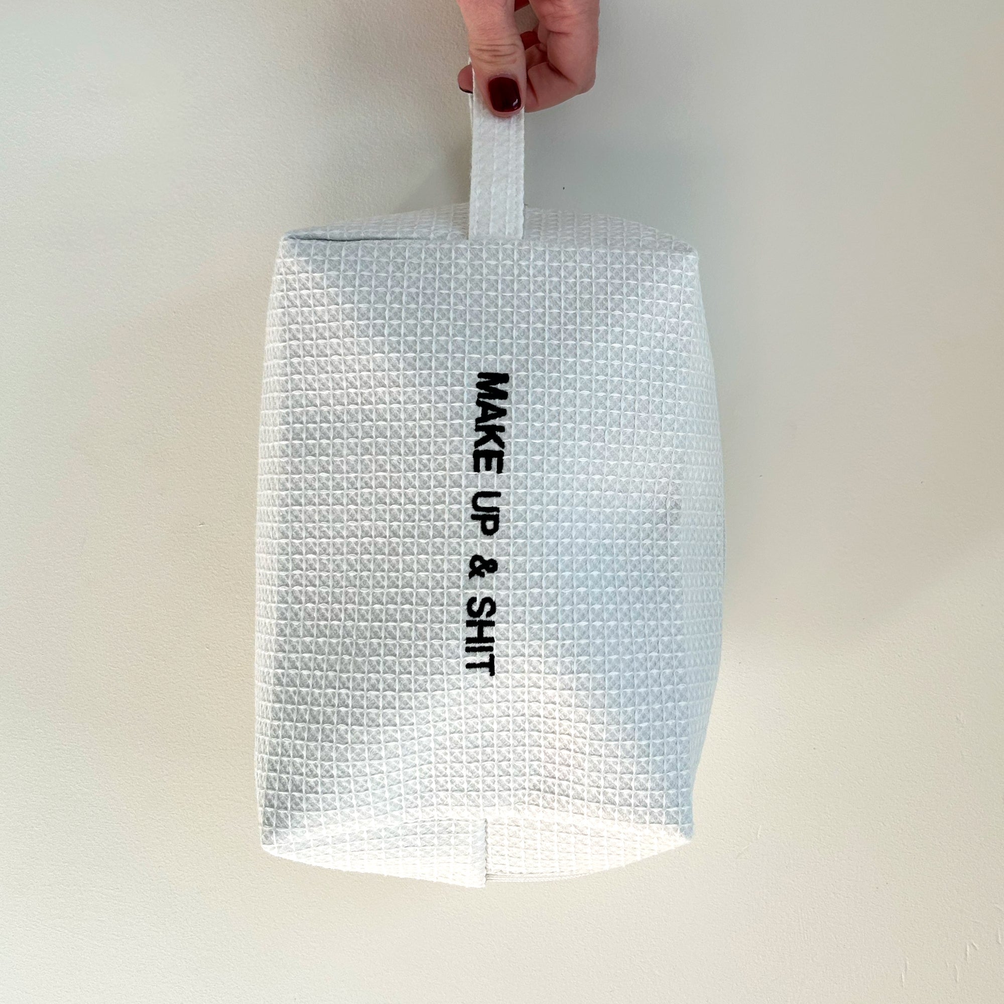 Embroidered Monogramed Waffle cosmetic bag stitched in our London based studio.