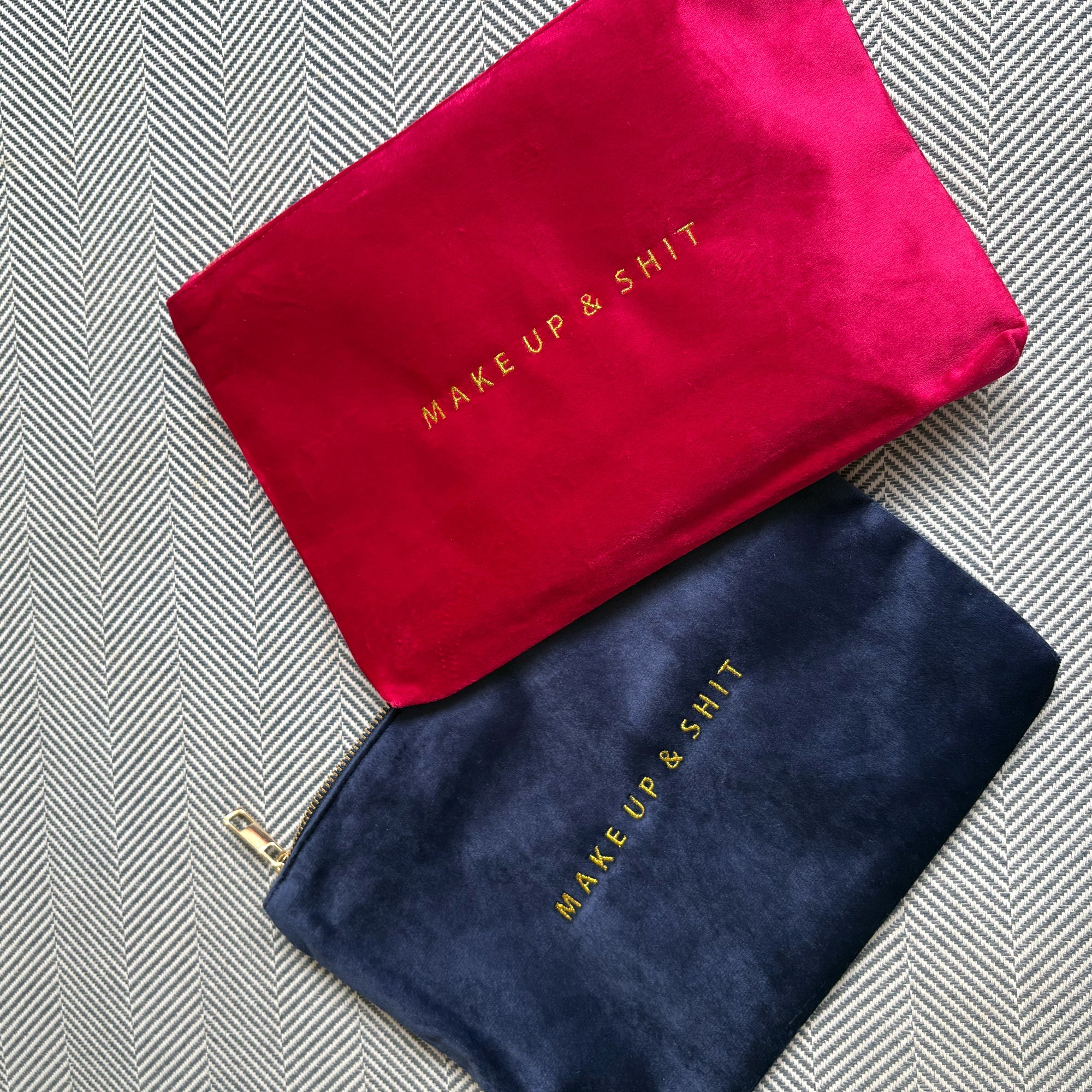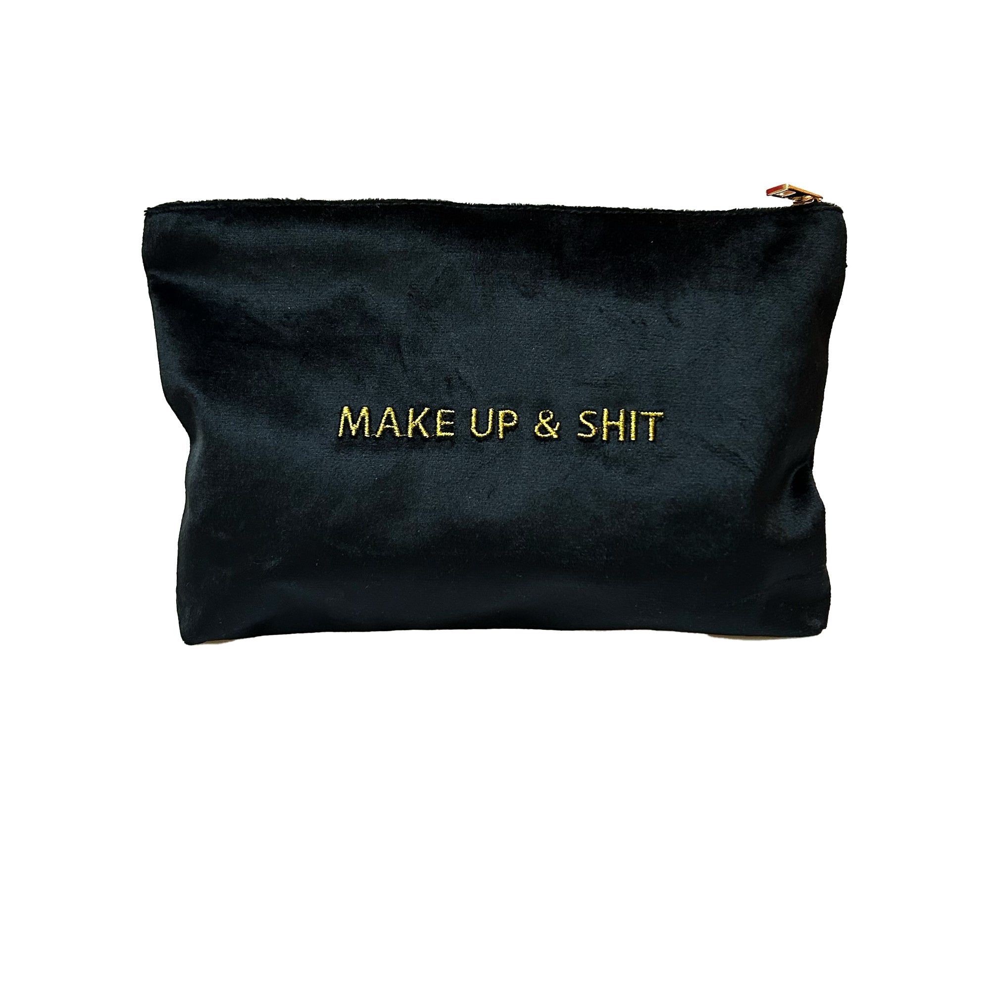 Give her a reason to smile with our Make UP & Shit cosmetic Bag! This embroidered pouch is perfect for storing her favorite essentials and every day must-haves in style. Crafted with gold embroidery and personalized initials that can be added on the other side, it's the ideal gift for her birthday, bridal shower, or any special occasion.