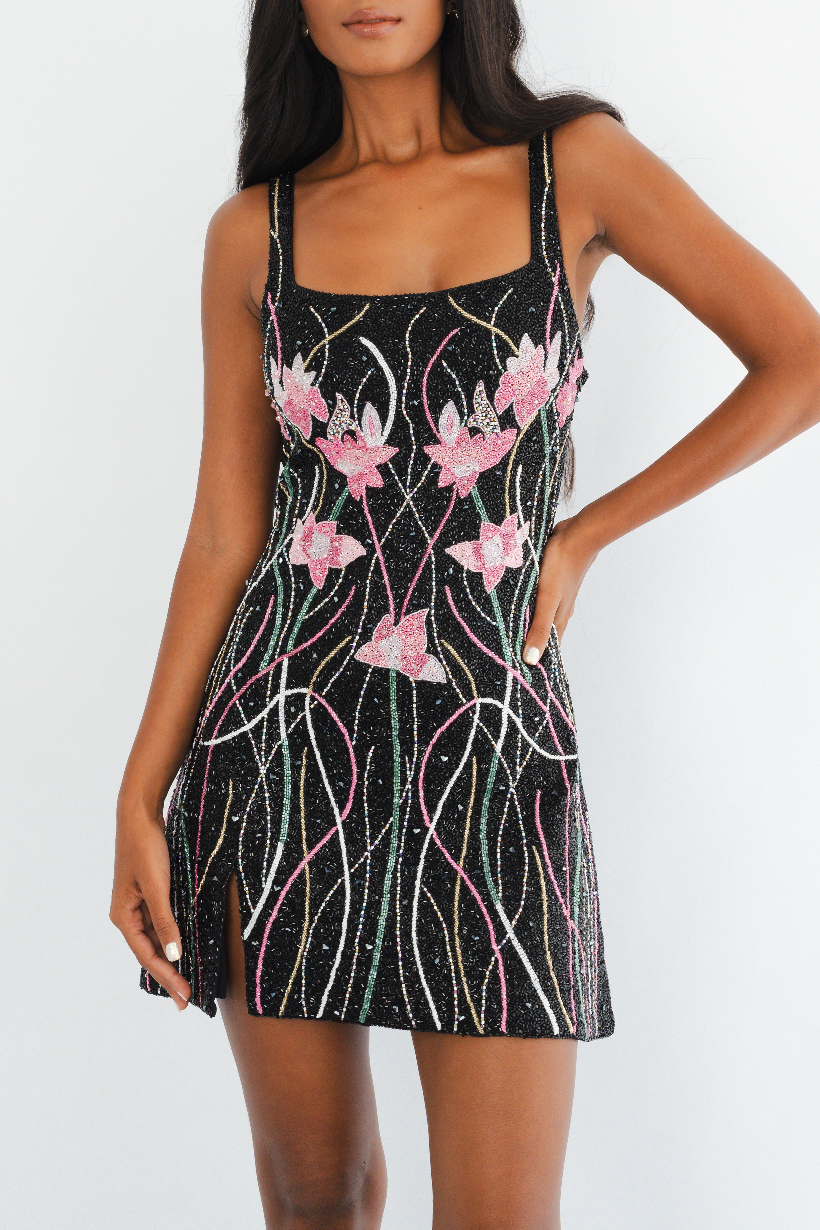 The Chic Mini Malibu Dress features a stunning black and pink floral design, beautifully hand-beaded for added texture and elegance. The Malibu-inspired pattern brings a touch of tropical allure.