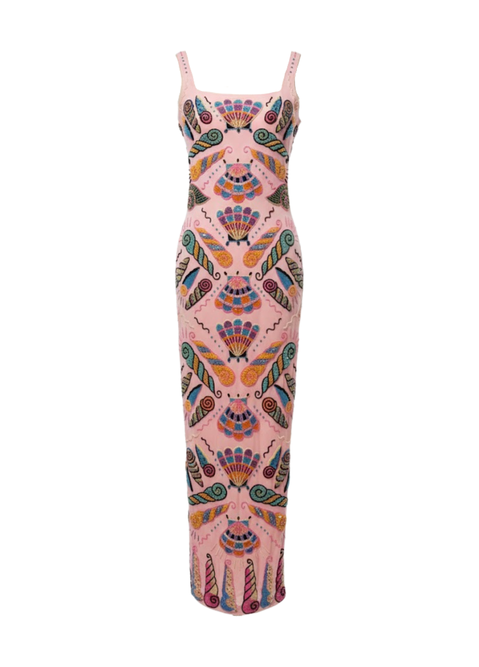 A stunning beaded maxi crafted with Oceanus’s signature hand-embellished detailing. Featuring intricate shell and marine-inspired motifs, this pastel column silhouette offers a sculpted yet comfortable fit. Each bead is meticulously placed to create a vibrant, mosaic-like finish that catches the light beautifully.Perfect for resort escapes, yacht days, and summer evenings where you want to make a statement.