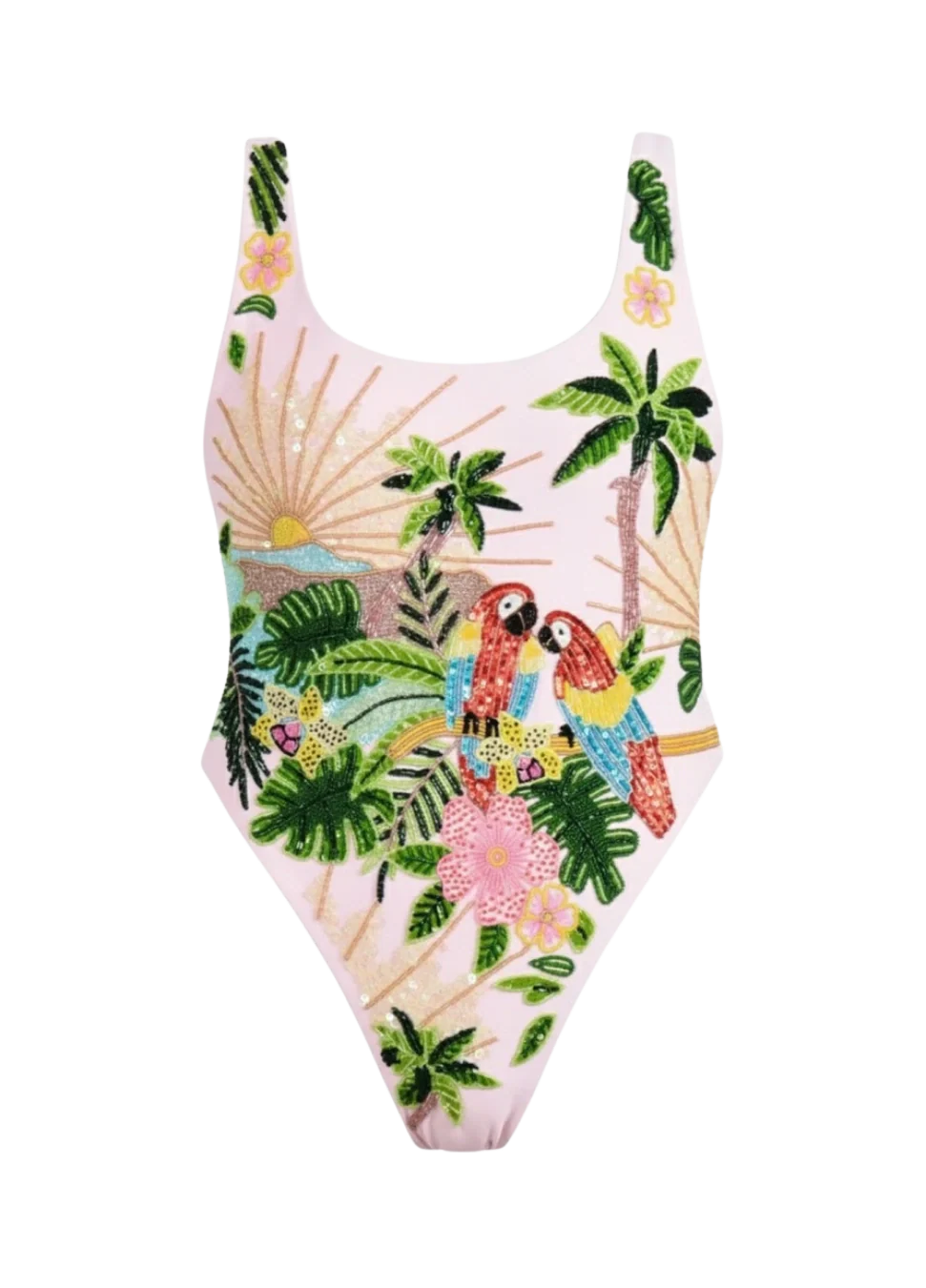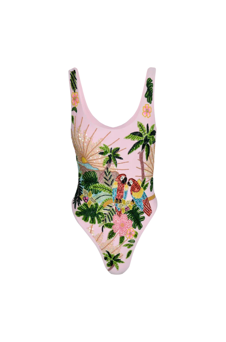 The Maya Scoop Back Tropical Swimsuit in blush pink is a designer one-piece featuring exquisite hand-embroidered tropical motifs. With a chic scoop back and feminine fit, this luxury swimwear piece embodies effortless elegance, making it perfect for summer beachwear, tropical getaways, and poolside lounging.