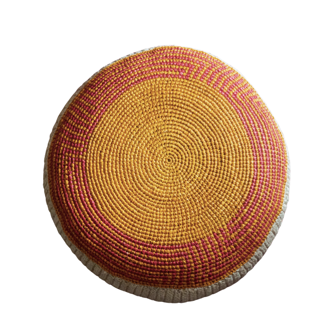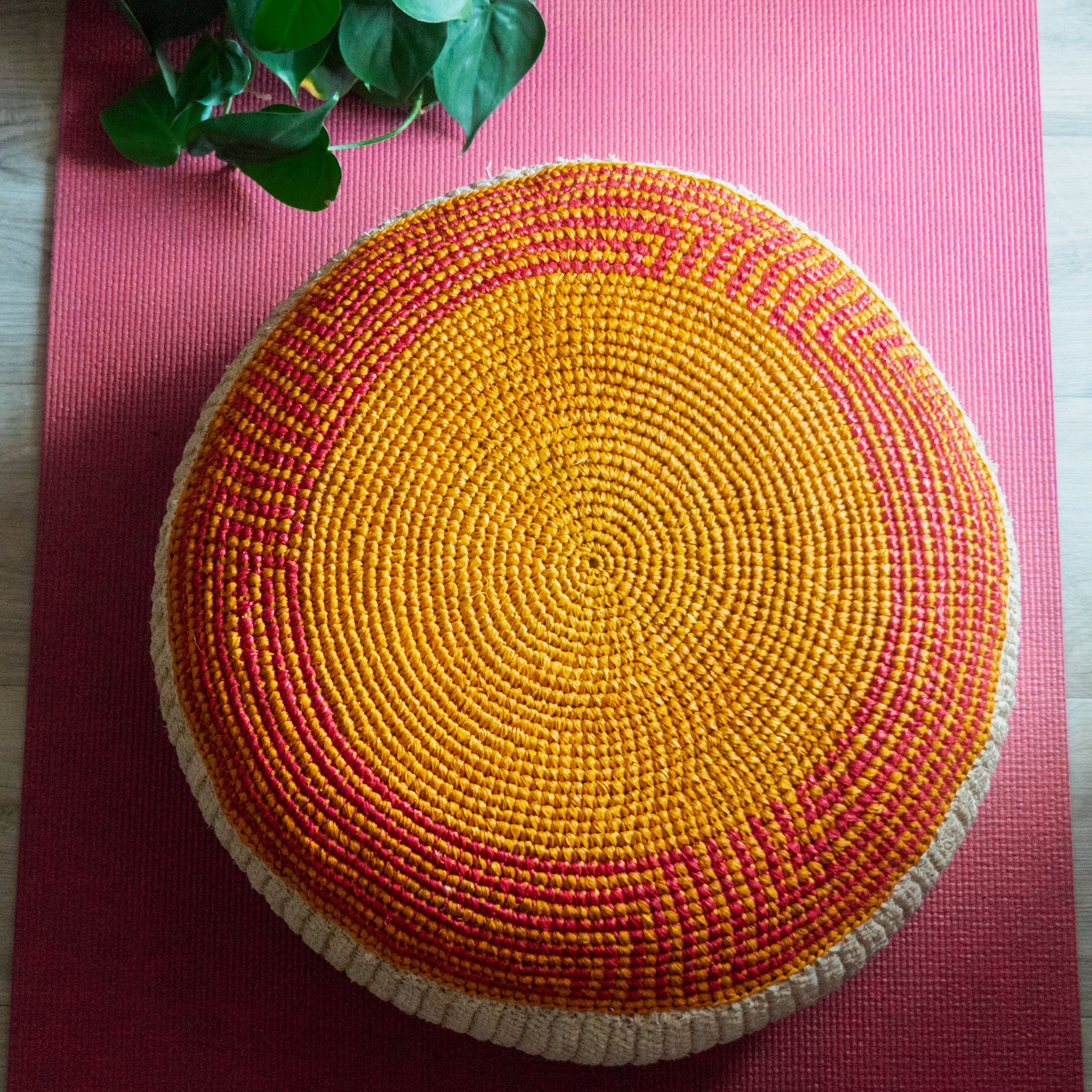 Meditation cushion handmade in Madagascar and filled with organic UK-grown buckwheat hulls or raphia, that can be removed as needed for easy height adjustments.