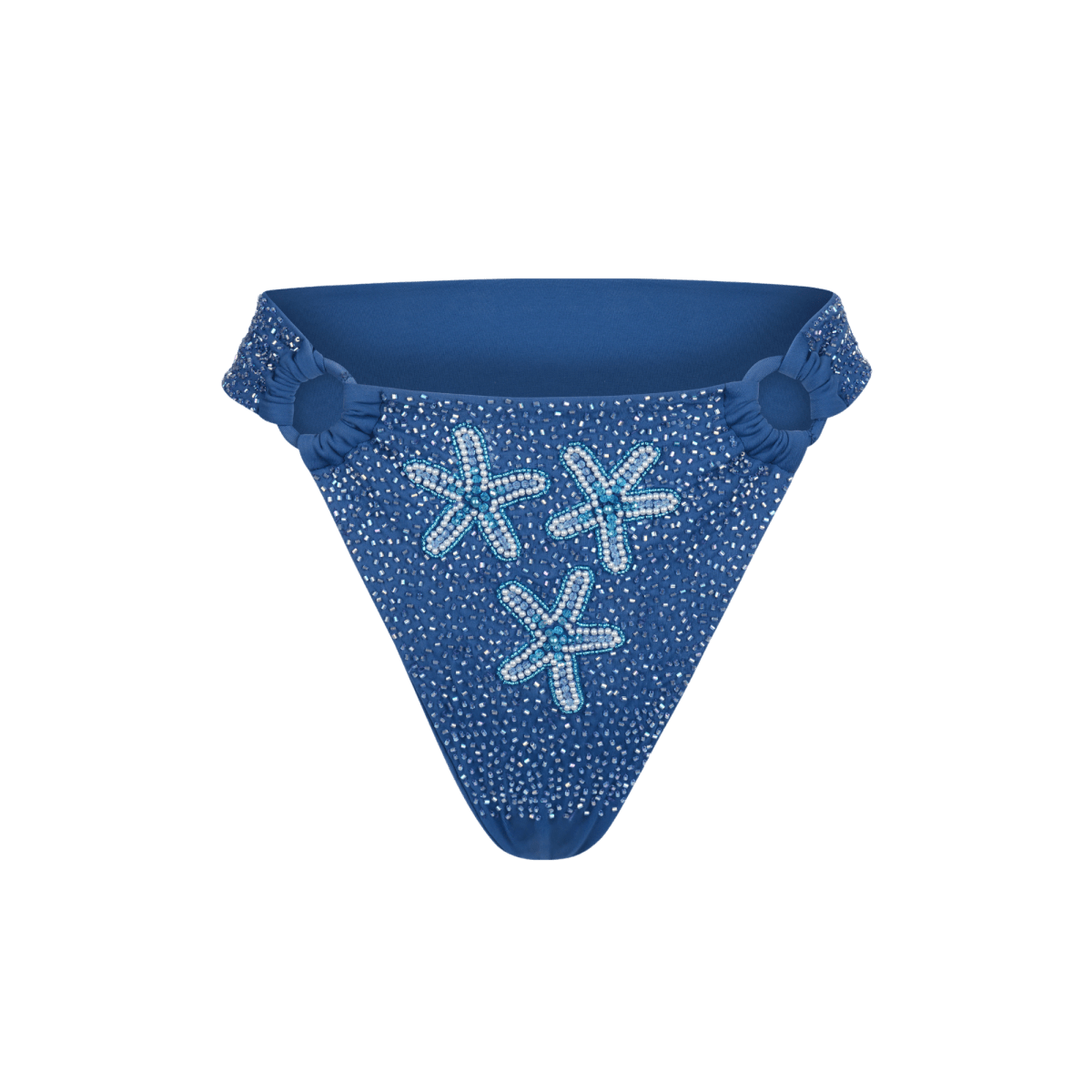 Complete your look with the Mia’s Marina Bikini Bottoms, designed for both comfort and statement style. These high-waisted bottoms feature a flattering cut and signature circular ring accents on each side, echoing the playful elegance of the matching top. Meticulously arranged starfish patterns bring a touch of sophistication and whimsy, making these bikini bottoms perfect for those who love refined details with a sense of fun.
