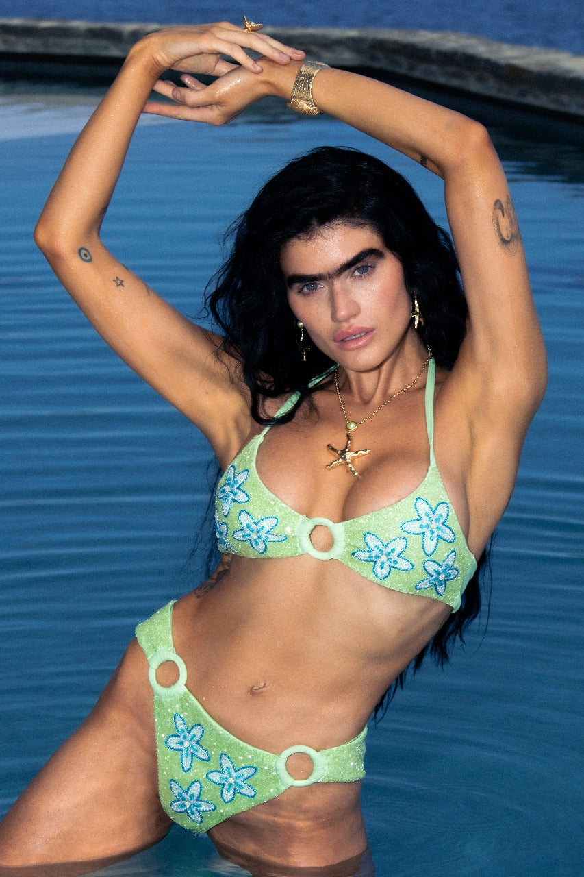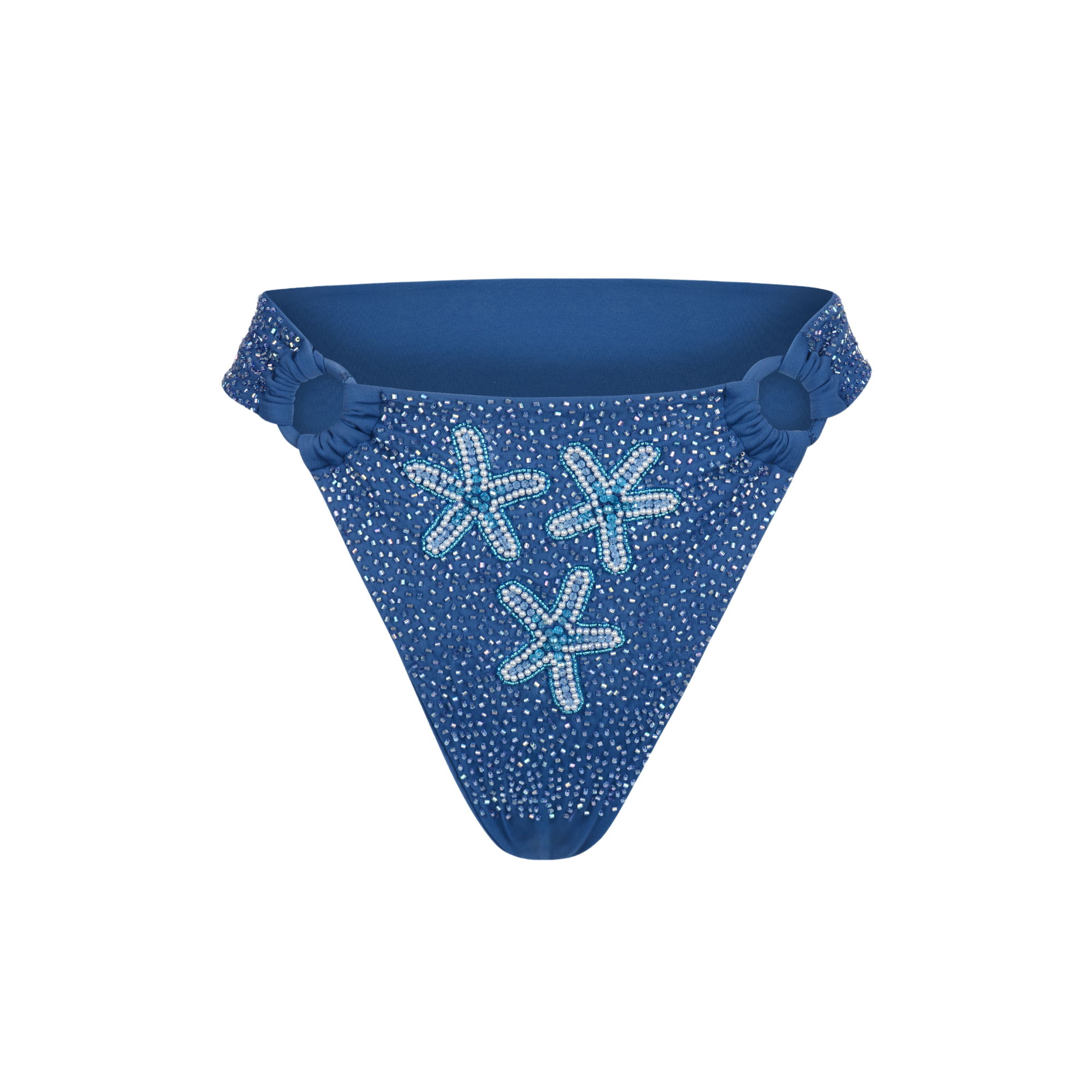 The top is a classic halter style with a mid-cut neckline, enhanced by small circular ring accents that draw attention to the center and add a playful detail. The matching bottoms are high-waisted with a flattering cut, also featuring ring details on the sides, ensuring both comfort and style. The starfish patterns are meticulously arranged, giving the bikini a sophisticated yet fun appearance, perfect for making a statement on the beach. The fabric offers a slight shimmer under the sun, making it a standout piece for any seaside adventure.