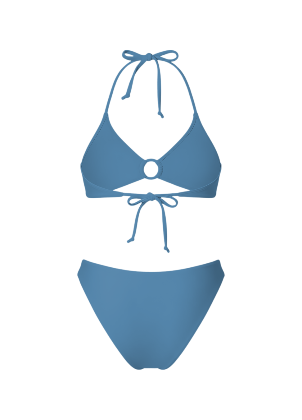 The top is a classic halter style with a mid-cut neckline, enhanced by small circular ring accents that draw attention to the center and add a playful detail. The matching bottoms are high-waisted with a flattering cut, also featuring ring details on the sides, ensuring both comfort and style. The starfish patterns are meticulously arranged, giving the bikini a sophisticated yet fun appearance, perfect for making a statement on the beach. The fabric offers a slight shimmer under the sun, making it a standout piece for any seaside adventure.