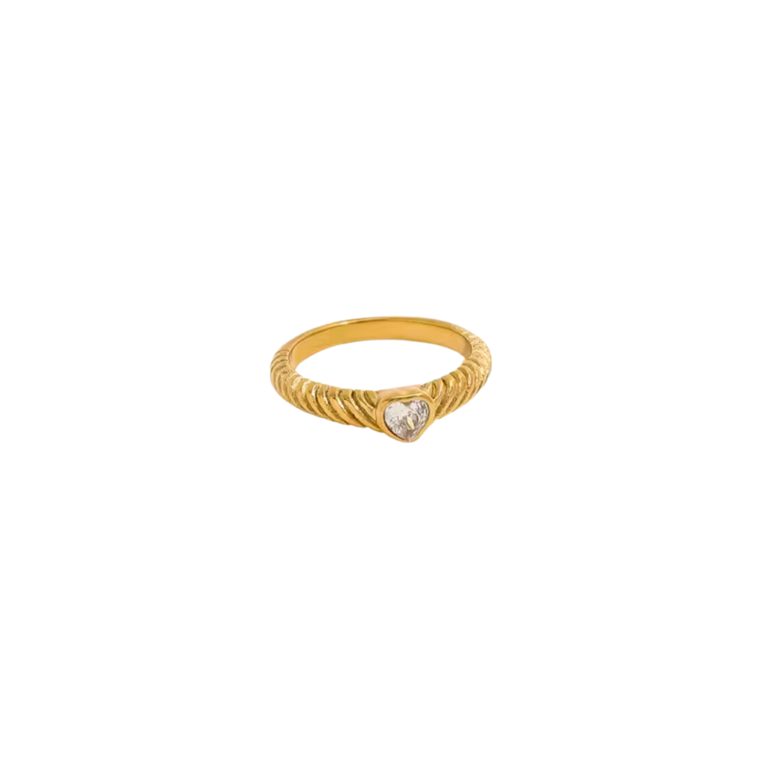 A delicate symbol of love, the Mini Heart Ring is crafted with a textured gold band and a sparkling heart-shaped stone at its center. This timeless piece combines elegance with subtle charm, making it perfect for everyday wear or as a thoughtful gift for someone special. Style it solo for a minimal statement, or stack it with your favorite rings for a layered look that shines.