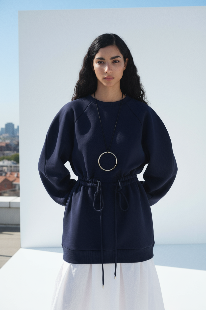 This sporty mini dress features a relaxed top part with a cinched, adjustable waistband that defines the silhouette. Made from 95% cotton and 5% elastane, it’s soft, comfortable, and perfect for everyday wear. A balanced mix of ease and urban style.