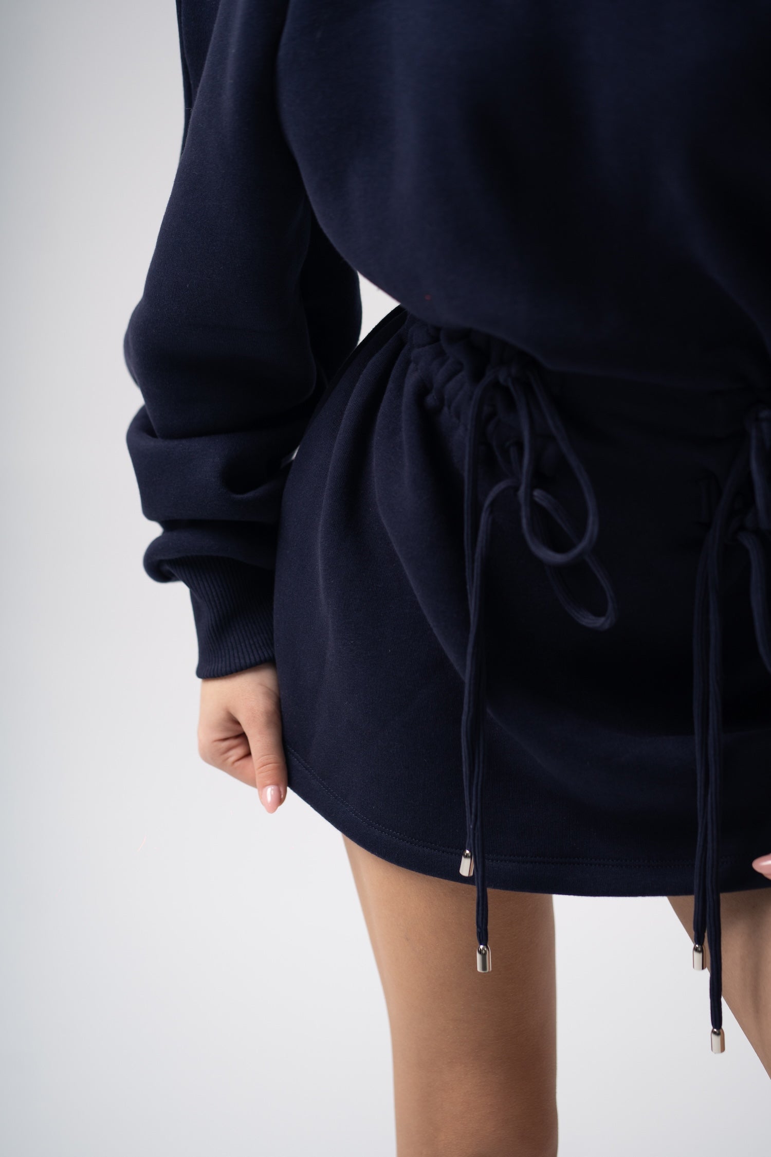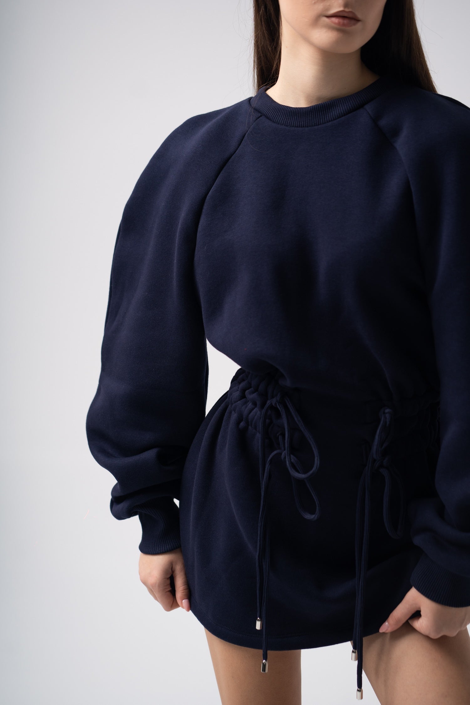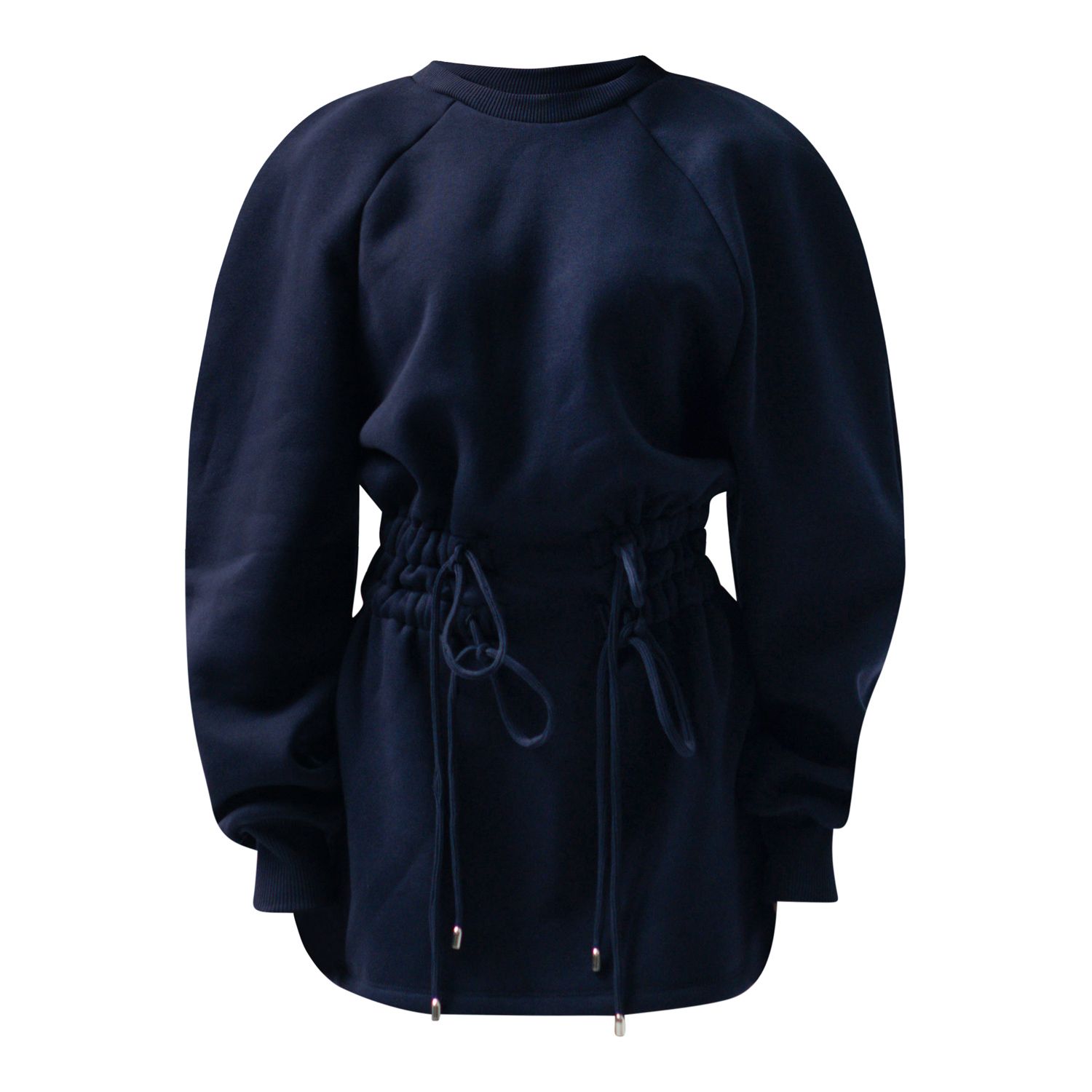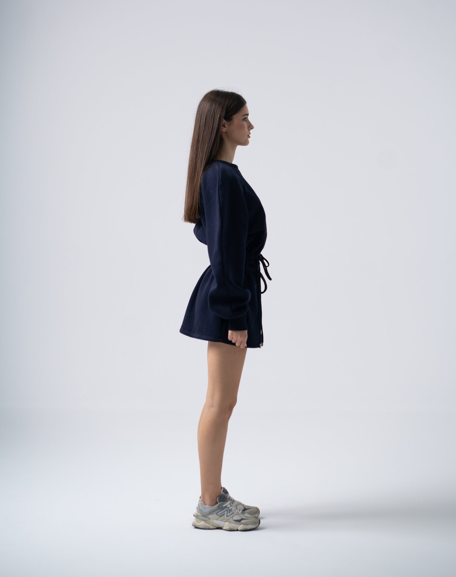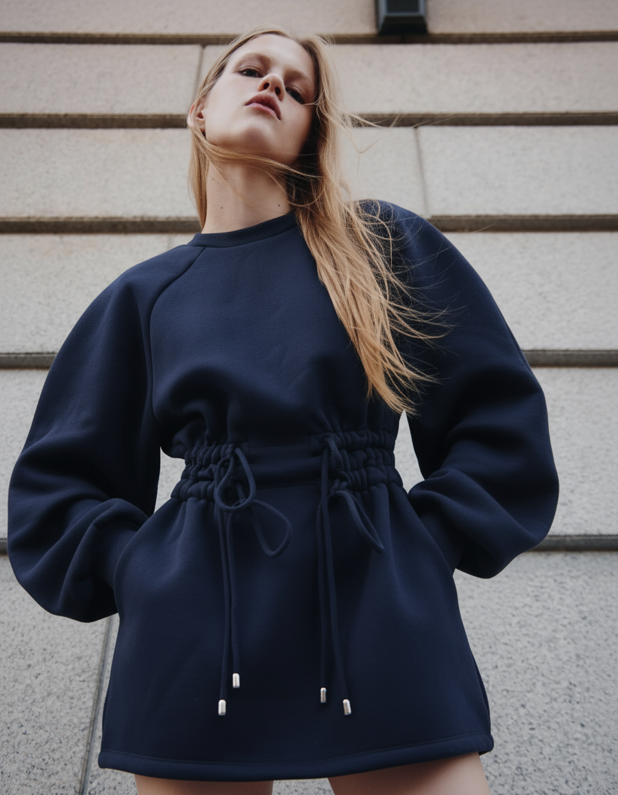 This sporty mini dress features a relaxed top part with a cinched, adjustable waistband that defines the silhouette. Made from 95% cotton and 5% elastane, it’s soft, comfortable, and perfect for everyday wear. A balanced mix of ease and urban style.