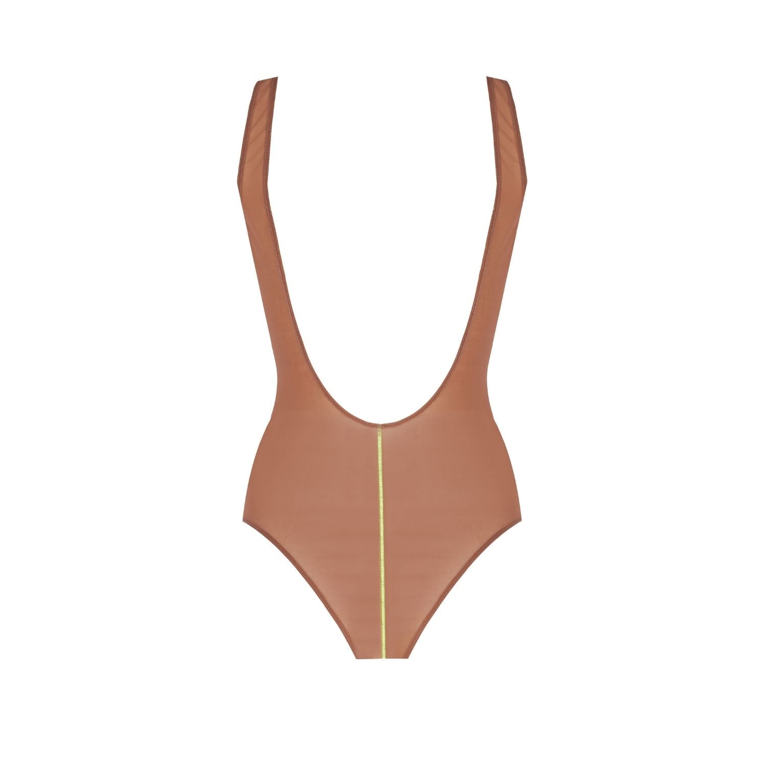 A bold and sophisticated piece, the transparent taupe bodysuit. Designed with underwire cups for support and shaping, this product features a thong-style back. The standout detail is the fluorescent stitching, which adds a modern and playful contrast to the simple taupe color tone.
