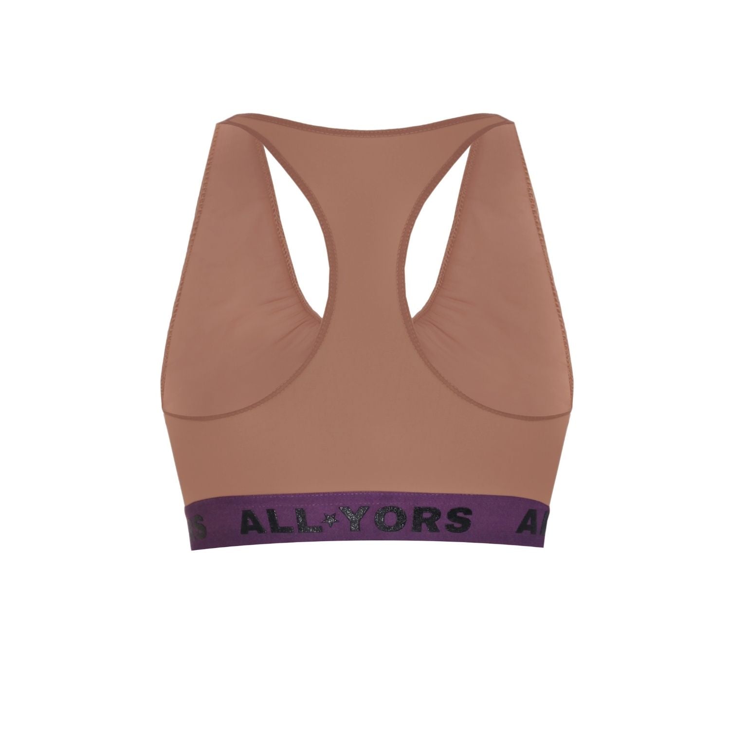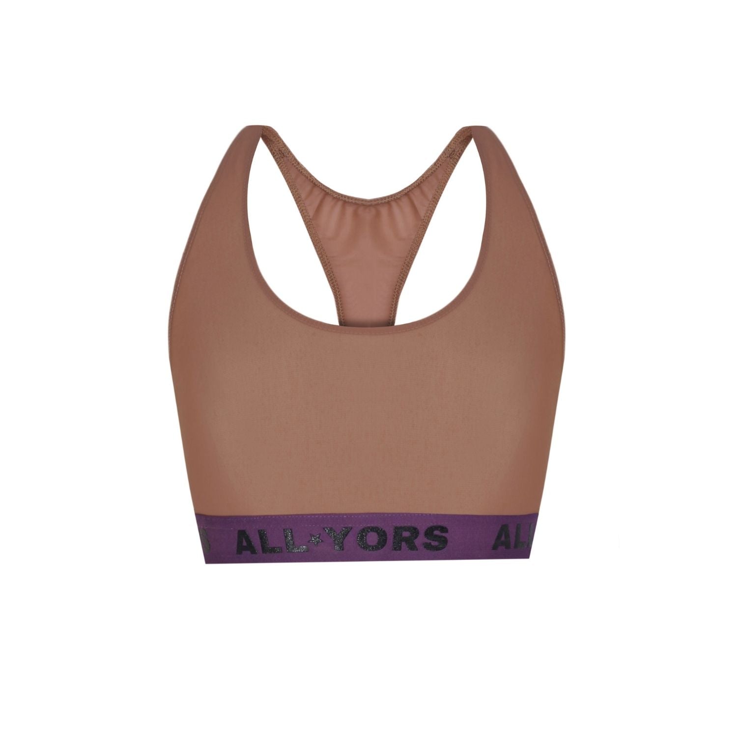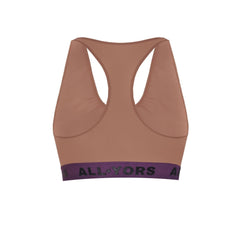 Transparent taupe sports-style bralette with a racerback design. The purple waistband creates a striking contrast against the taupe tone, adding a pop of color. With its minimalist style and lightweight feel, this bra is perfect for daily wear.