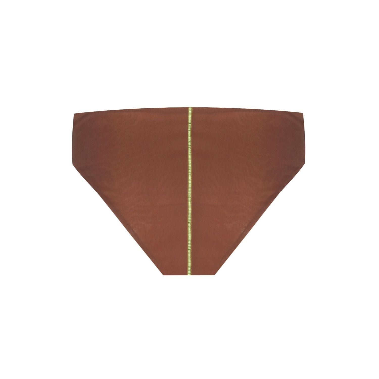 Transparent, taupe-colored double-layered panties. Designed with seamless edges to prevent tightness, it features a cotton gusset for comfort. The fluorescent stitching detail along the center back seam adds a playful, modern touch.