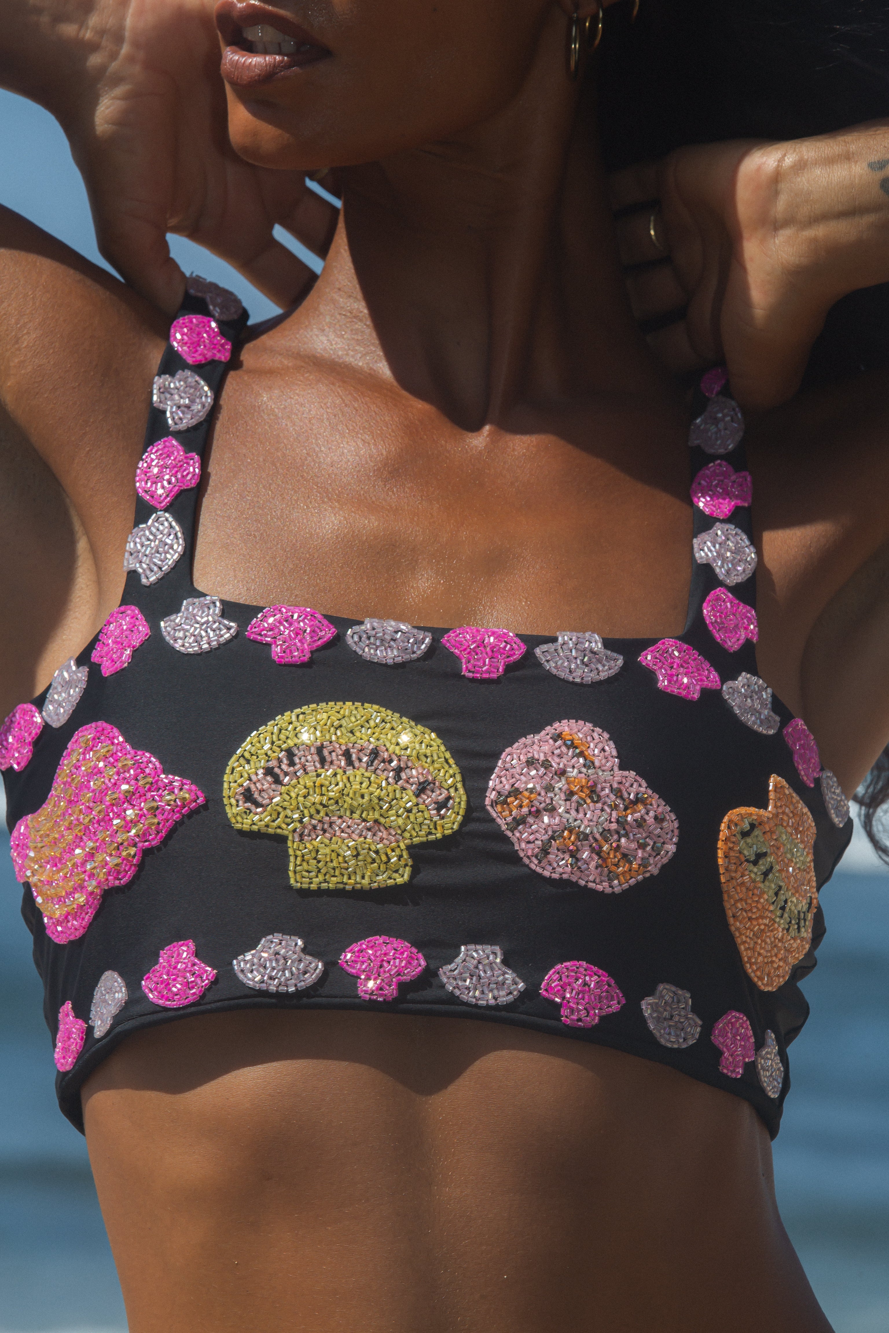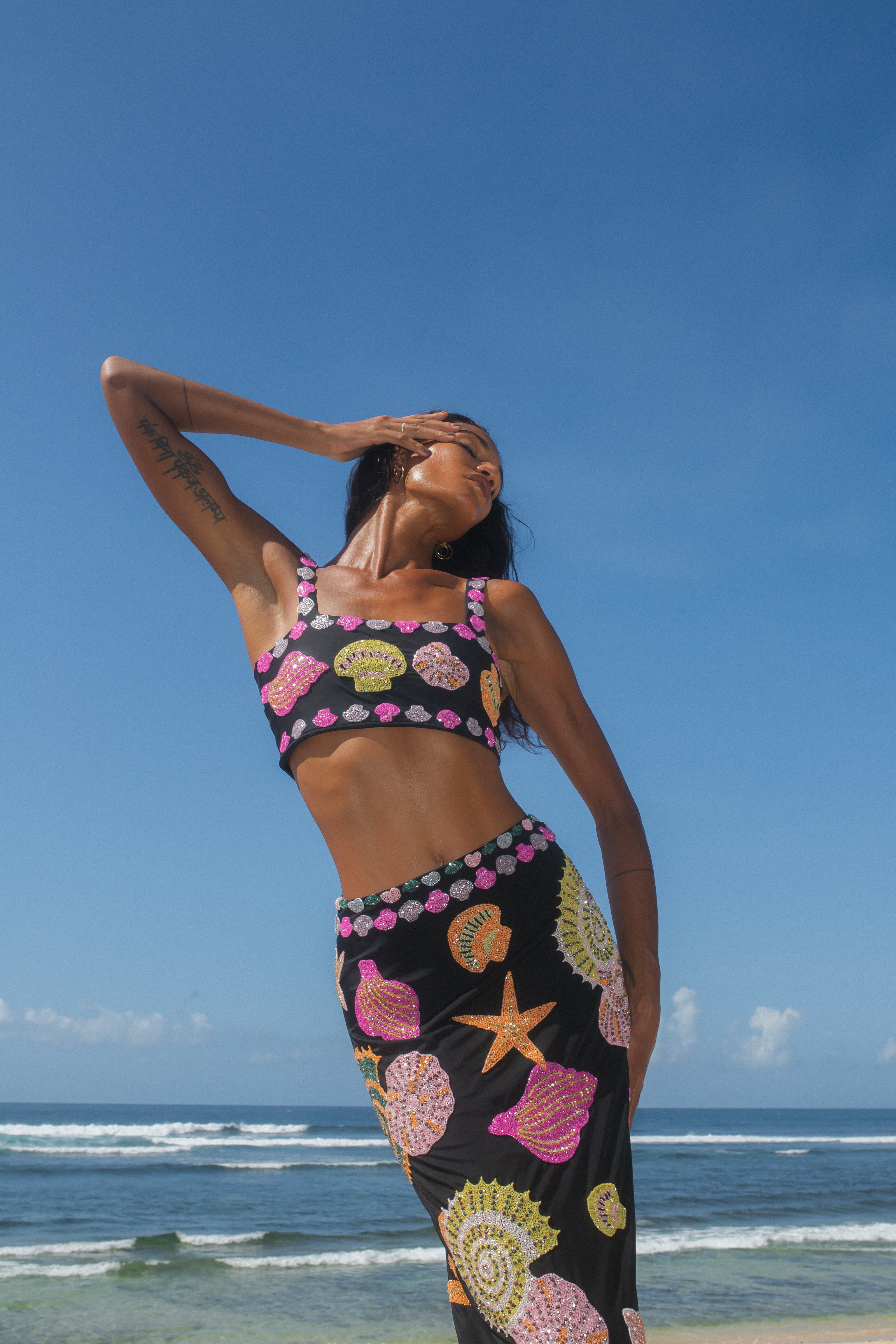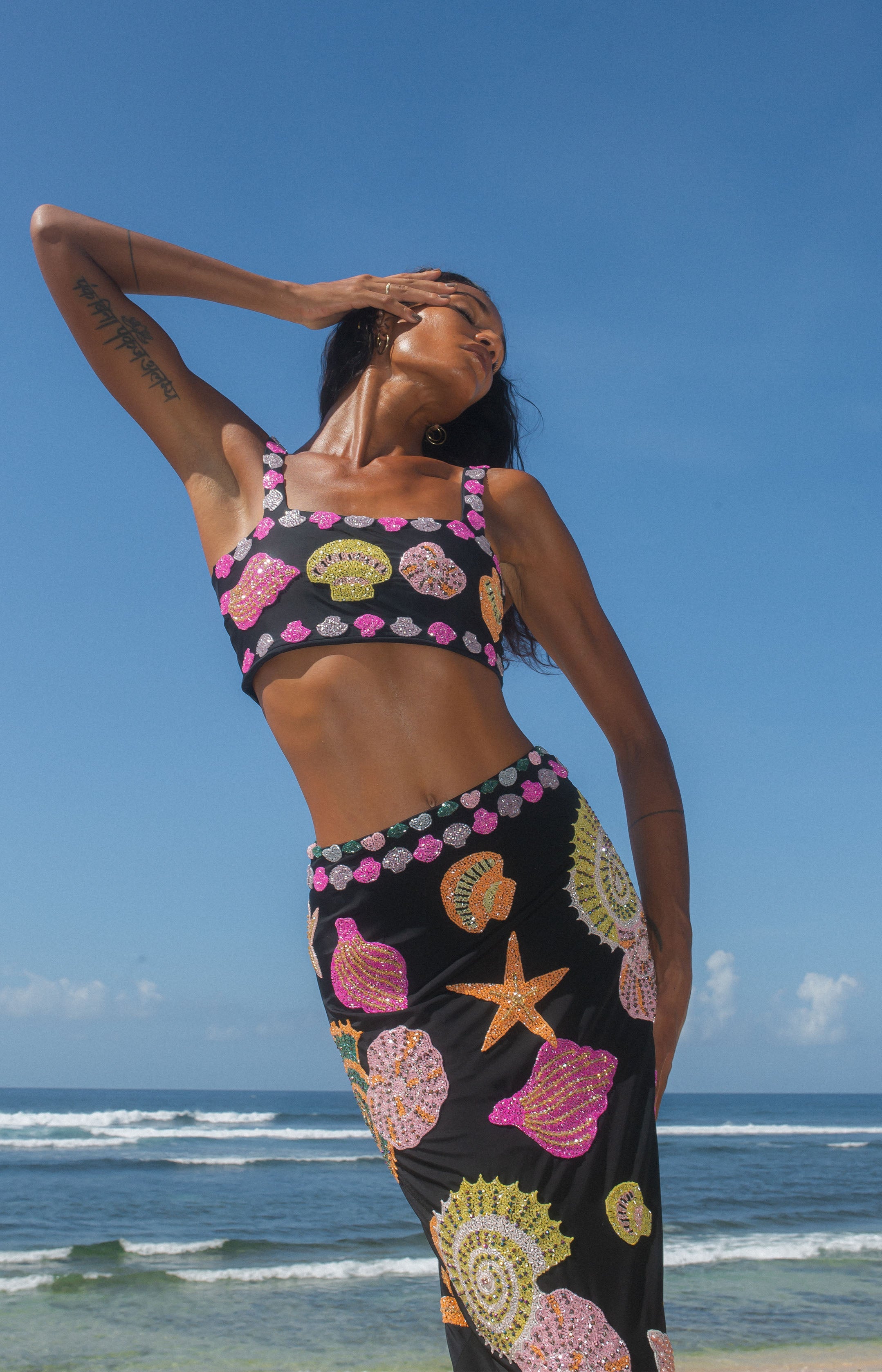 Each piece is entirely hand-embroidered with crystals and features our sea life inspired motifs.