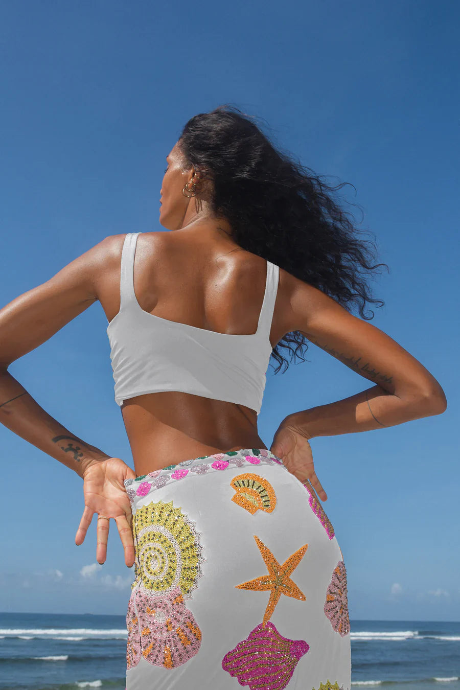The New York Hand-Embroidered Crop Top is a luxury artisan piece featuring intricate crystal embroidery inspired by sea life motifs. Made from eco-friendly power mesh, this statement top is handcrafted by skilled artisans, taking a full day to complete. Perfect for resort wear, festivals, and elevated summer outfits, it pairs beautifully with matching skirts for a co-ord look or styled solo for luxury vacation fashion.